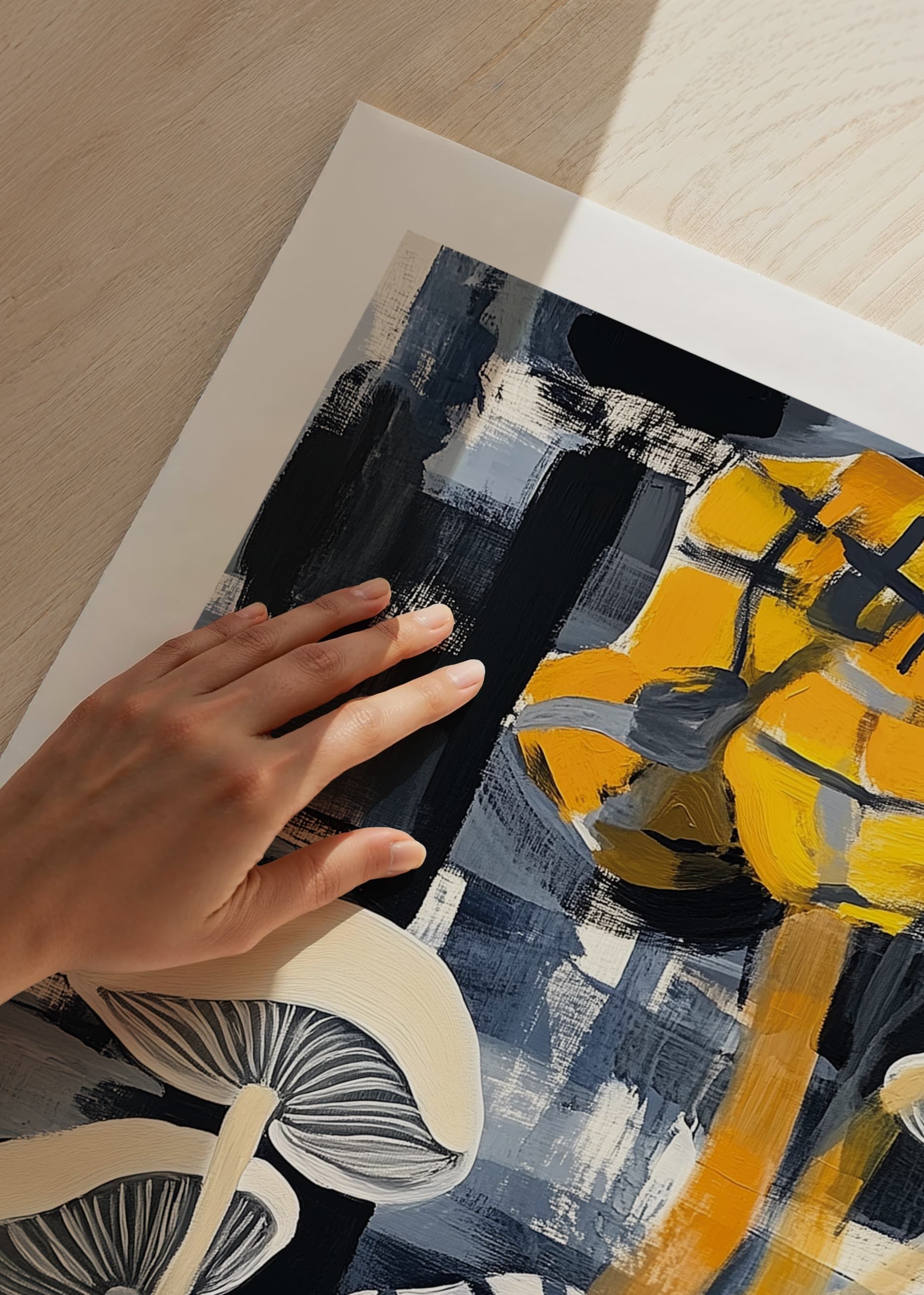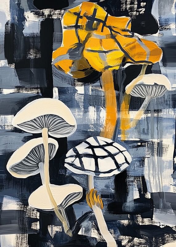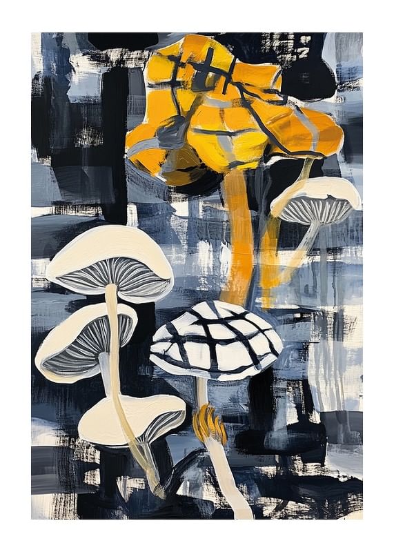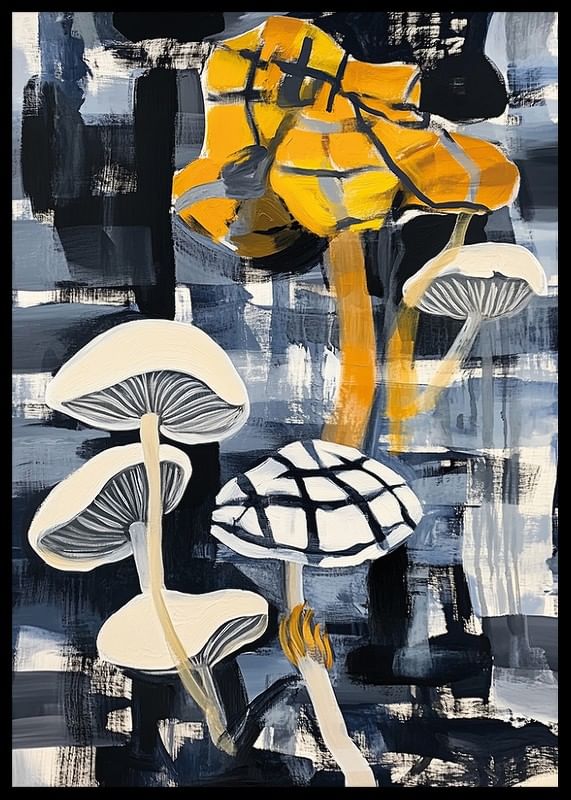 Denna poster lockar med sin dynamiska skildring av svampar i en värld av kontrasterande färger och former. De djärva penseldragen och dämpade toner skapar en fascinerande urban naturvision.