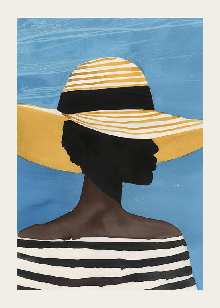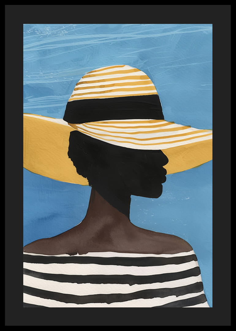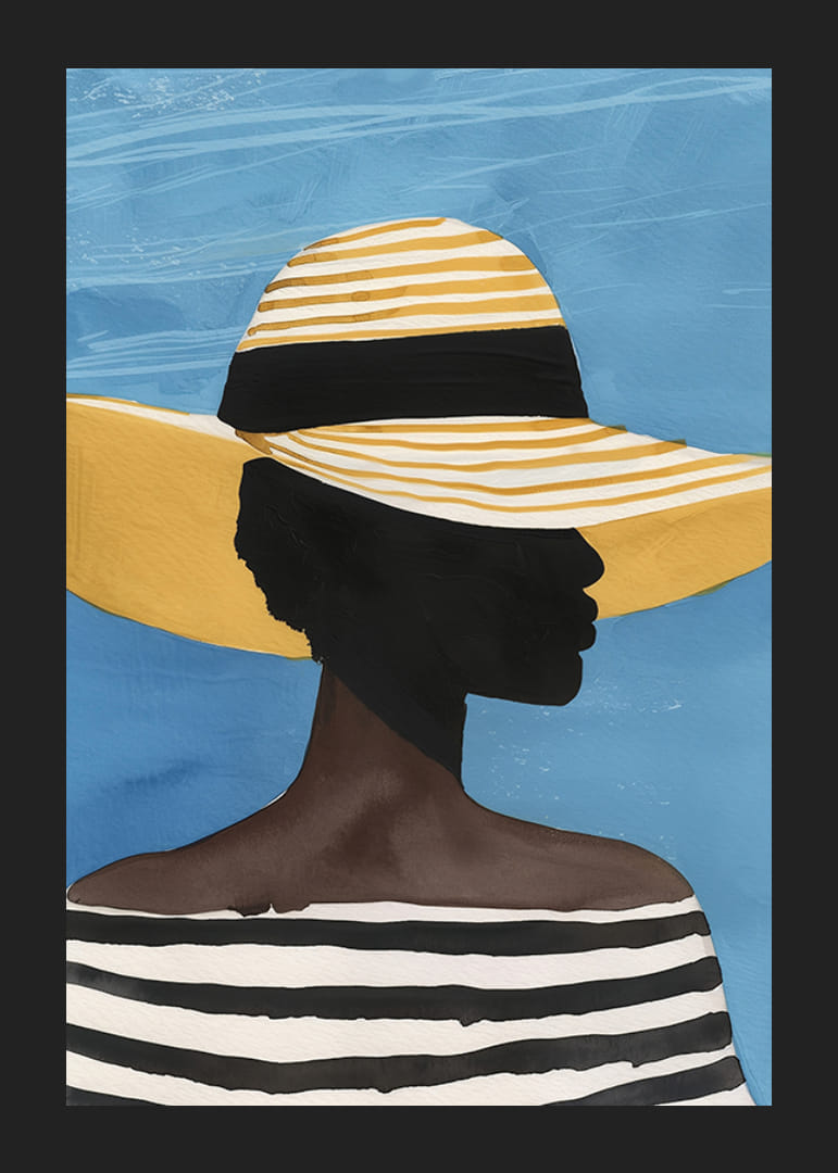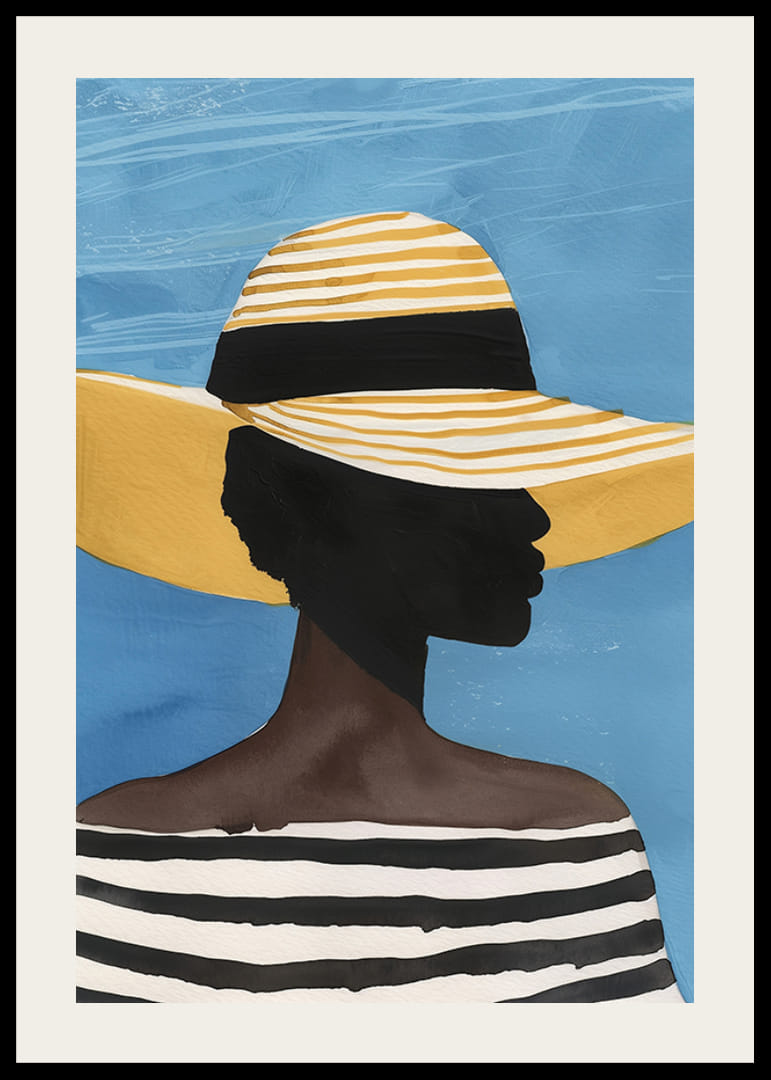 Denna fantastiska poster fångar ögat med sin sofistikerade silhuett mot en klarblå himmel. Den uttrycksfulla figuren, iklädd en randig topp och bredbrättad hatt, utstrålar sommarens skönhet och elegans.