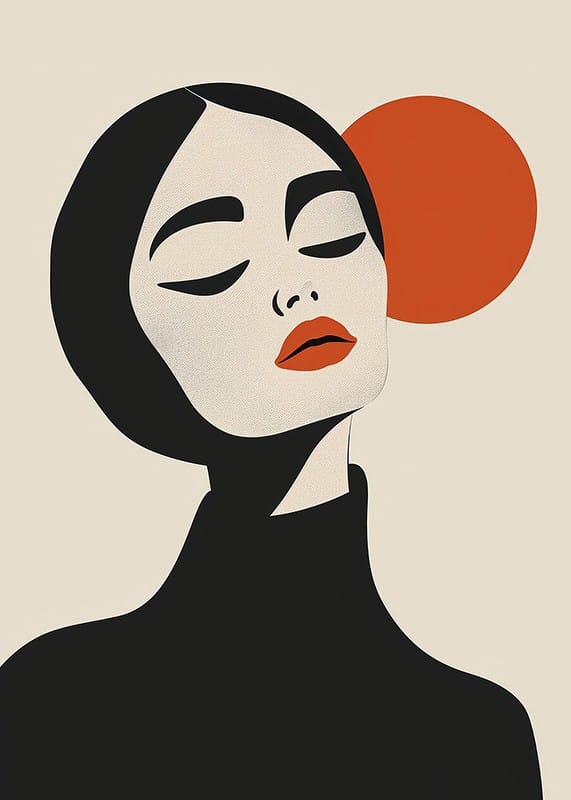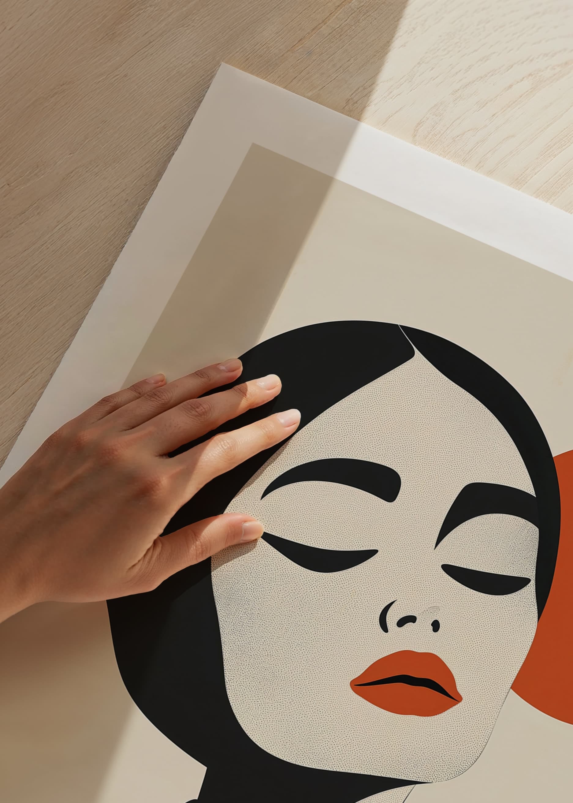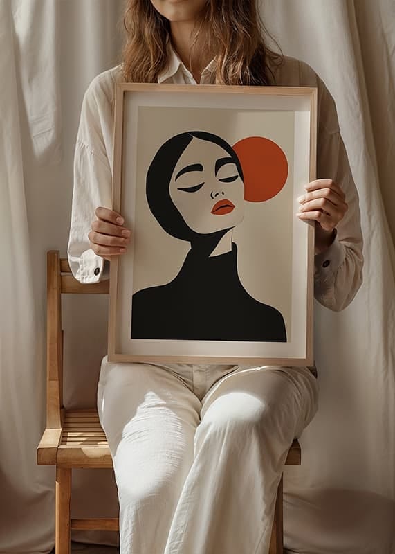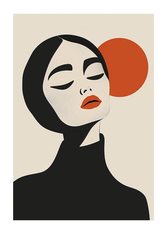 Denna poster fångar din uppmärksamhet med sitt stilrena porträtt av en kvinna, omsluten av djärva svarta linjer och en slående orange cirkel som tycks sväva bakom henne. Den minimalistiska designen och den subtila kontrasten mellan färger skapar en känsla av mystik och elegans.