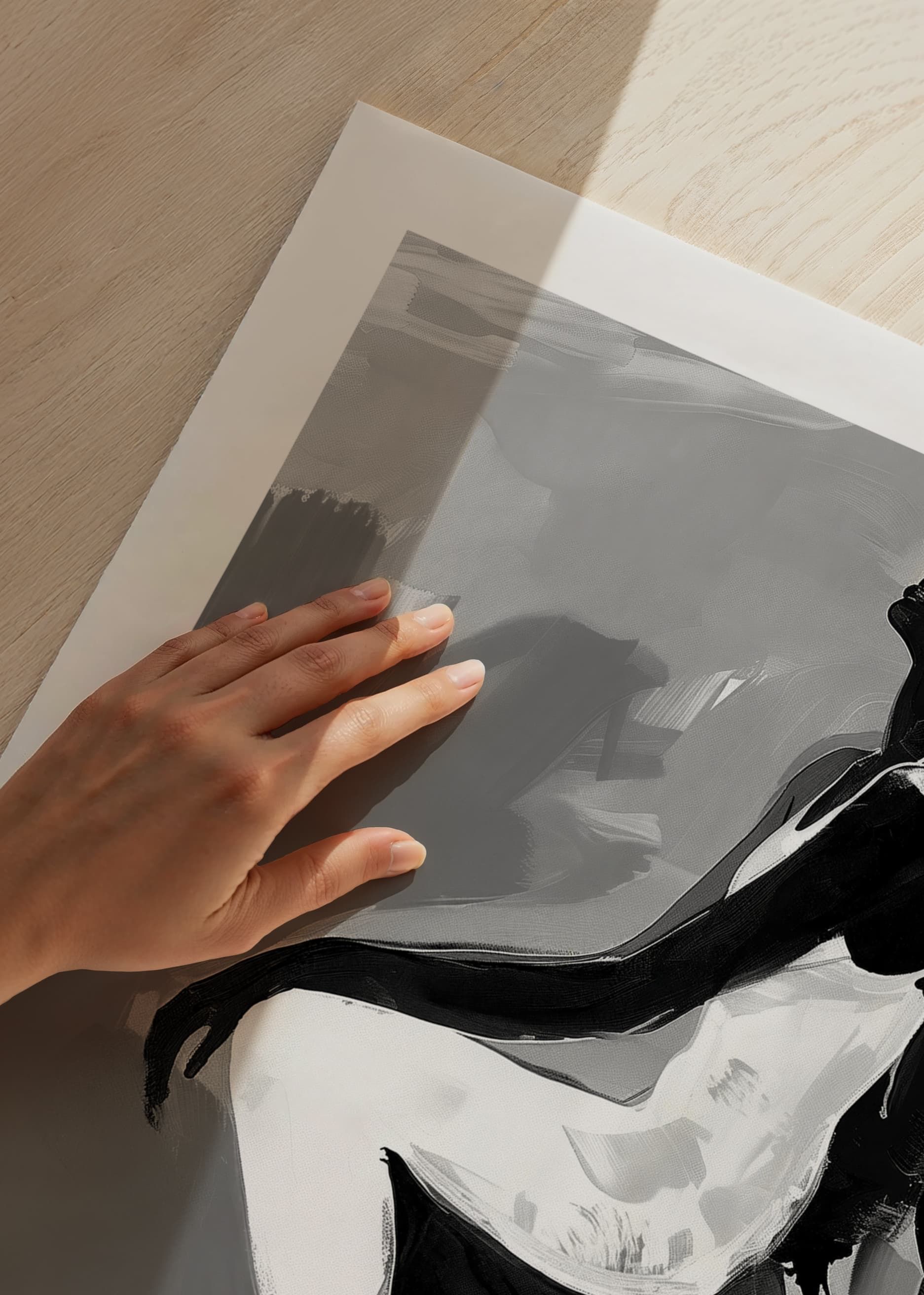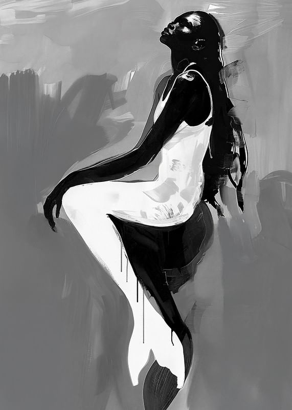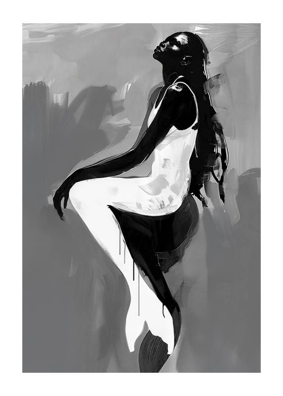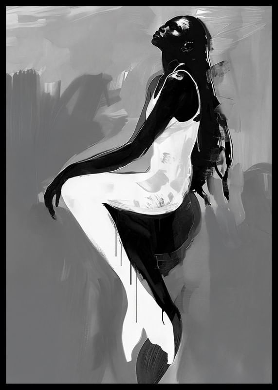 Denna poster fångar en elegant silhuett av en person i en rofylld pose mot en dämpad grå bakgrund. Med sina rena linjer och kontrasterande färger skapar den en känsla av tidlös skönhet och harmoni.