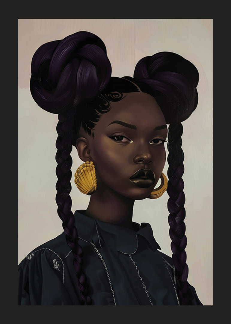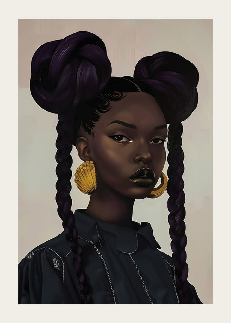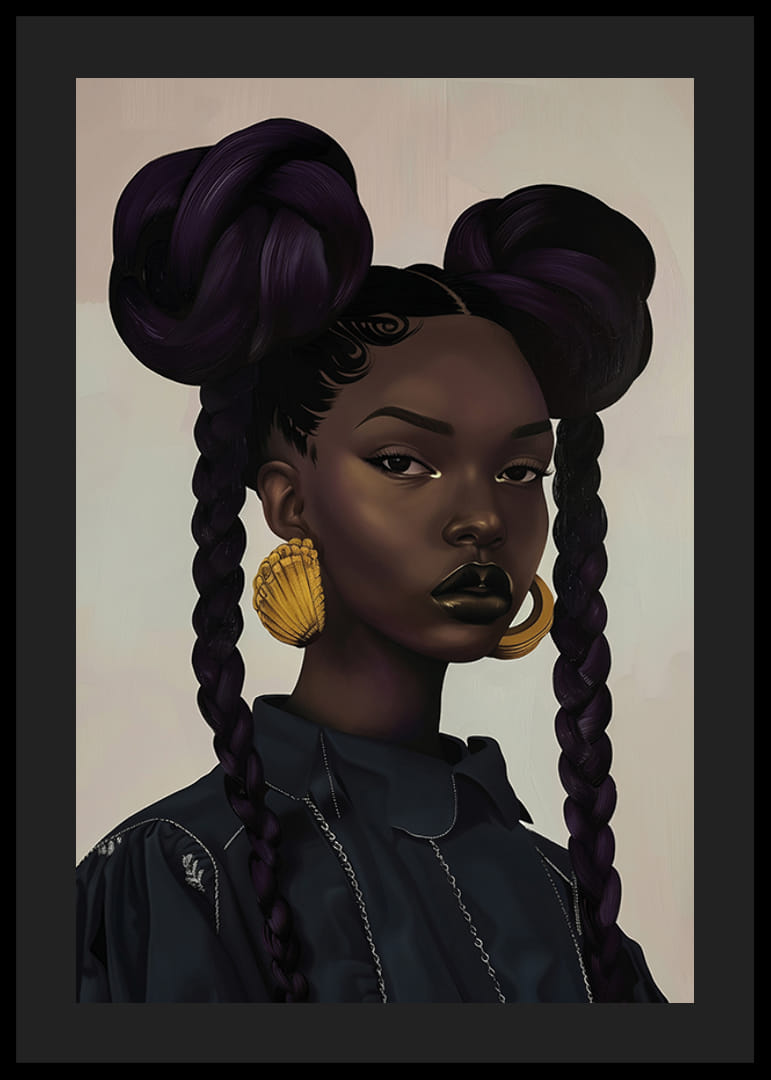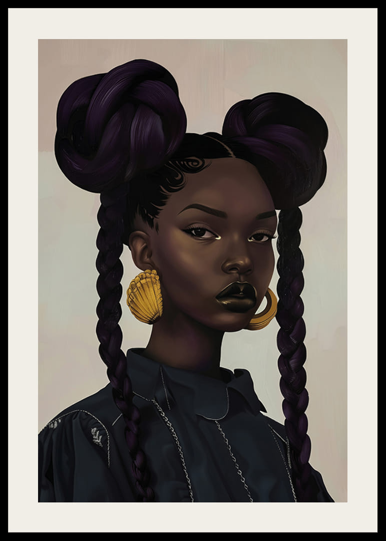 Denna poster fångar omedelbart betraktarens uppmärksamhet med sitt eleganta porträtt. De djupa tonerna i håret kombinerat med de gyllene örhängena skapar en harmonisk och majestätisk känsla. Det subtila uttrycket förstärker posterens unika charm.