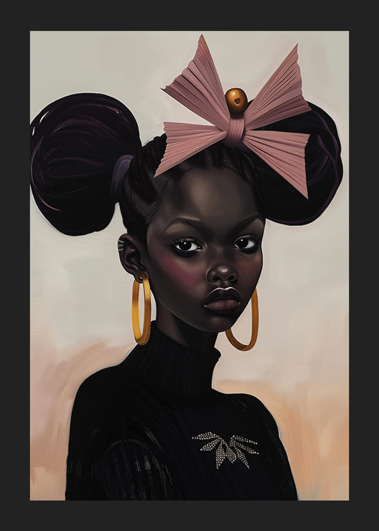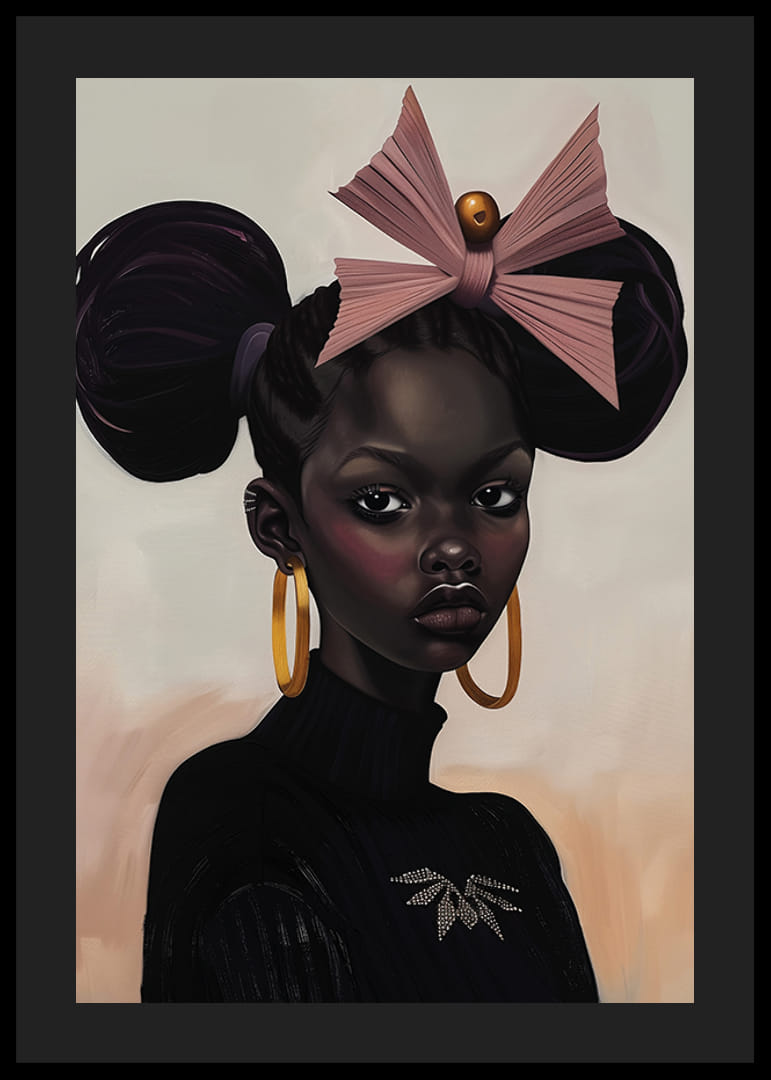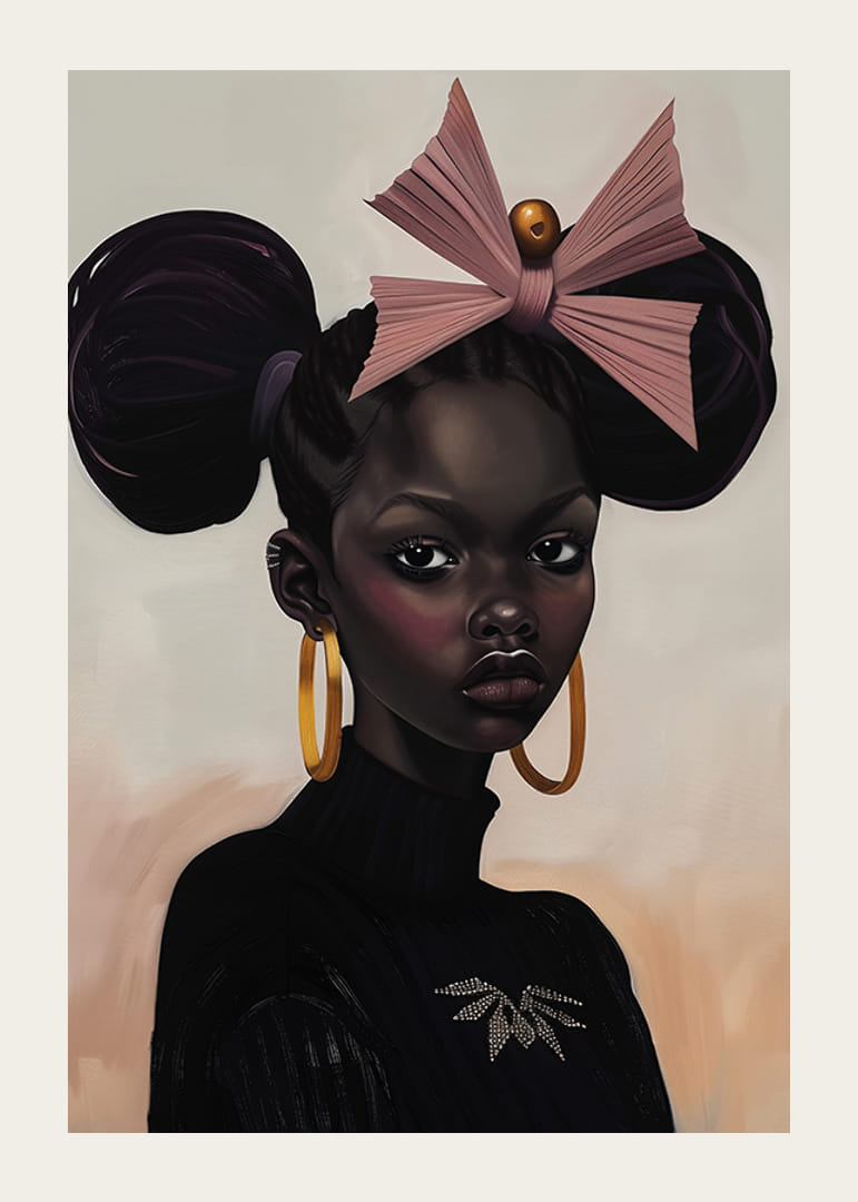 Denna poster bjuder på ett elegant porträtt där djärva detaljer som de stora guldringarna och den karakteristiska, rosafärgade rosetten harmonierar med mjuka, subtila färgtoner i bakgrunden.