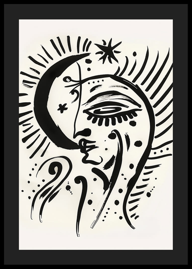 Den här postern fångar omedelbart uppmärksamheten med sin drömlika avbildning av månen och stjärnorna i en fängslande visuell symfoni. Den grafiska, svartvita stilen framhäver symbolerna och ger ett mystiskt inslag.
