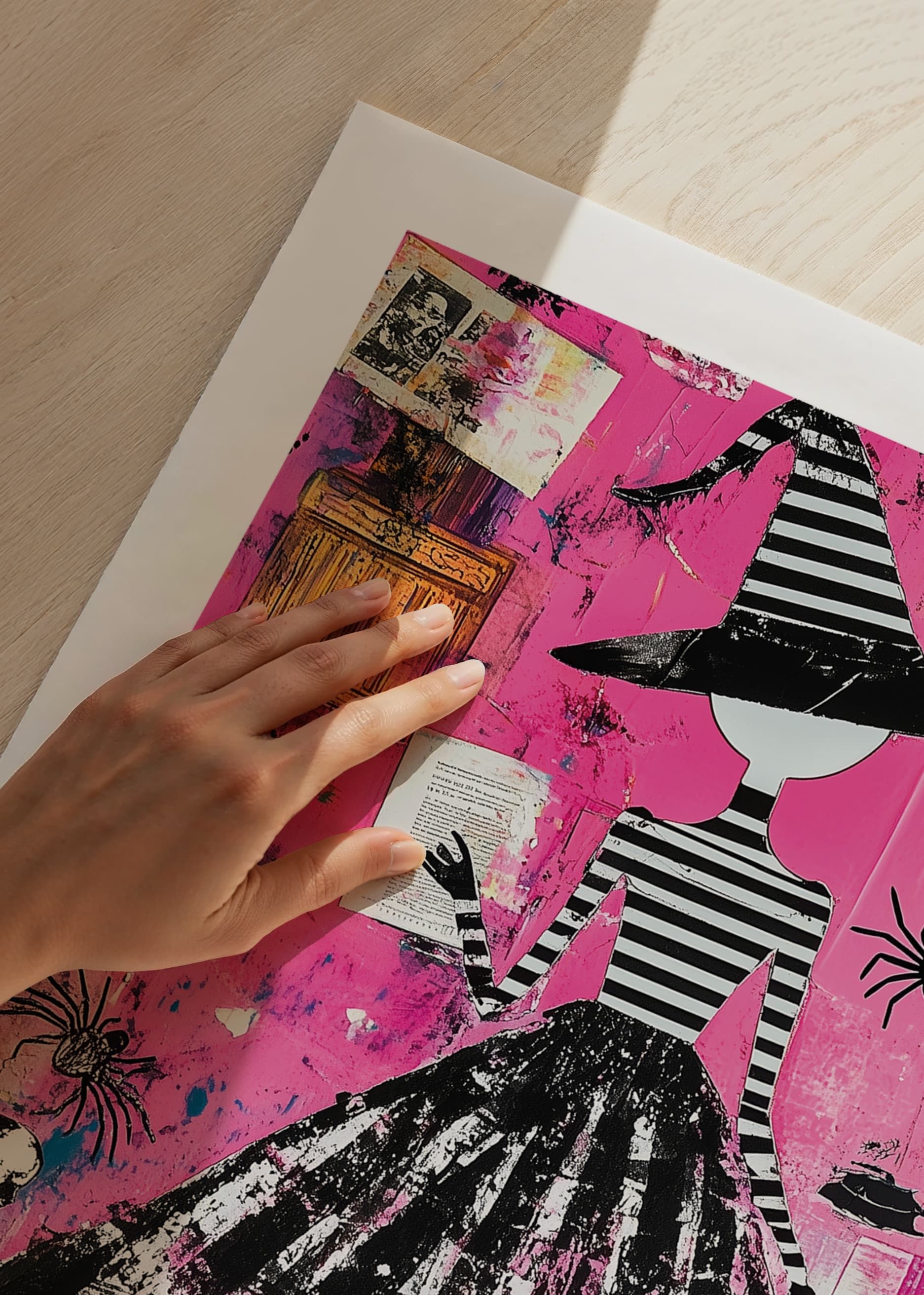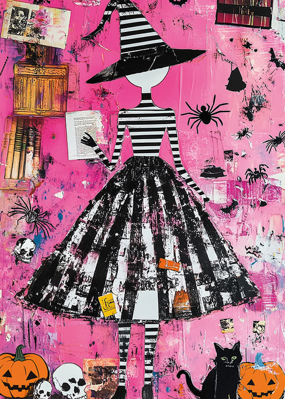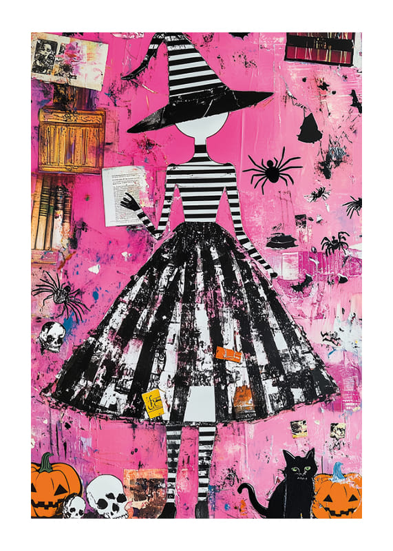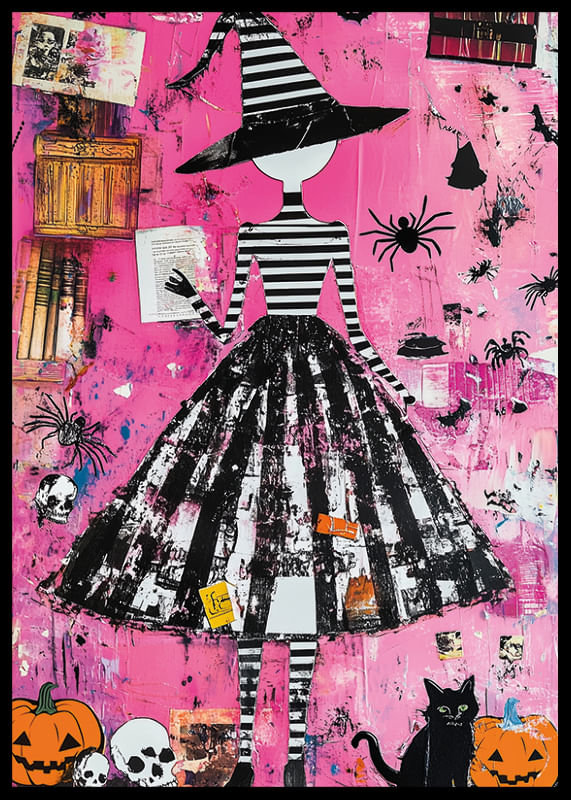 Denna poster fångar uppmärksamheten med sin livliga rosa bakgrund där en elegant häxa i svartvitrandig klänning blir central. Omringad av symboler som spindlar och pumpor, frammanar den en känsla av magisk mystik och Halloween-glädje.