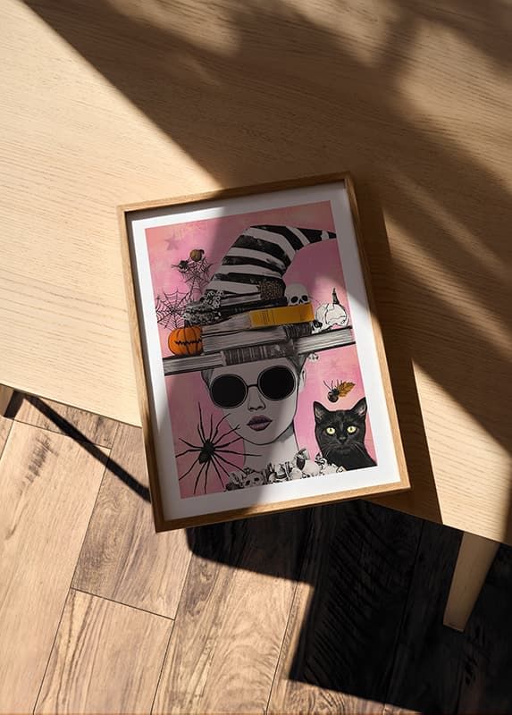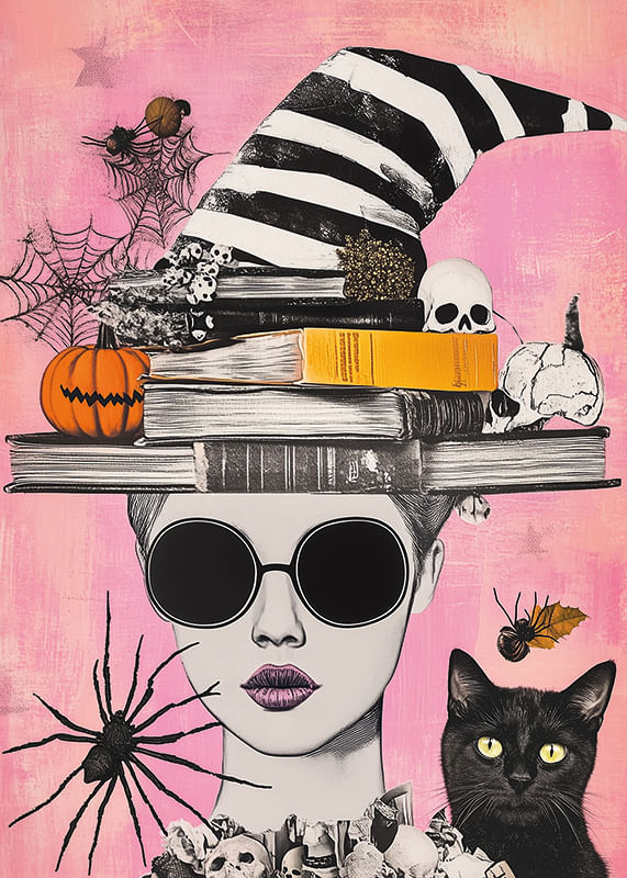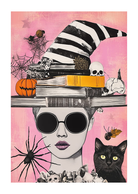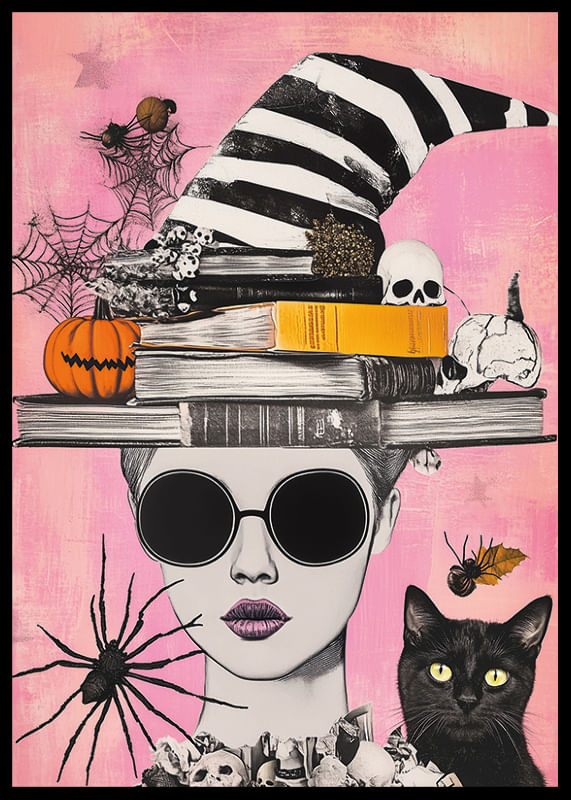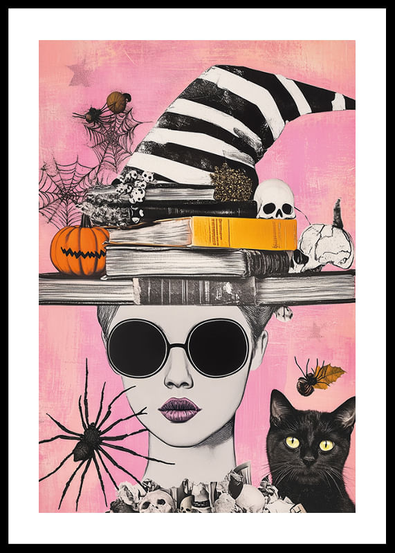 Denna poster fångar magin i Halloween med sin levande skildring av fantasifulla element. En skepnad i solglasögon pryds av böcker och en randig häxhatt, omgiven av pumpor, dödskallar och spindelnät.