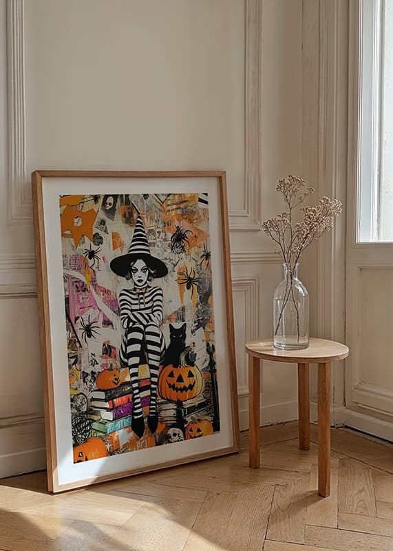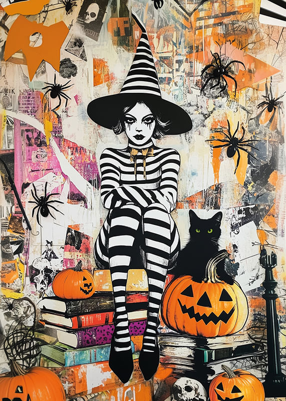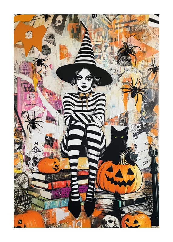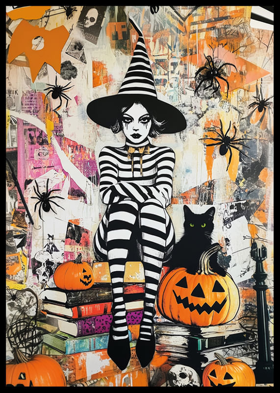 Denna poster fångar en mystisk häxa i svartvitt randigt, sittande bland staplade böcker och leende pumpor. Med en bakgrund av collage och svävande spindlar förmedlar den en kuslig men lekfull Halloween-känsla.