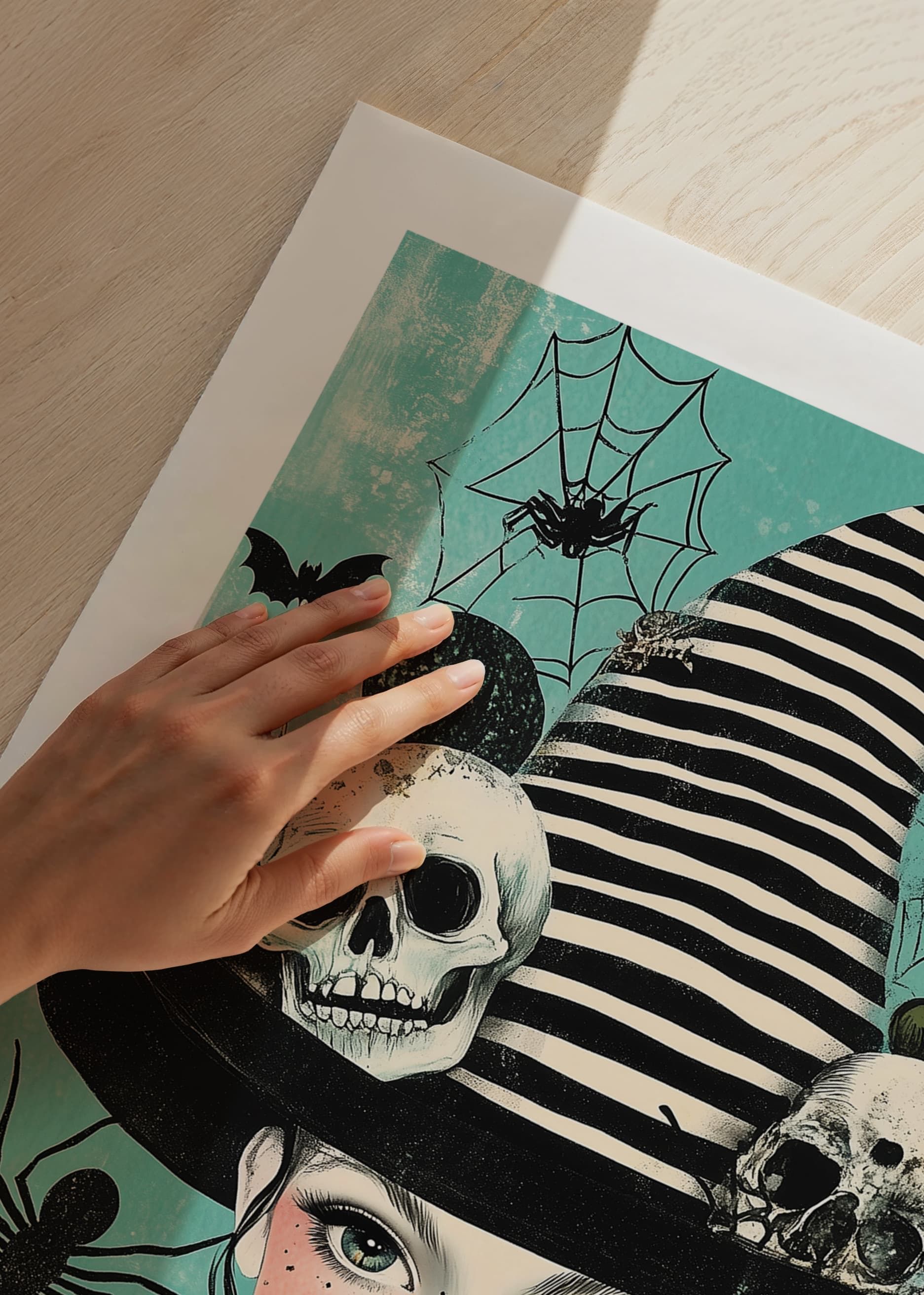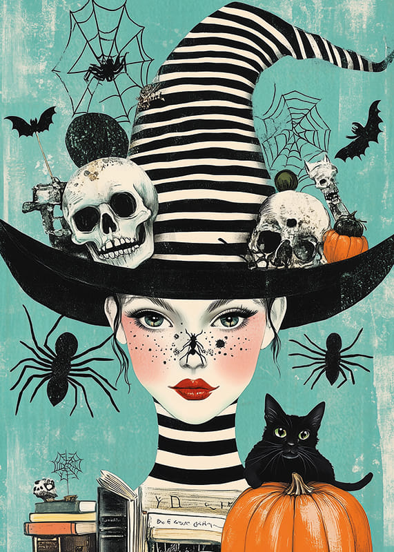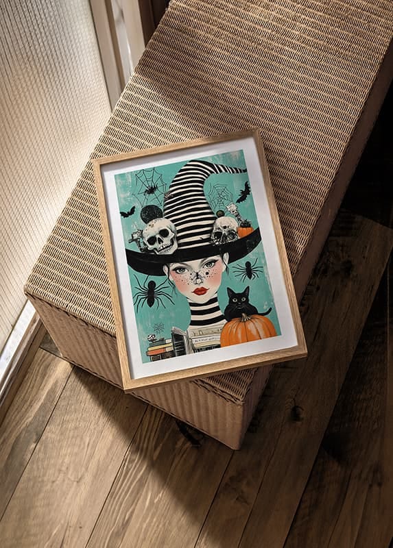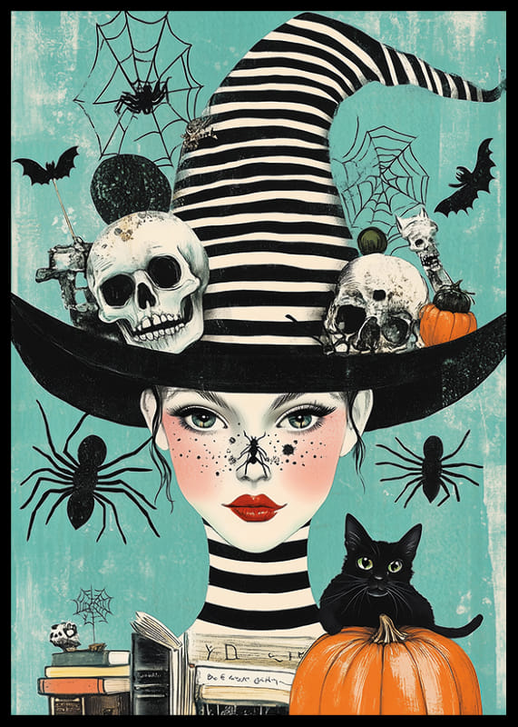 Denna poster fängslar med sin magiska avbildning av en stilfull häxa som bär en randig hatt dekorerad med dödskallar och pumpor. Hennes skarpa blick förenas med en svart katts mystiska närvaro, medan spindlar och fladdermöss svävar i bakgrunden.