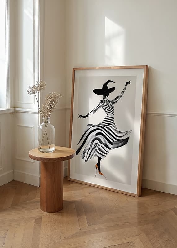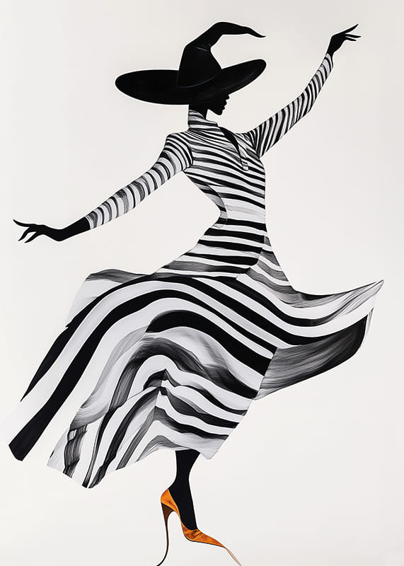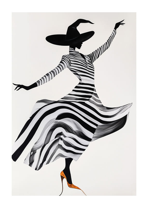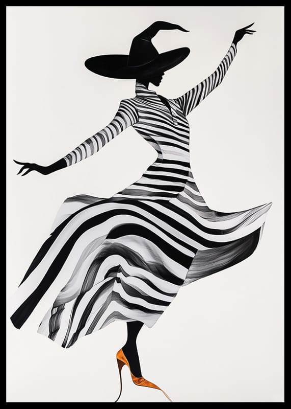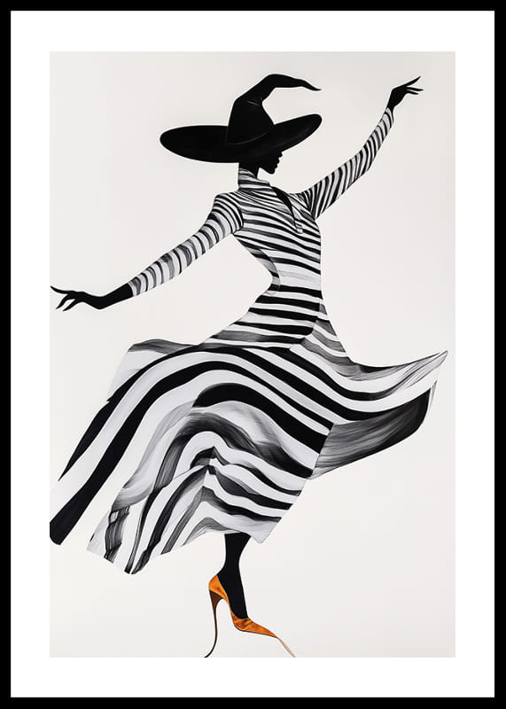 Postern fångar en dansande siluett i en fascinerande blandning av vita och svarta ränder, vilket skapar en hypnotisk effekt. Den flödande klänningen och den dramatiska hatten adderar en känsla av mystik och elegans.