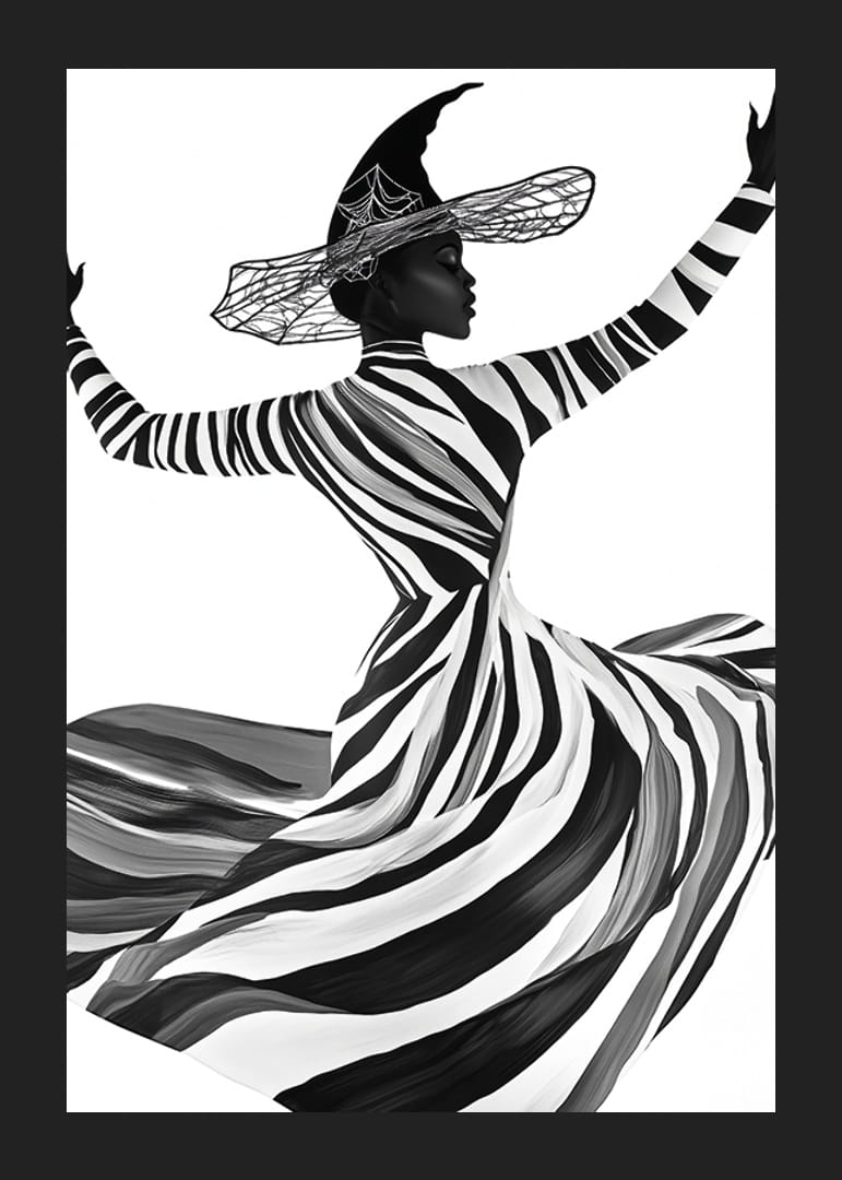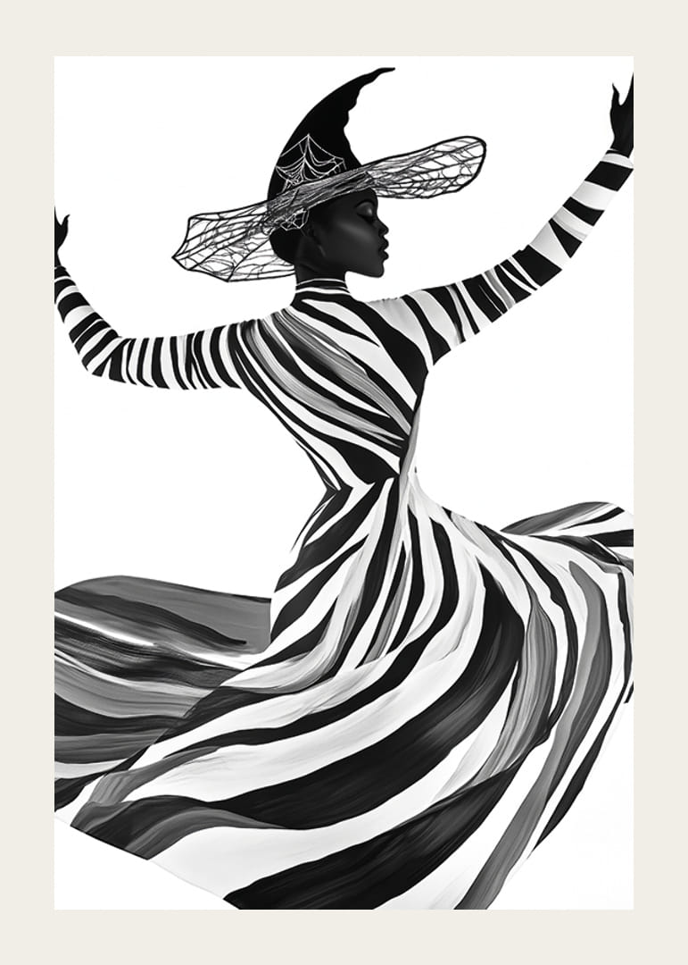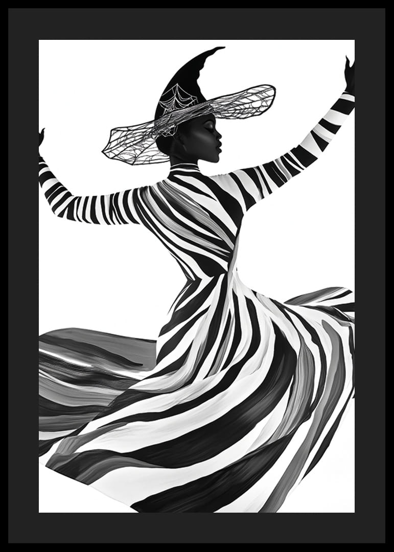 Denna poster fångar ögat med en hypnotisk dans av ränder där svart och vitt smälter samman i en elegant virvel. Hatten med spindelvävsmönstret tillför en mystisk charm som inspirerar fantasin.