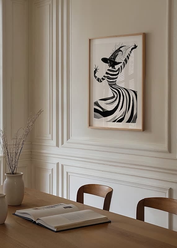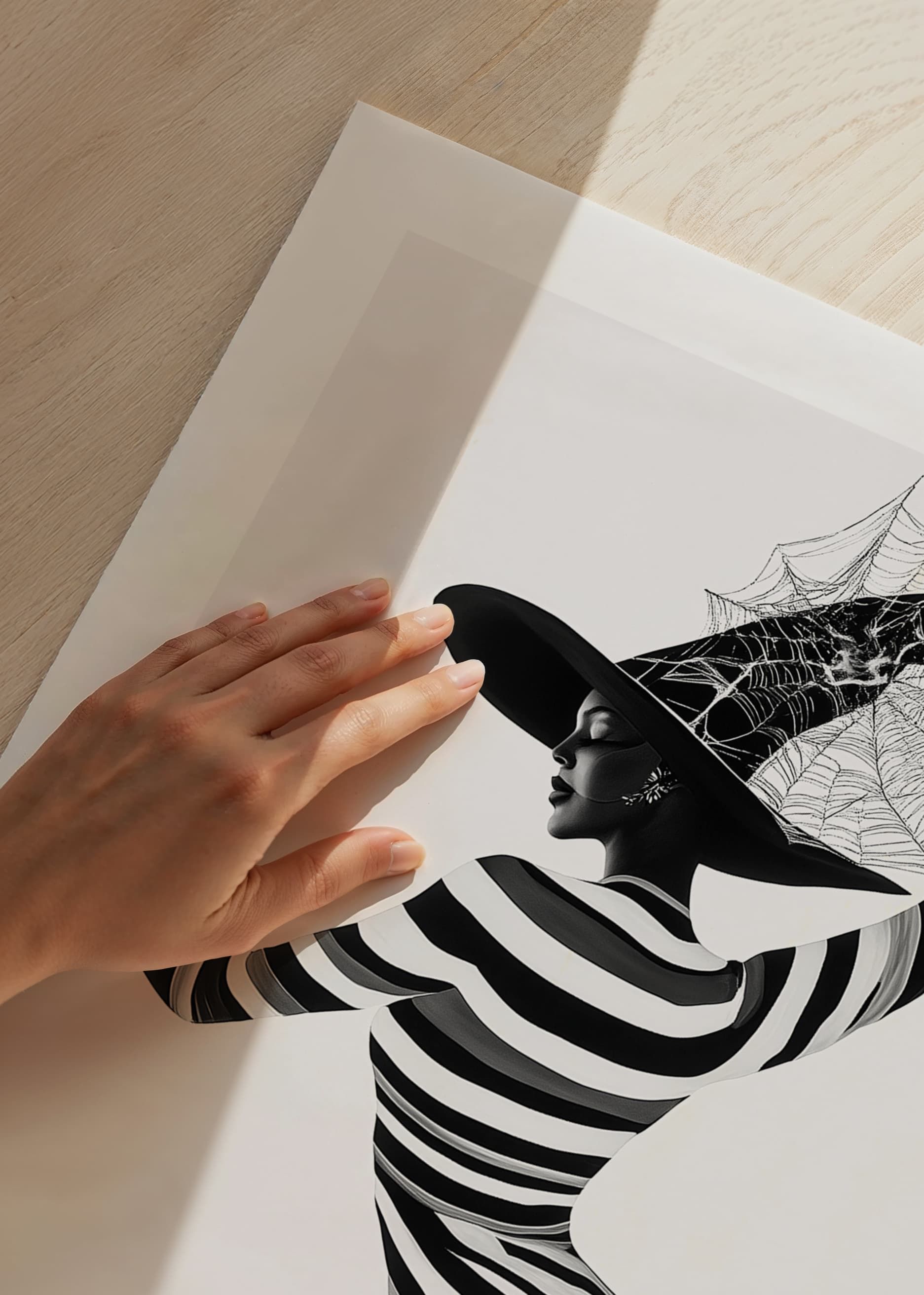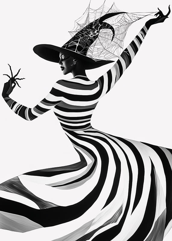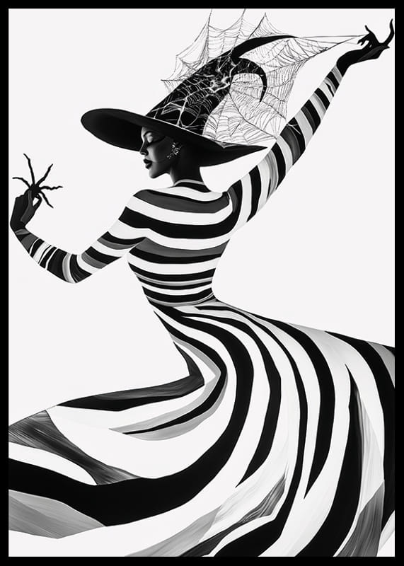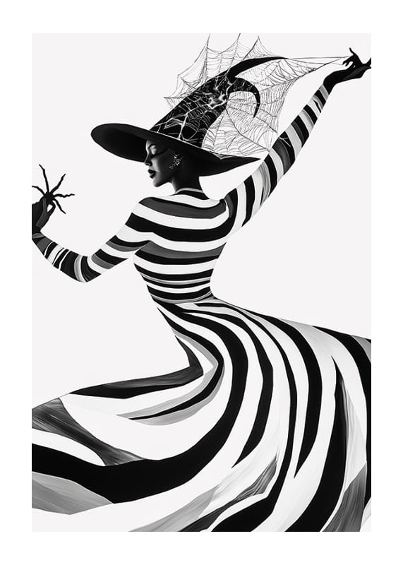 Denna poster fångar ögat med en elegant, magisk figur klädd i böljande, svartvita ränder. Den trollbindande kompositionen, med en mäktig hatt prydd av ett skimrande spindelnät, skapar en känsla av mystik och förtrollning.