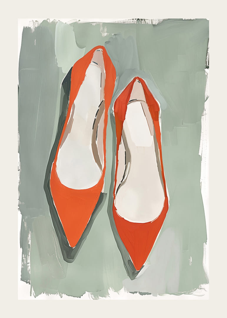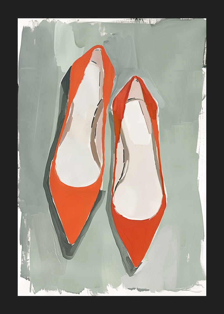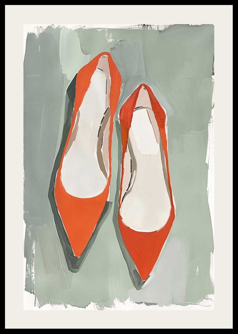 Låt denna poster bringa liv till ditt hem med sina livfulla röda skor mot en dämpad grön bakgrund. Den unika kombinationen av färger ger en känsla av elegant lekfullhet och stil. Skornas enkla men kraftfulla design gör dem till en perfekt accent för vilket rum som helst.