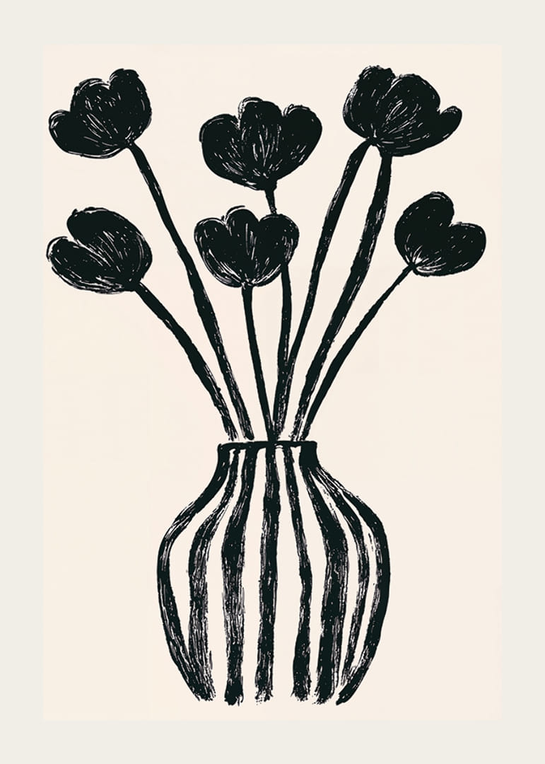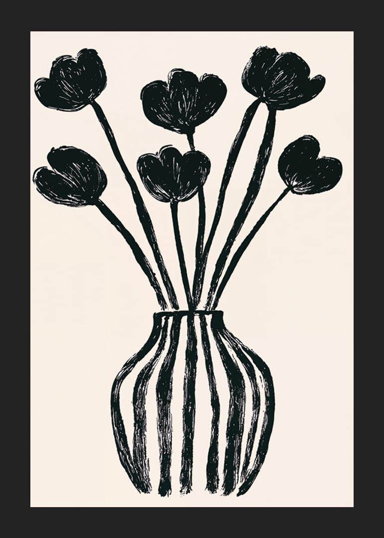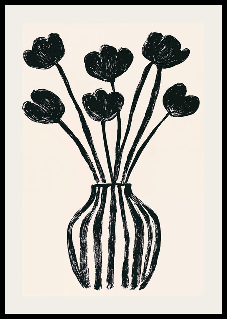 Denna poster fångar ögat med sina uttrycksfulla svarta tulpaner inneslutna i en stilren vas. Den minimalistiska designen ger en känsla av lugn och sofistikation. De starka kontrastfärgerna och de flytande linjerna skapar en fascinerande balans mellan enkelhet och elegans.