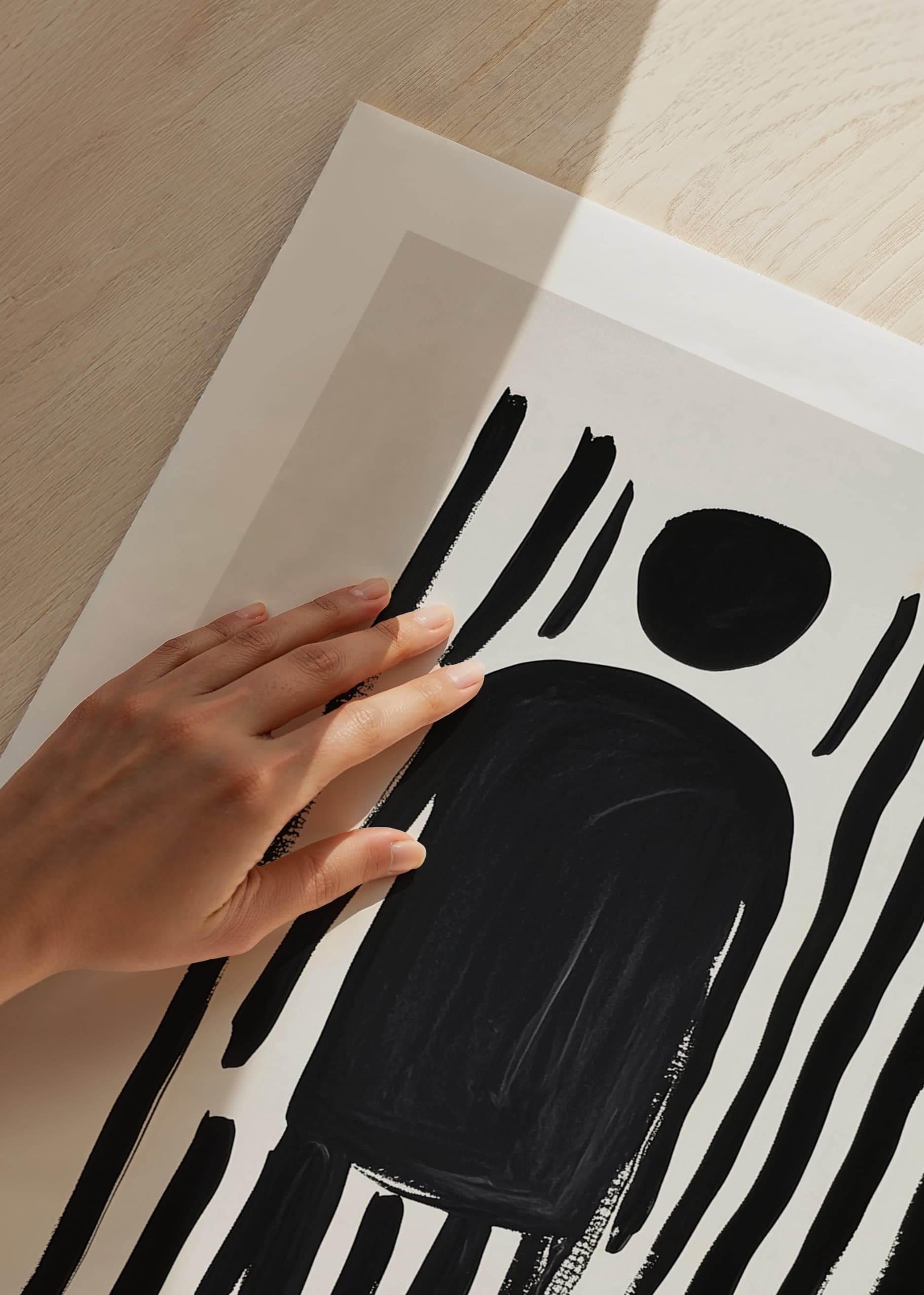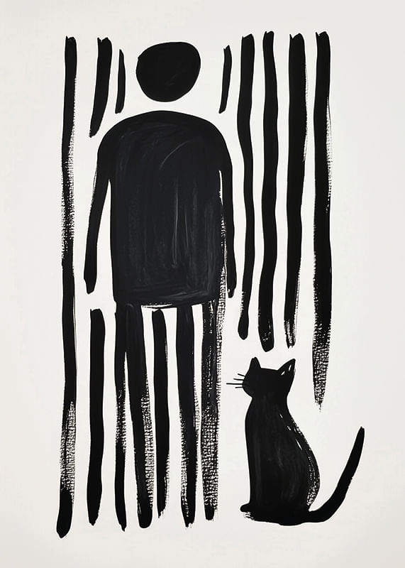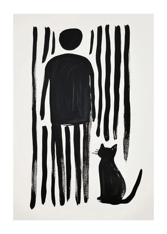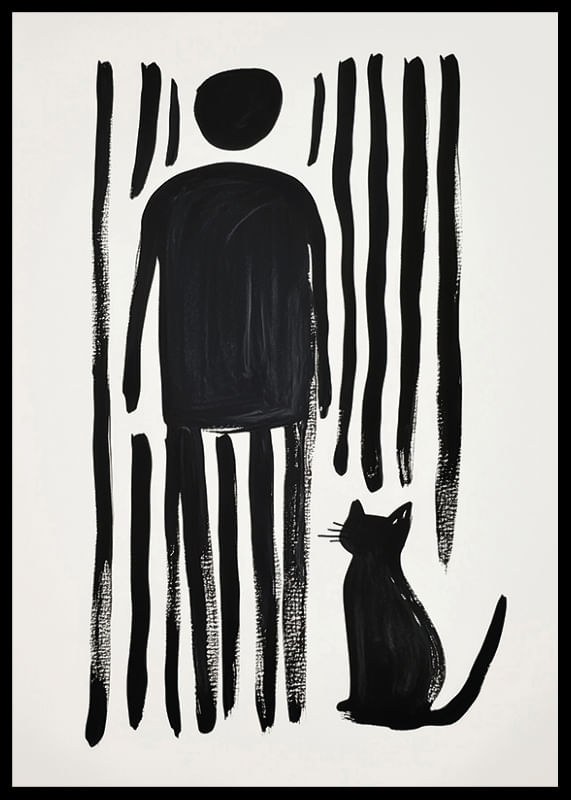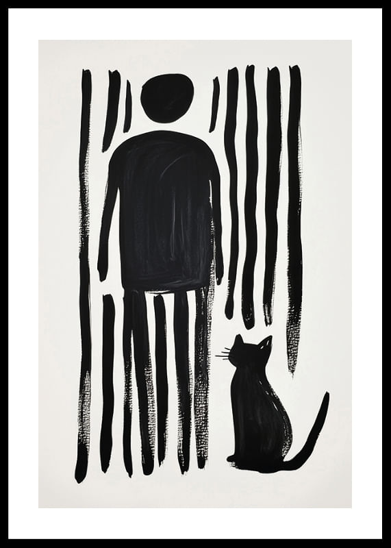 Denna poster fångar betraktarens uppmärksamhet med sin minimalistiska skildring av en person och en katt. De svarta siluetterna mot de svartvita ränderna skapar en känsla av kontrast och enkel skönhet.
