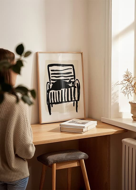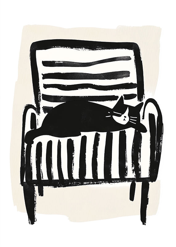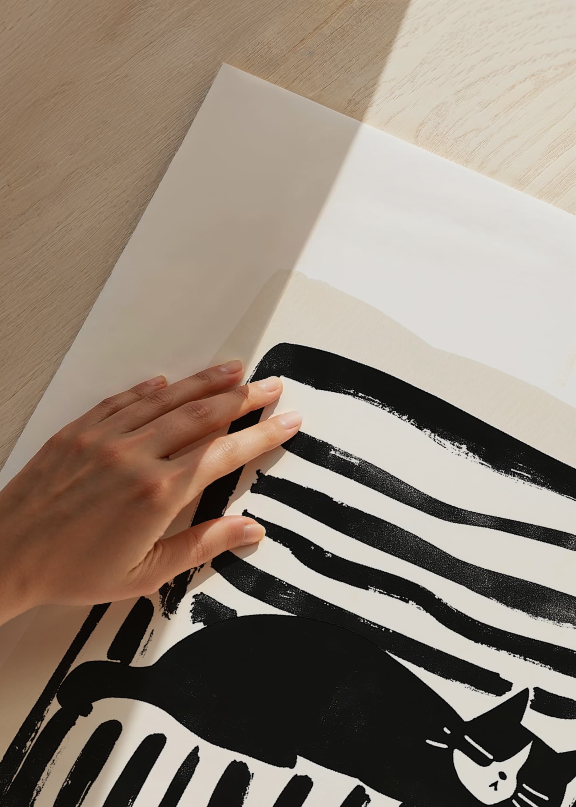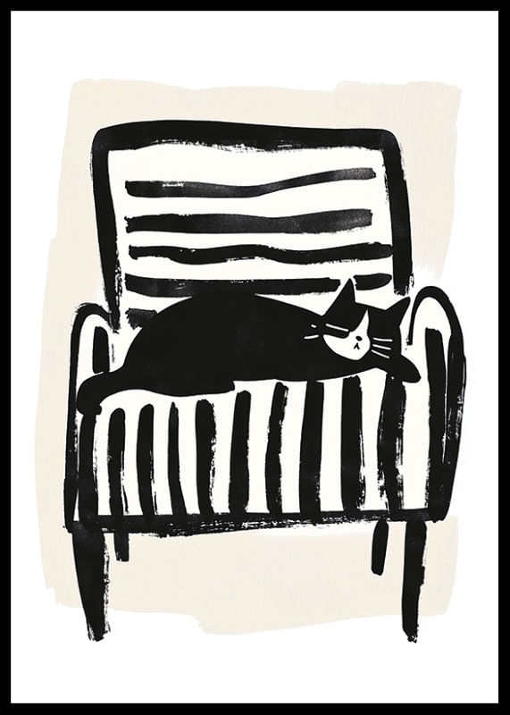 Denna poster fångar en zenliknande ro när en enkel katt sover bland svartvita ränder. Kontrasten mellan kattens lugna vita kontur och de djärva ränderna skapar en harmonisk och modern estetik. Posterns minimalistiska stil förmedlar lugn och balans.