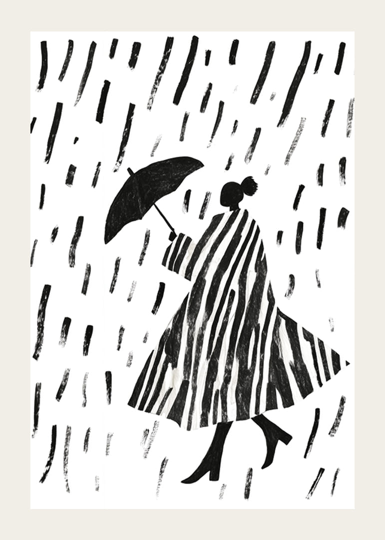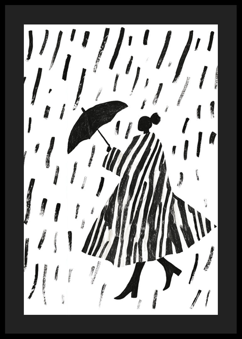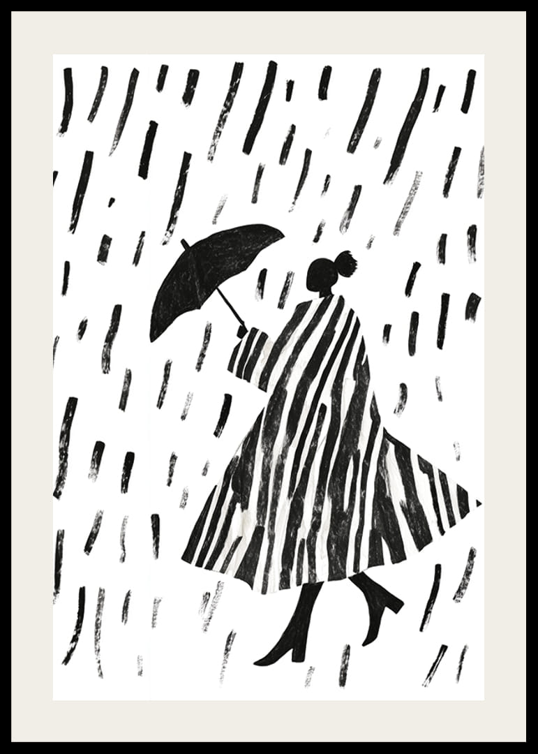Denna poster fångar den eleganta skönheten hos en silhuett som vandrar i regnet. De djärva, svartvita ränderna skapar ett hypnotiskt mönster som ger liv åt varje rum. Kombinationen av stiliga linjer och det enkla regnvädret ger postern en tidlös charm.