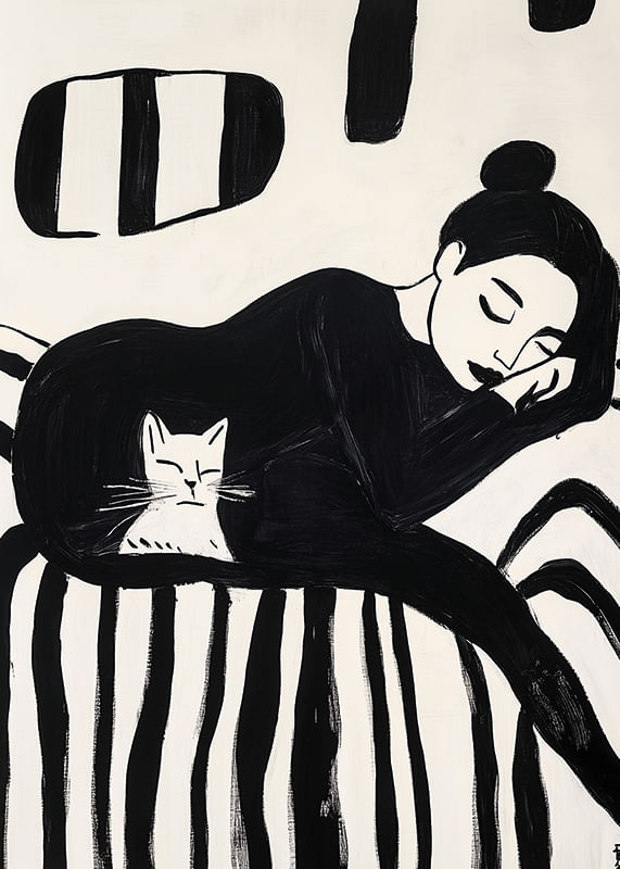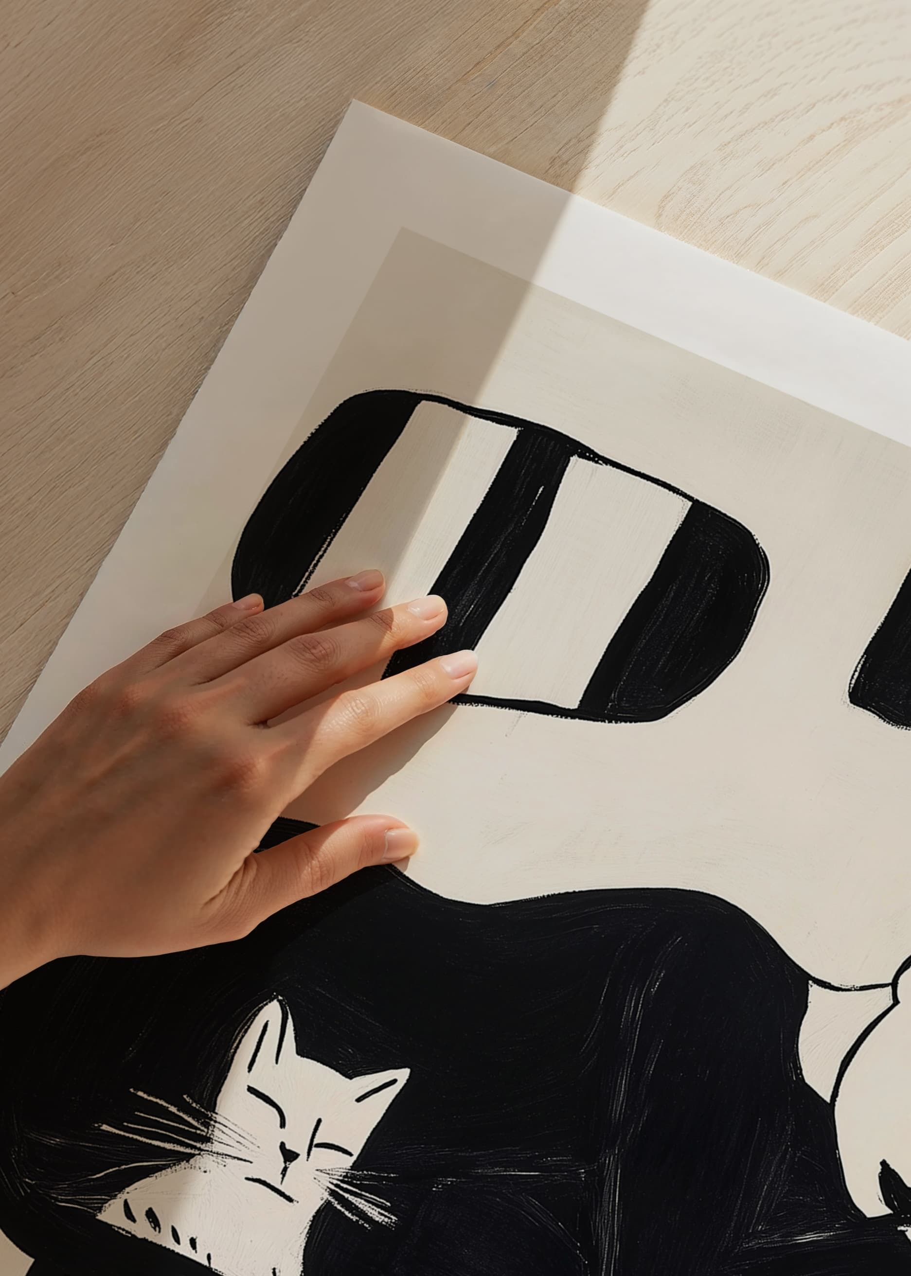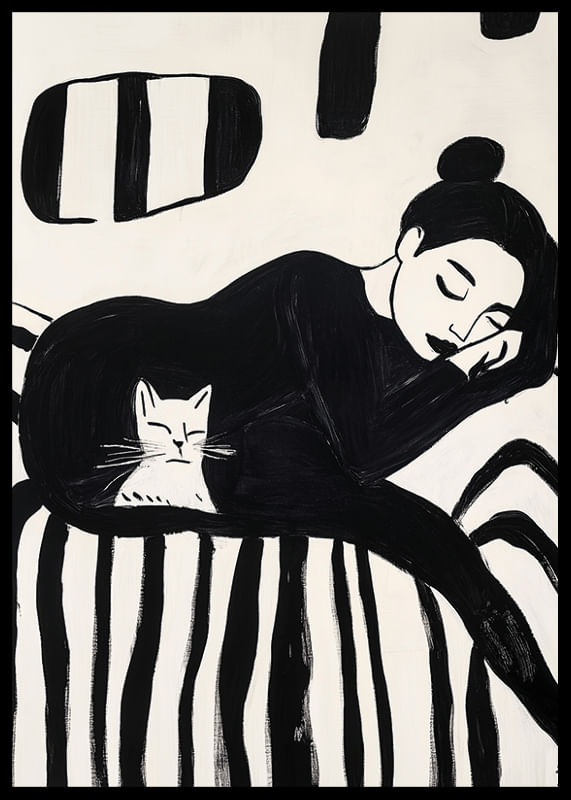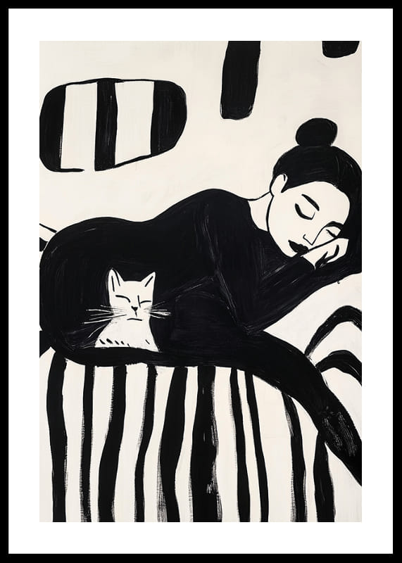 Postern fångar ögonblicket av lugn där en kvinna och hennes katt vilar tillsammans i enkel monokrom stil. De svartvita linjerna och formerna skapar en stillsam atmosfär som inbjuder till ro och reflektion.