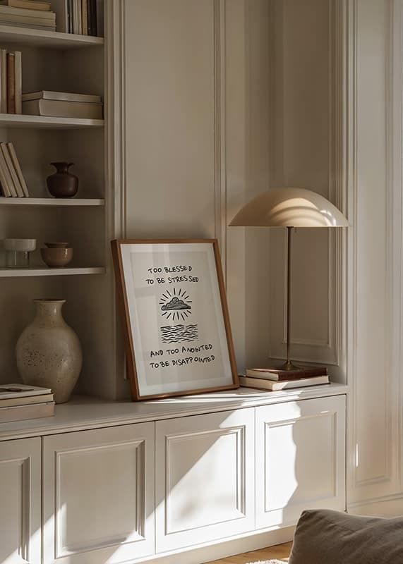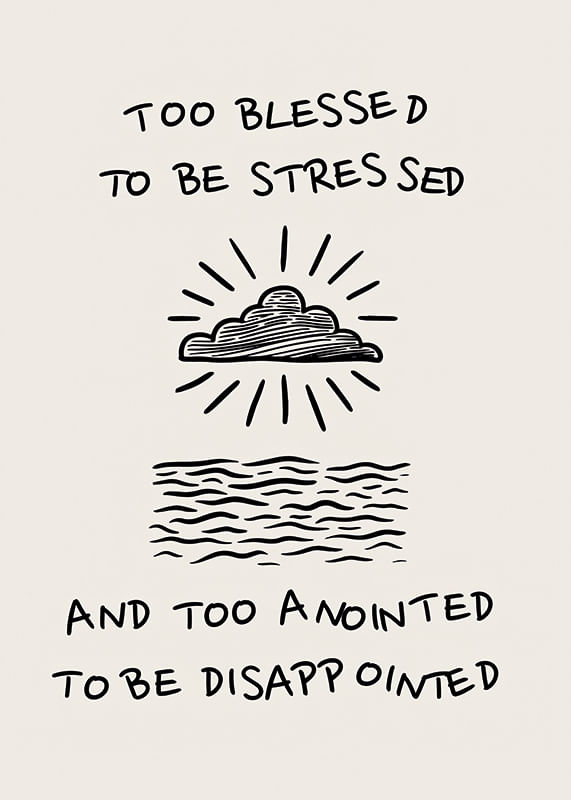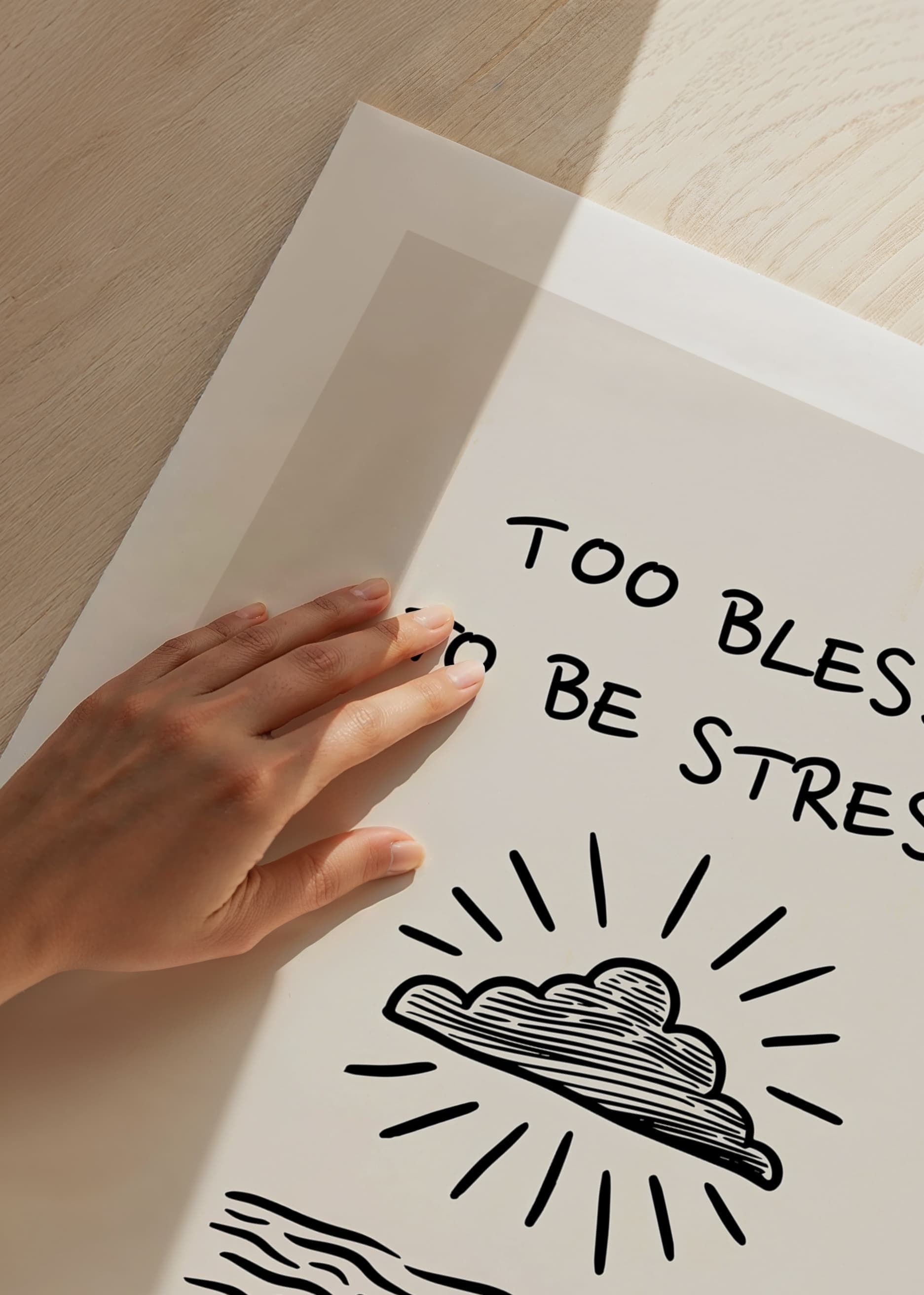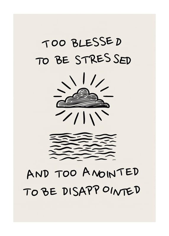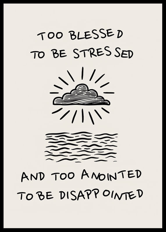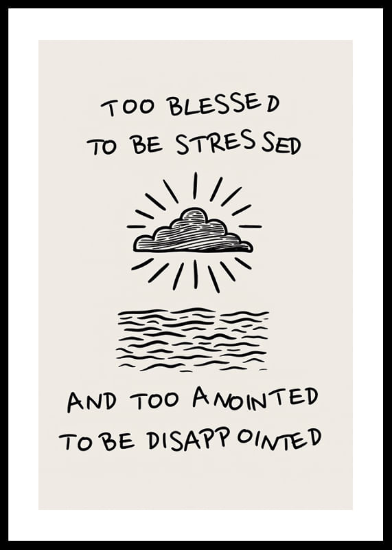 Denna inspirerande poster fångar essensen av lugn och hopp med en stilren illustration av moln och havsvågor. Texten "Too blessed to be stressed" bär en kraftfull påminnelse om att fokusera på det positiva i livet.