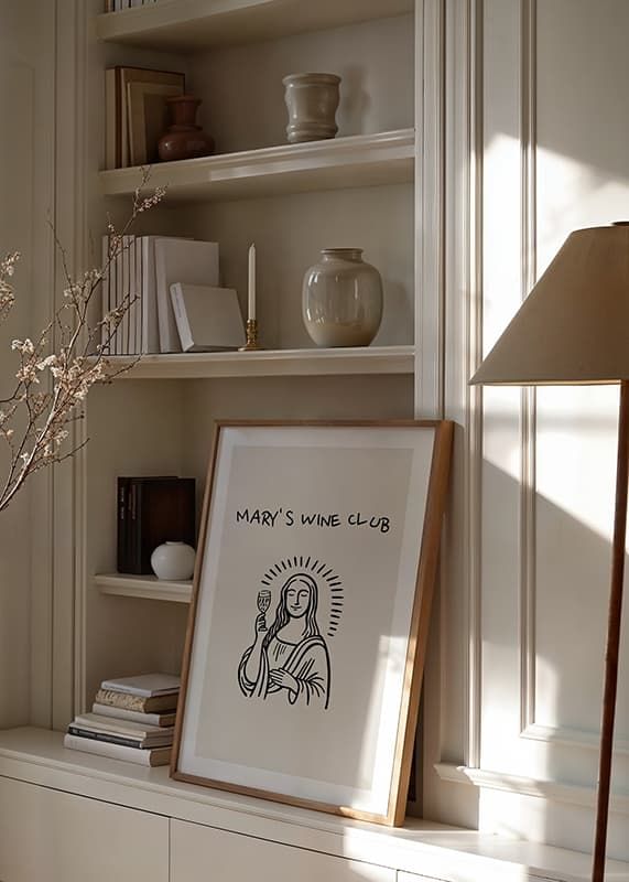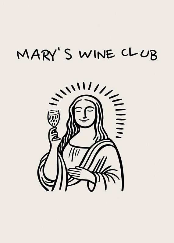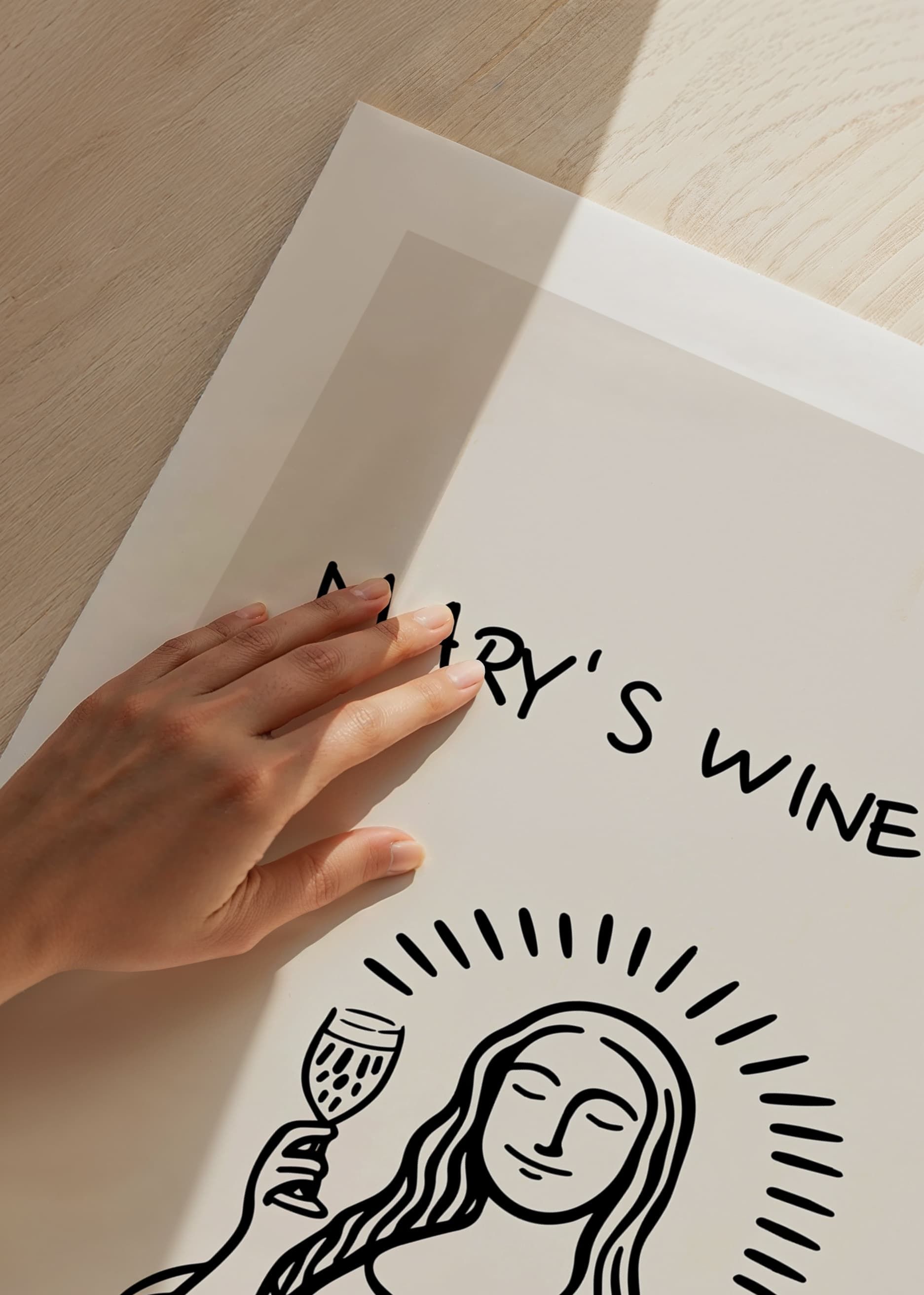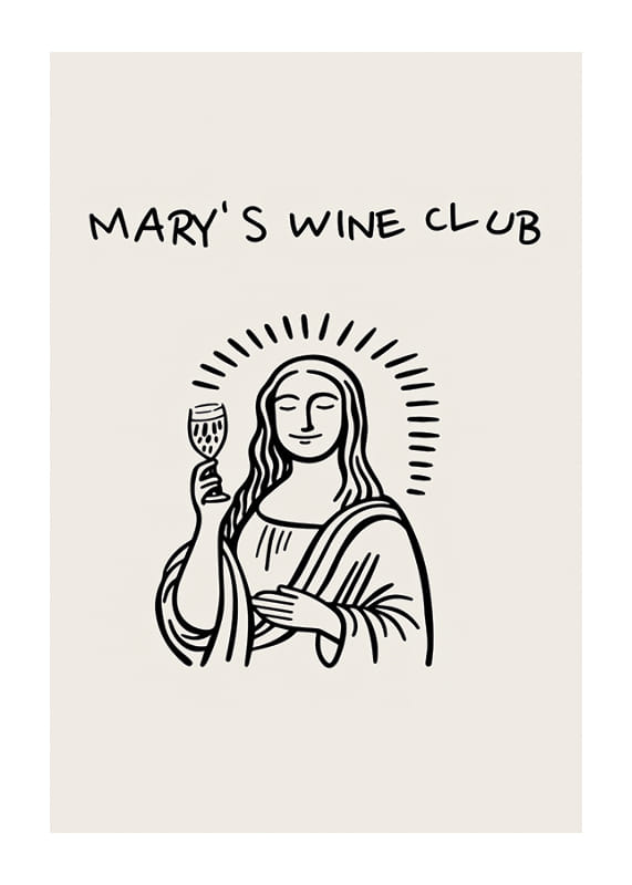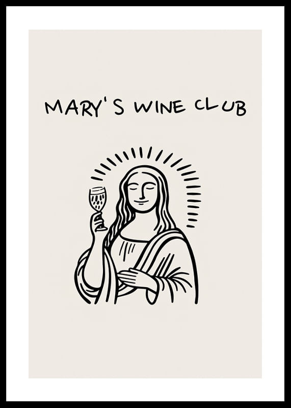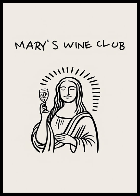 Postern förmedlar en unik blandning av humor och elegans när den avbildar en helig figur med ett vinglas. Denna oväntade kombination skapar en rolig och fängslande atmosfär i vilket rum den än pryder.