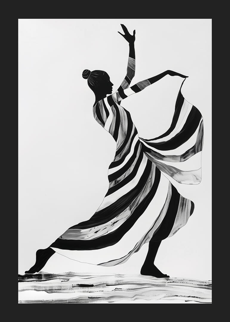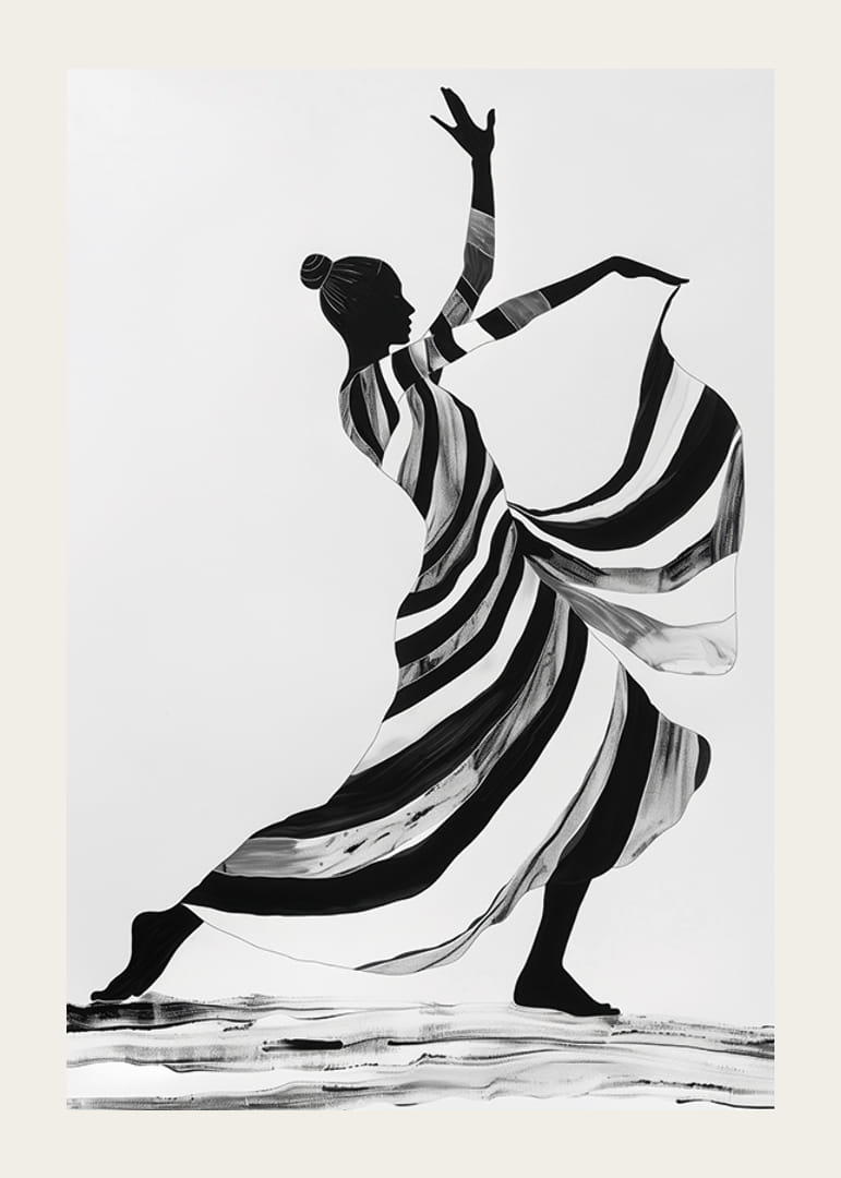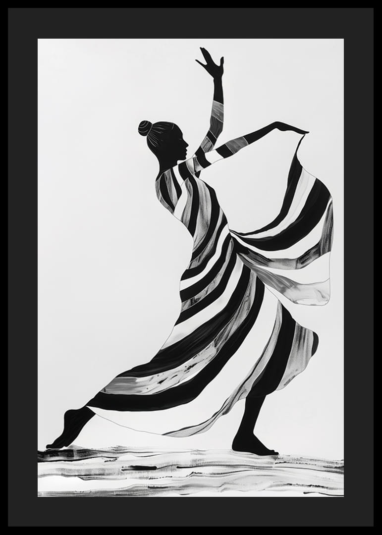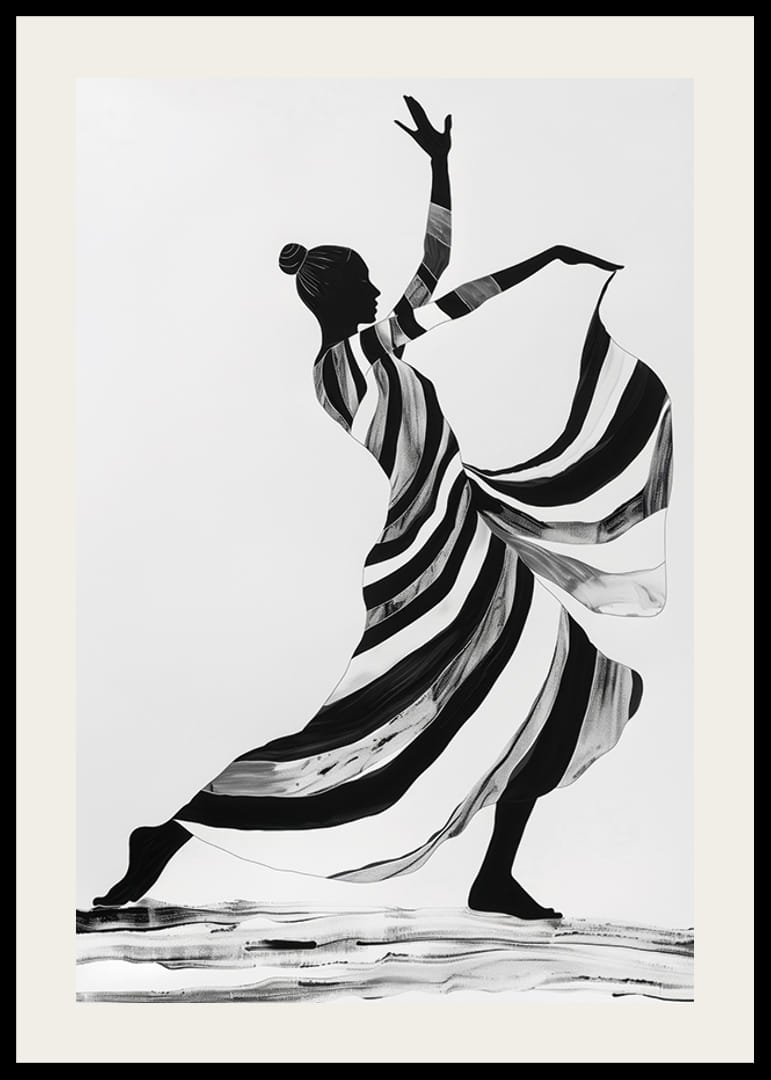 Denna poster fångar en elegant dansare i monokroma ränder som sveper över ytan och skapar en känsla av dynamik och lätthet. Den graciösa hållningen och de flytande linjerna ger en tidlös skönhet som förstärker atmosfären i vilket rum som helst.