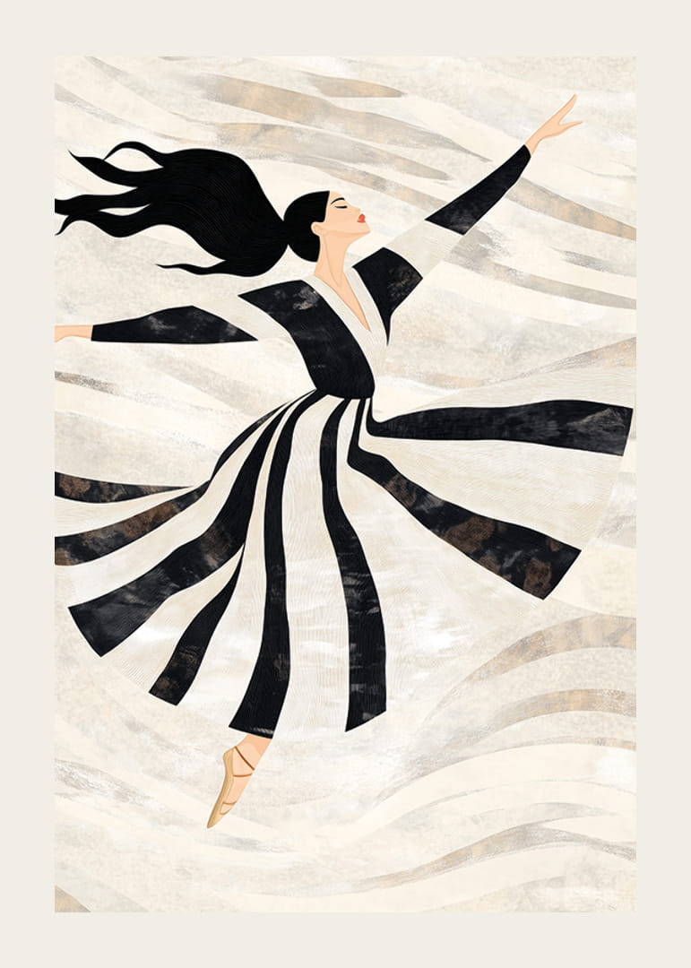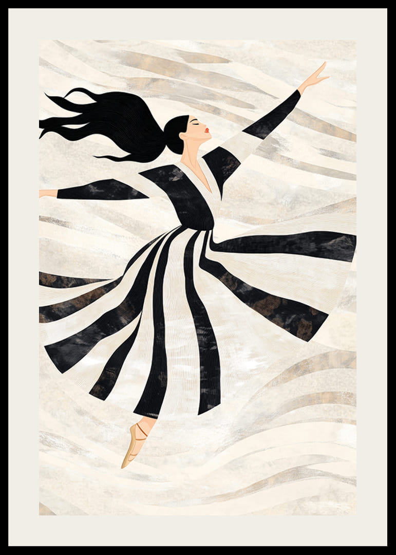 Denna poster fångar en dansös i en flyktig, graciös rörelse med svepande, svartvita klädsvall. Hennes elegans framhävs av de vågliknande mönstren som omger henne, vilket skapar en känsla av frihet och dynamik.