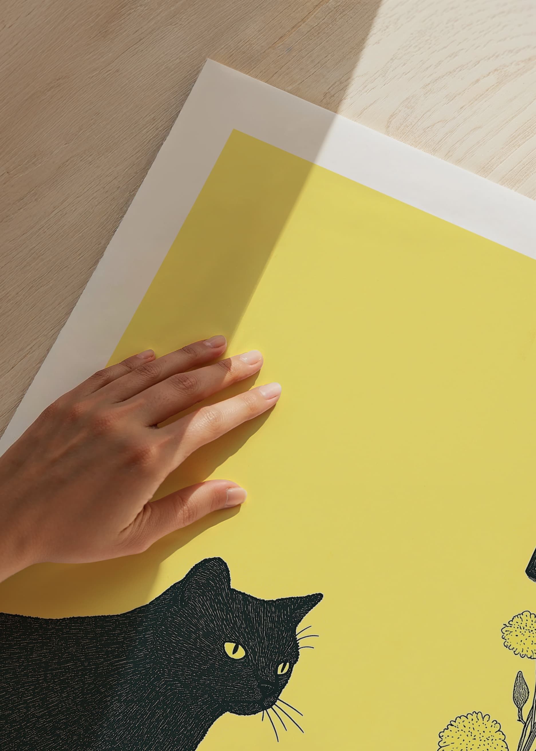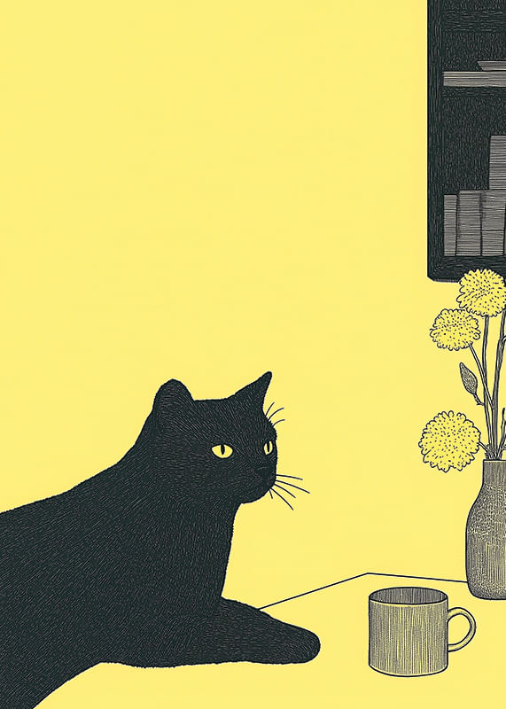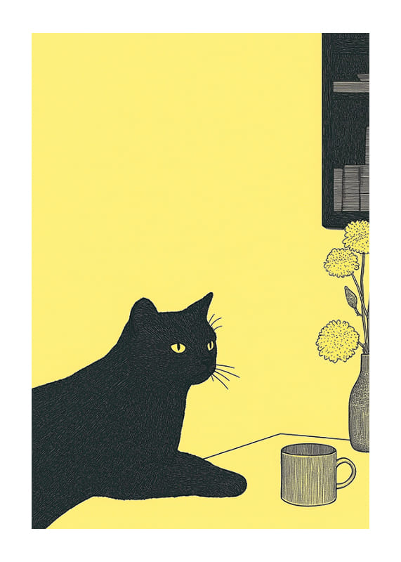 Denna poster fångar ögat med sin stilrena design av en svart katt mot en varm gul bakgrund. Katten vilar med ett lugnt självförtroende, bredvid en kopp och några blommor i en vas.
