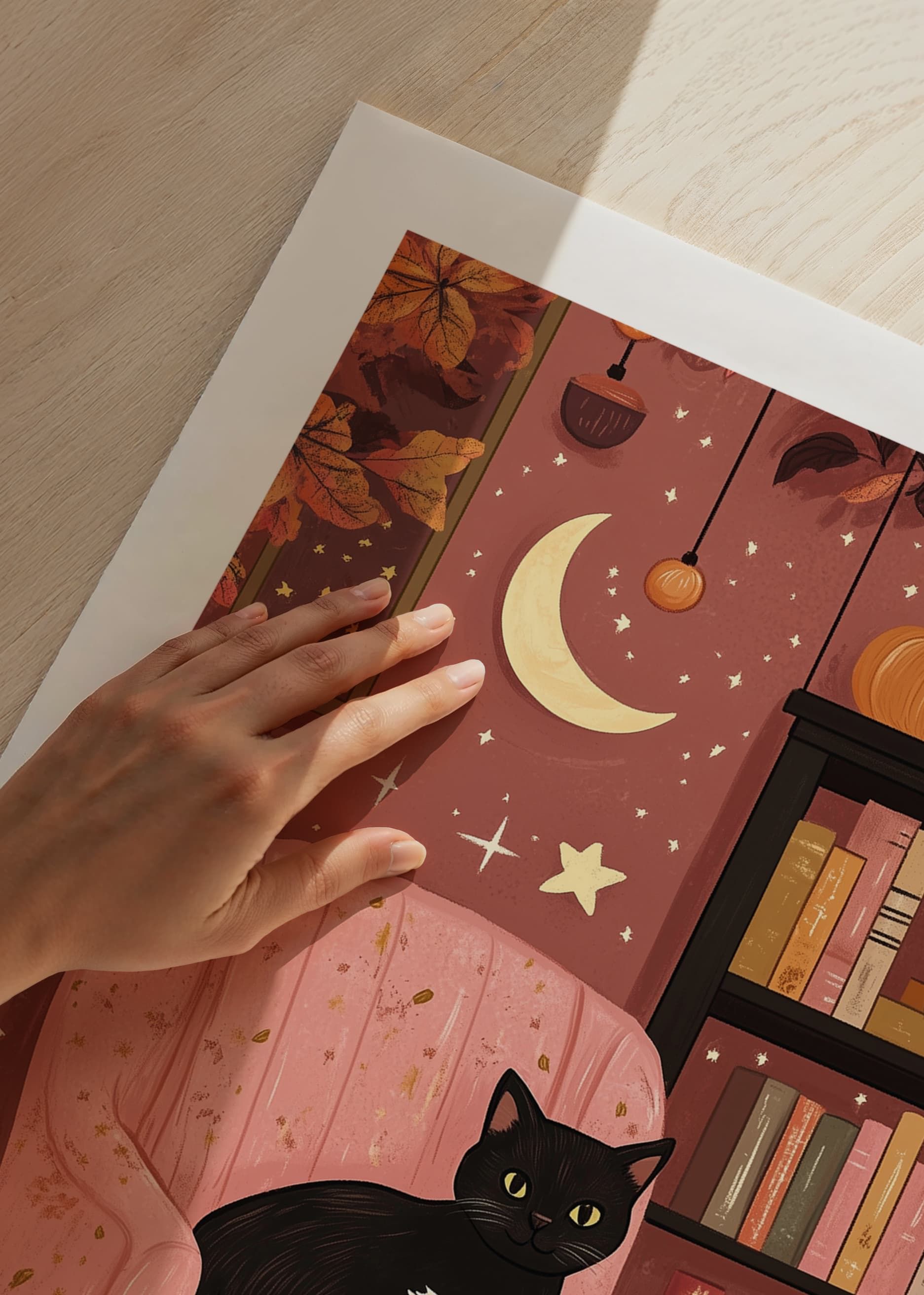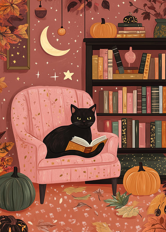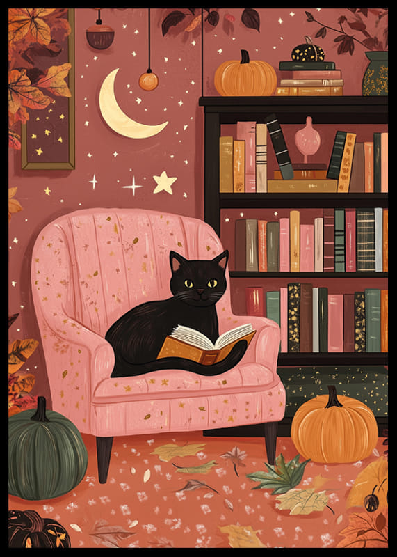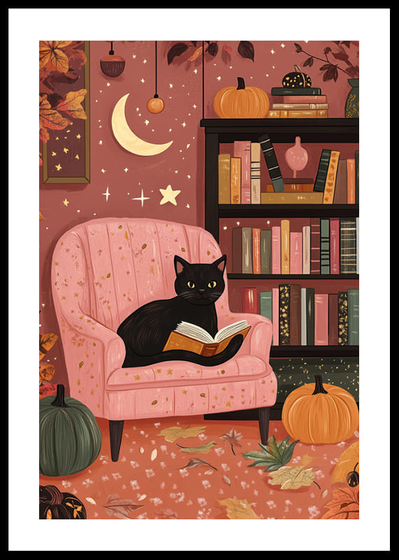Denna poster fångar en förtrollande scen med en svart katt som vilar i en rosa fåtölj, omgiven av böcker och höstlöv. Med de varma tonerna av brunt och orange skapar bilden en inbjudande och mystisk stämning.