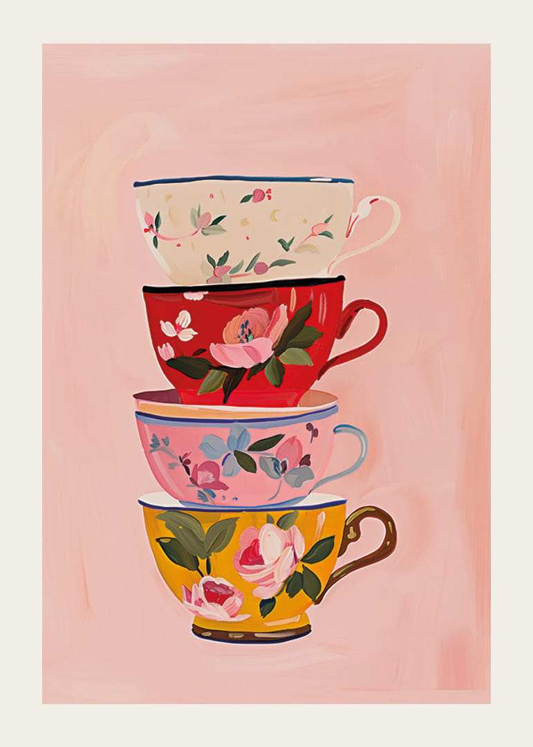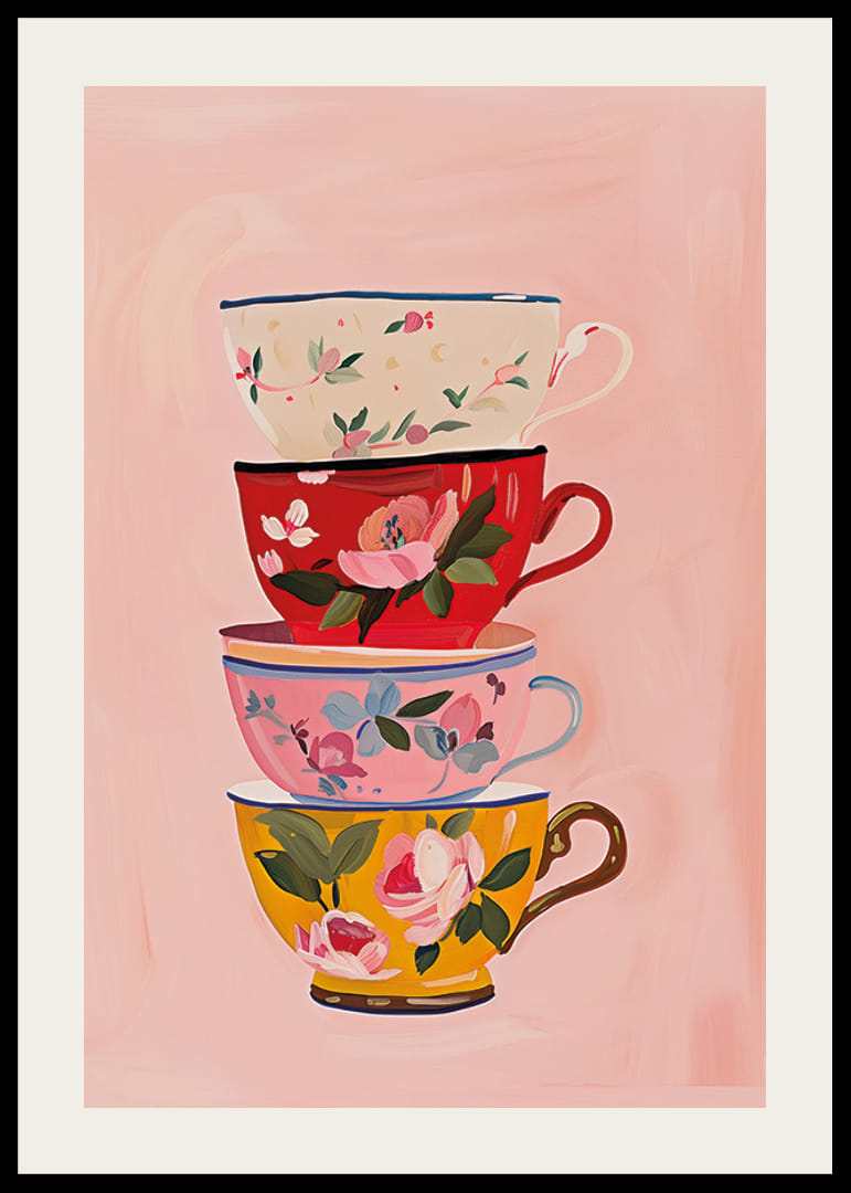 Denna poster fångar blicken med fyra elegant staplade tekoppar, var och en med en unik blomdesign mot en mjuk rosa bakgrund. De glada färgerna sprider värme och lugn, vilket gör denna poster till en perfekt fokalpunkt i vilket rum som helst.