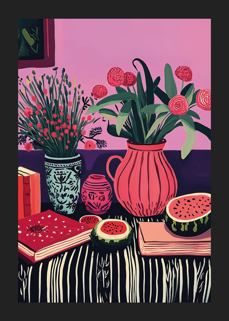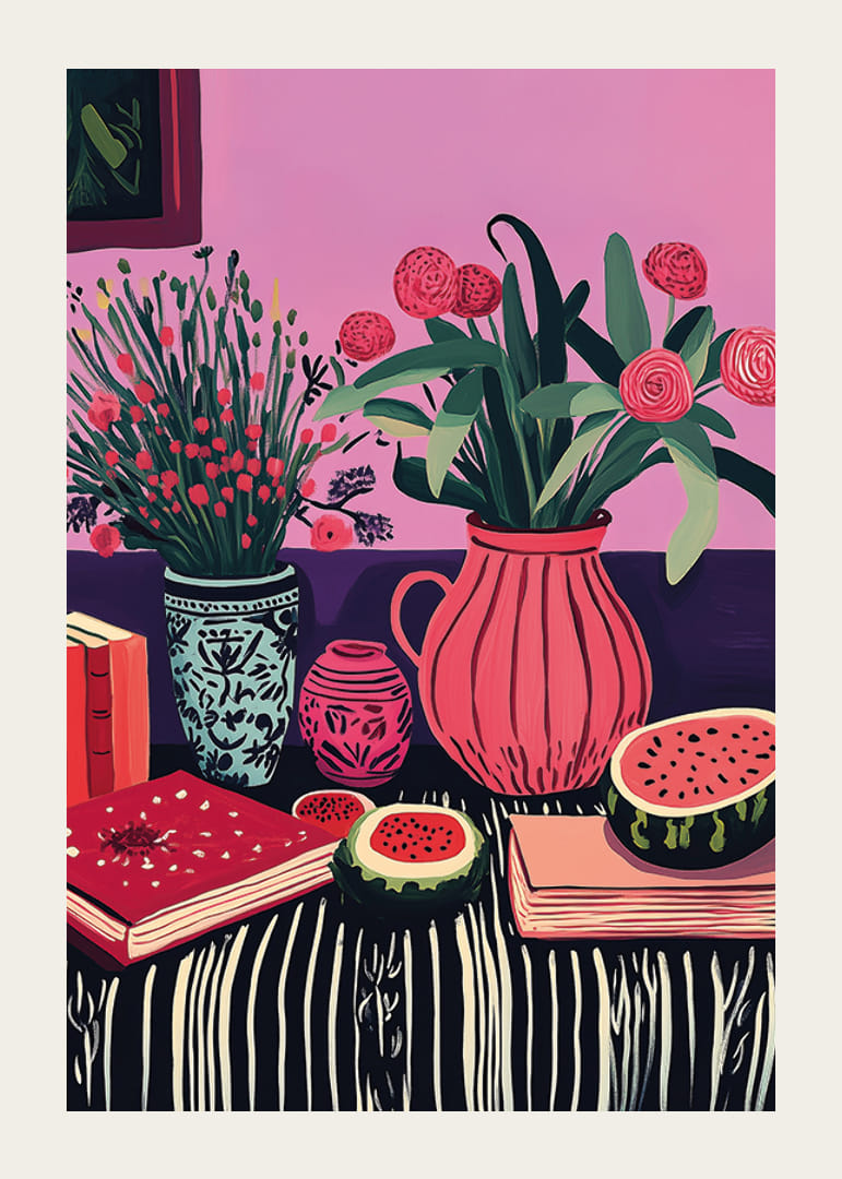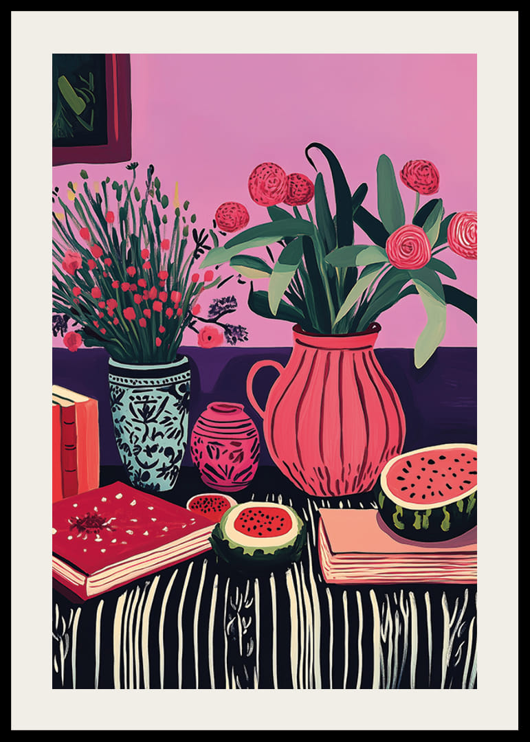 Den här postern fyller ditt hem med liv och glädje genom sin färgsprakande design. Med blommor i olika kärl och saftig melon på ett bord av randigt tyg, skapar den en harmonisk blandning av natur och konst.