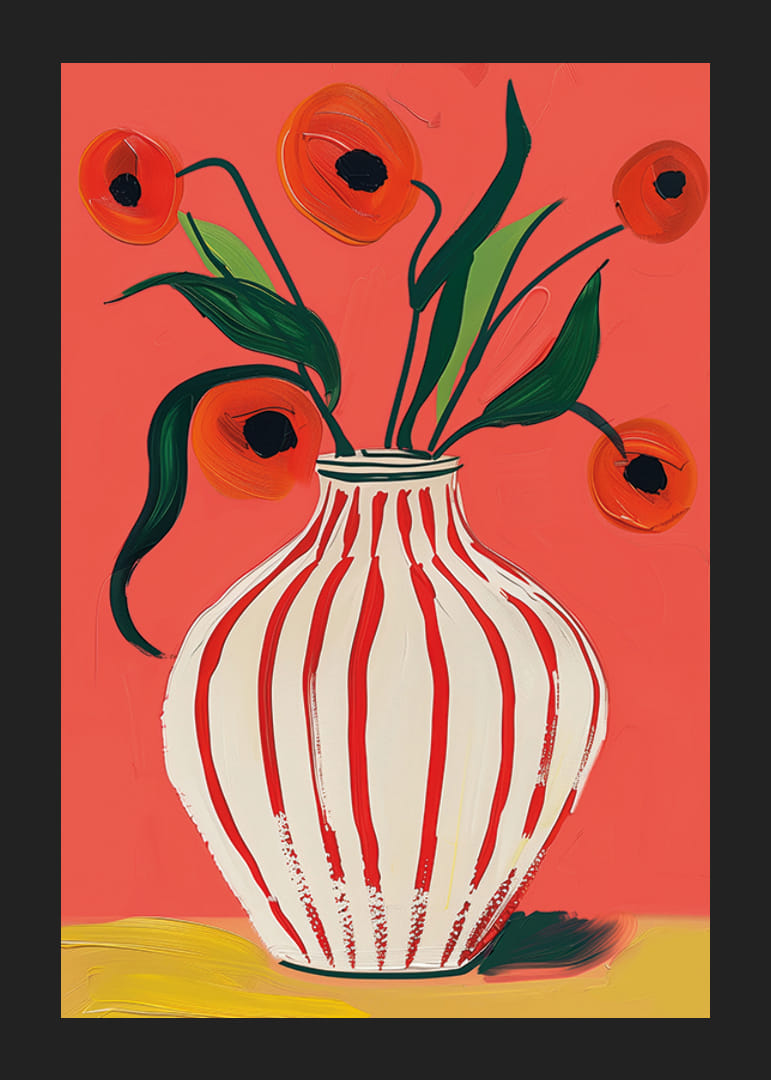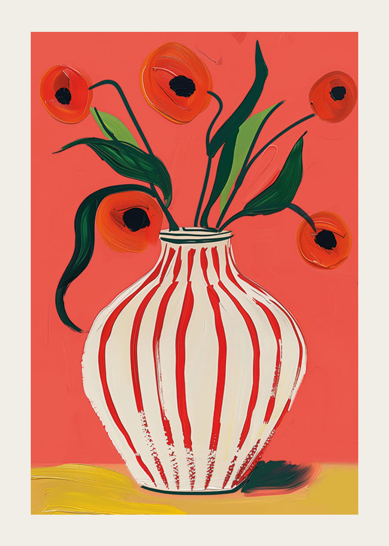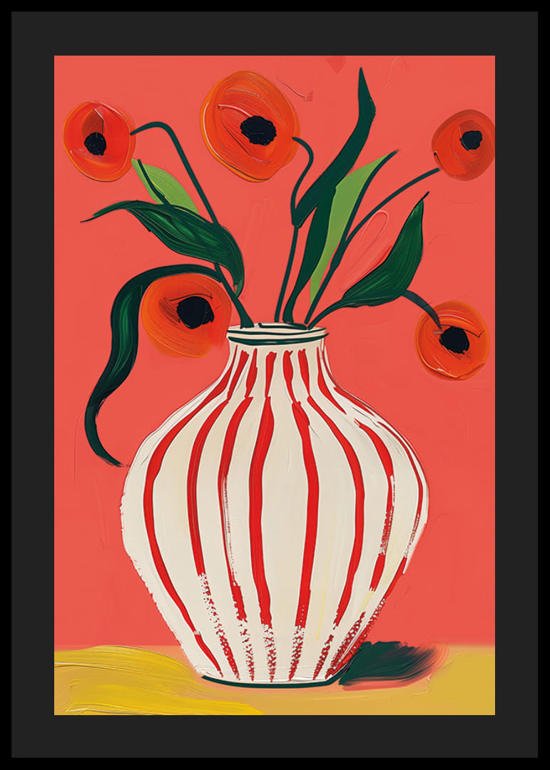 Denna poster fångar ögat med sin explosiva färgpalett, där röda vallmoblommor kontrasterar mot en livlig bakgrund. Den randiga vasens elegans tillför en subtil rörelse till hela kompositionen. Blommorna, målade med livliga penseldrag, skapar en känsla av friskhet och energi.