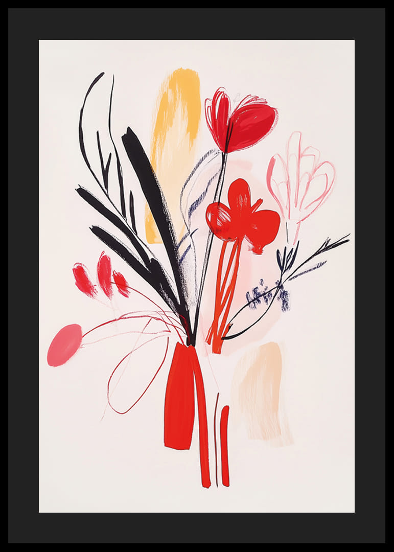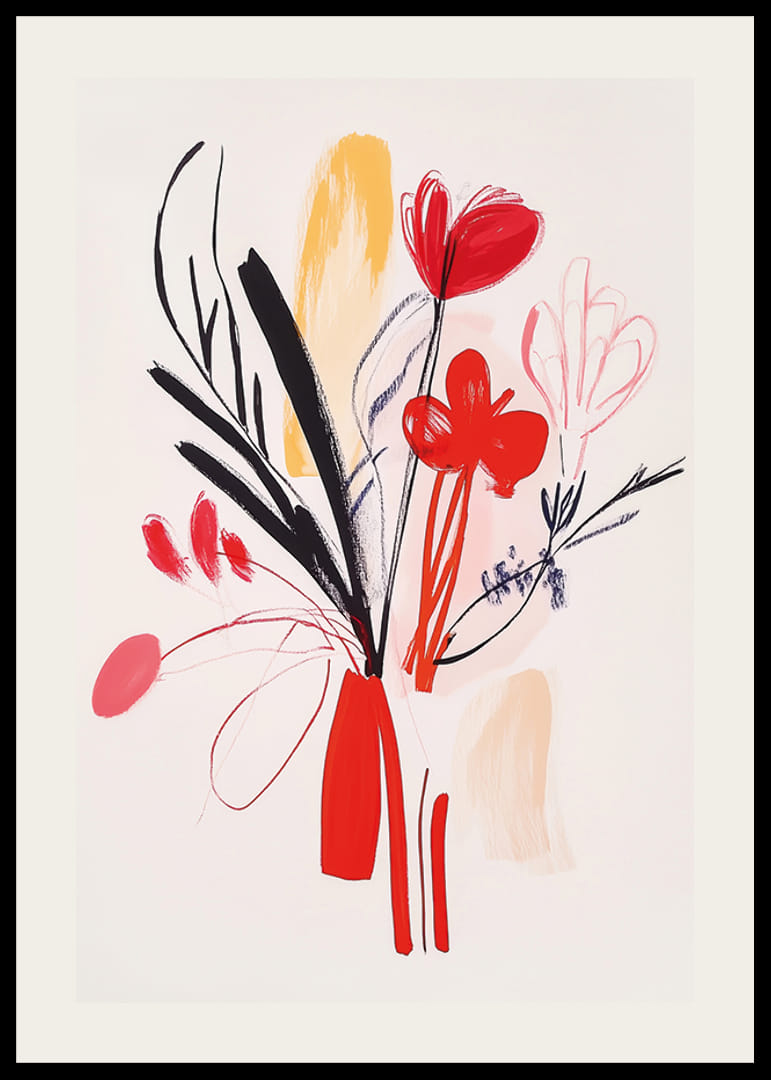 Denna poster fångar en livfull konstnärlig tolkning av blommor, där dynamiska former och färger förenas i en harmonisk symfoni. Röda och svarta streck skapar en fascinerande kontrast mot mjuka pastellfärger som ger djup och rörelse.