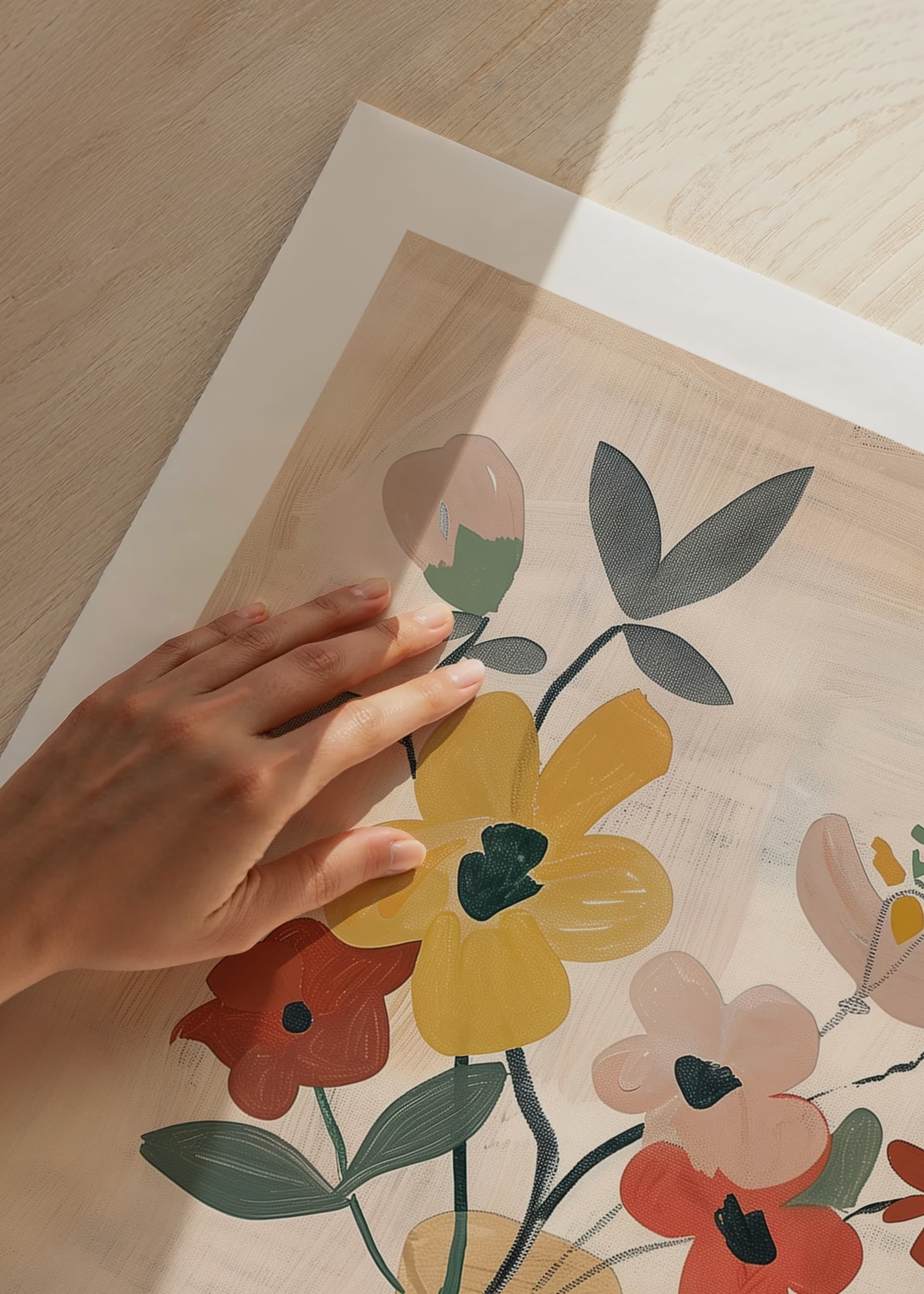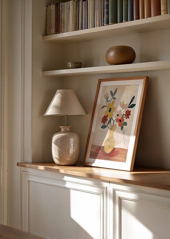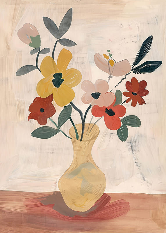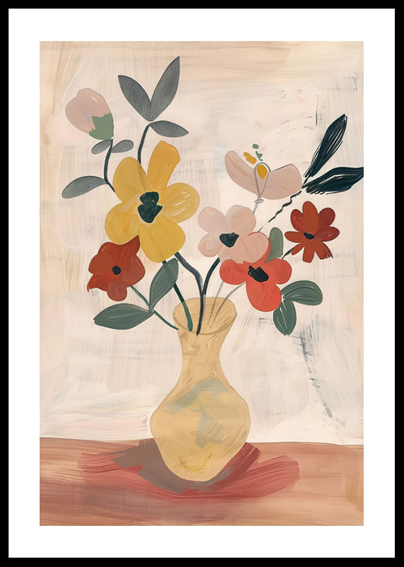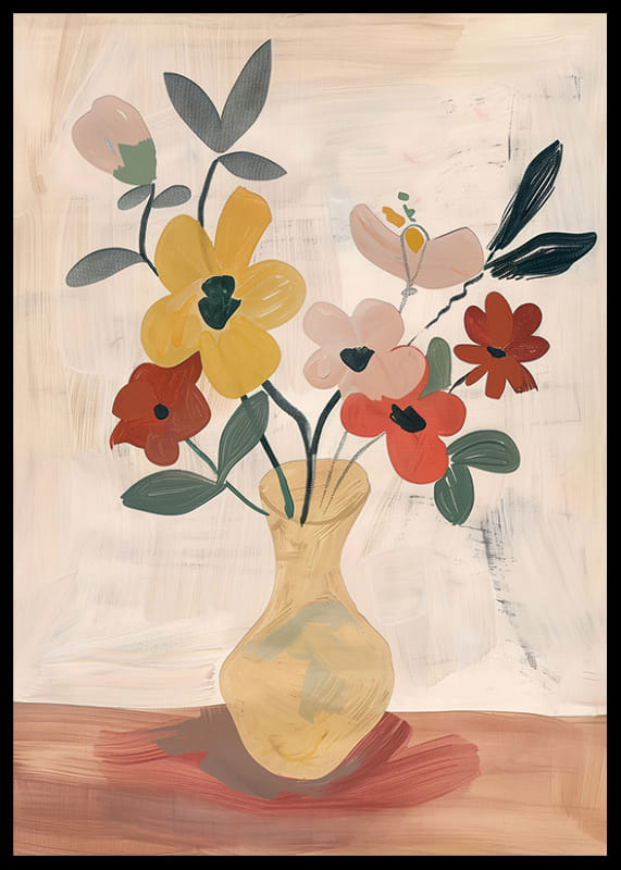 Med en mjuk elegans fångar denna poster ögat med färgglada blommor arrangerade i en stilfull vas. De livfulla gula och röda nyanserna mot en mjuk, dämpad bakgrund skapar en atmosfär av fridfullhet och skönhet.