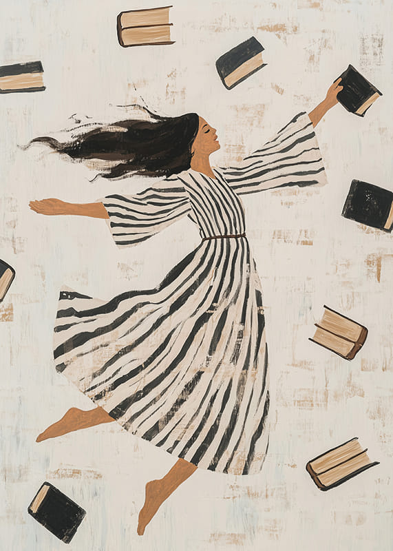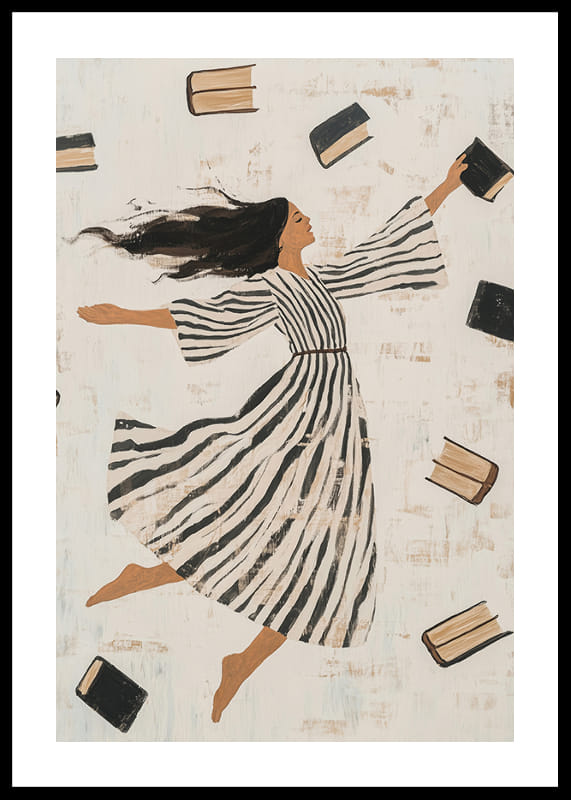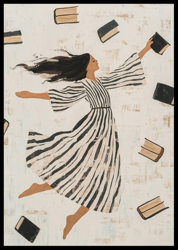 Denna poster fångar en kvinna i en randig klänning som tycks flyga genom ett hav av böcker. Hennes utsträckta armar och glada uttryck skapar en känsla av frihet och kreativitet.