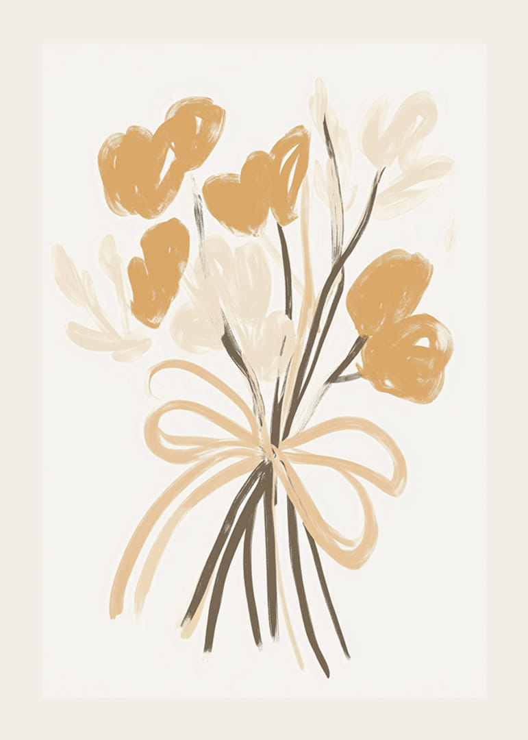 Denna poster fångar ögonblicket av blommornas skönhet med mjuka, gyllene nyanser som dansar på ytan. De stiliserade bladen med sina eleganta kurvor skapar en känsla av rörelse och liv. Den enkla men sofistikerade färgpaletten i detta verk lyfter fram blommornas naturliga charm.