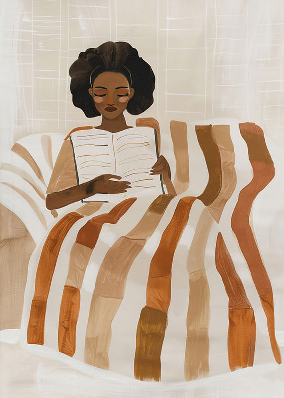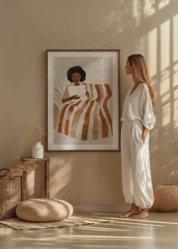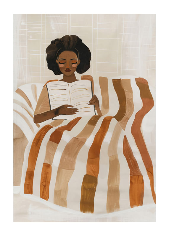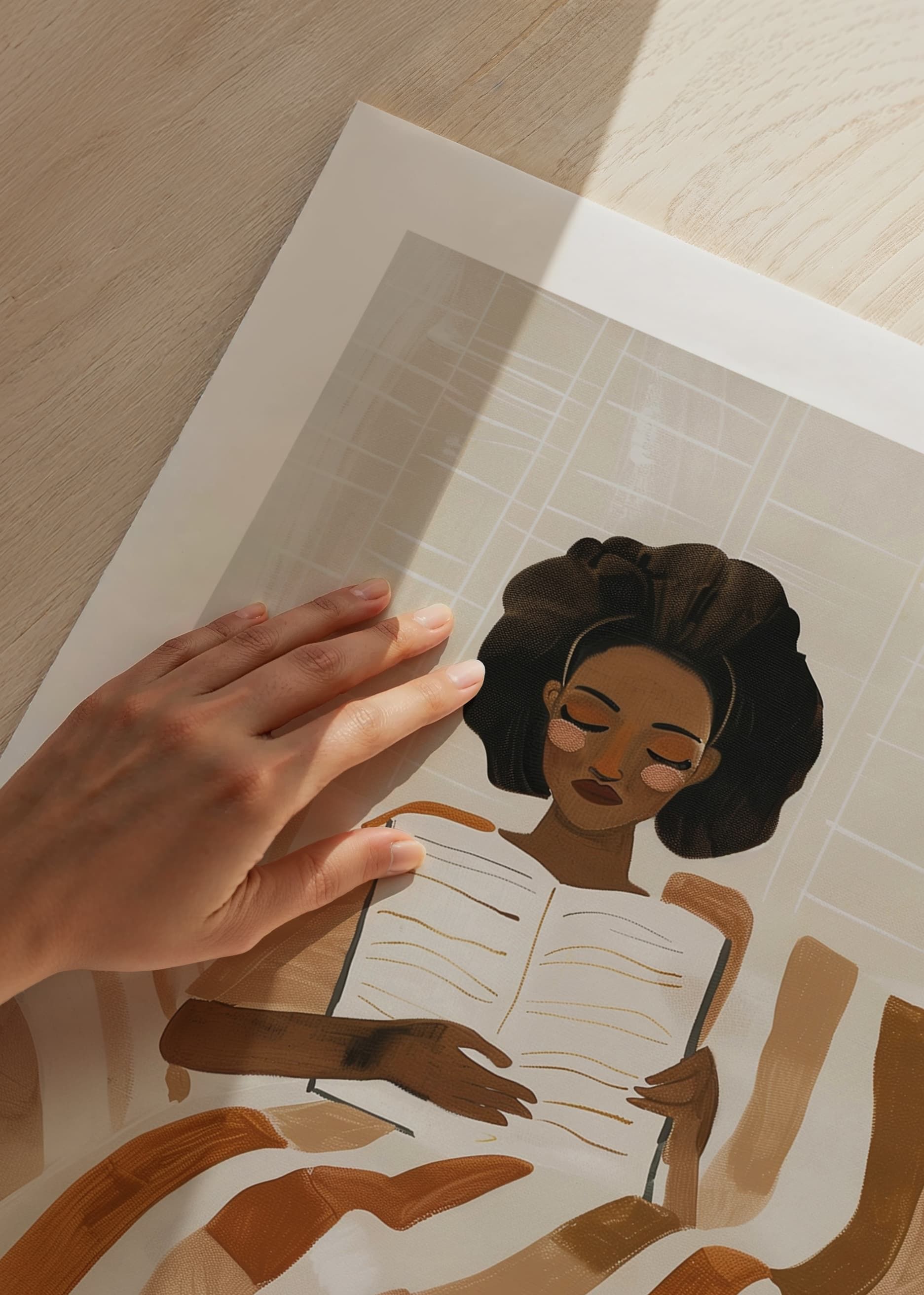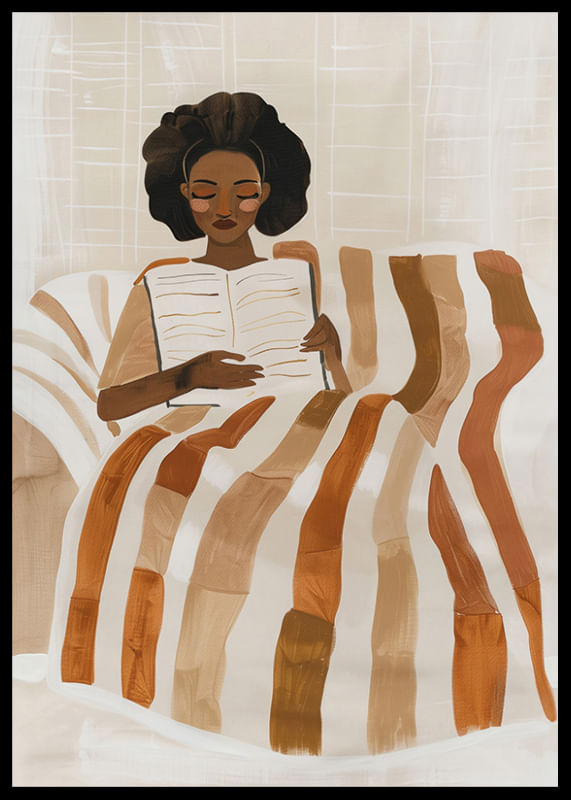 Denna poster fångar en fridfull stund där en person försjunker i en bok, insvept i mjuka, jordnära toner. De harmoniska färgerna skapar en känsla av komfort och introspektion. Affischen förenar estetisk skönhet med en känsla av lugn.