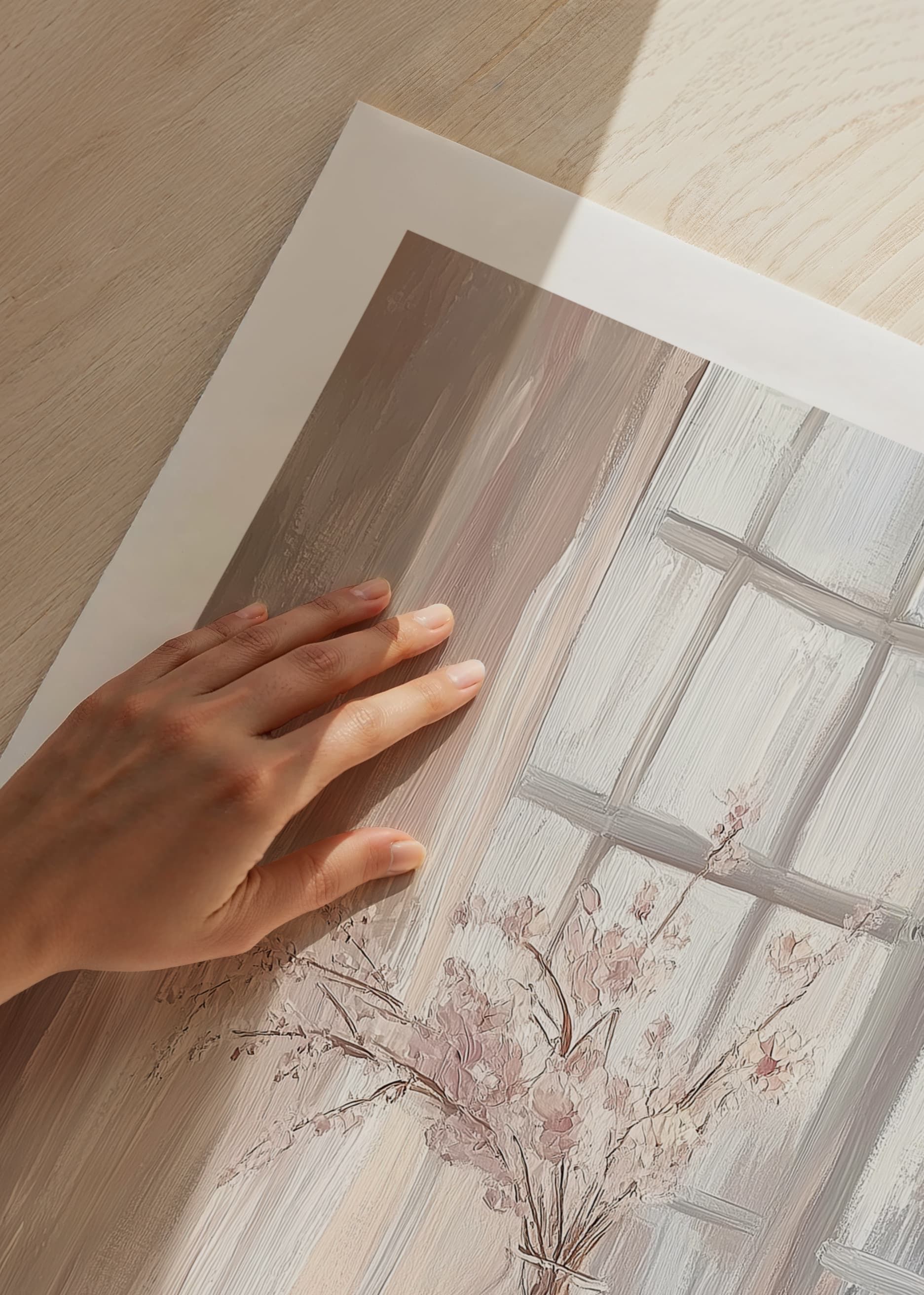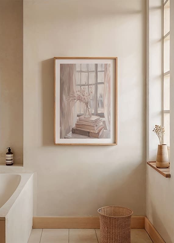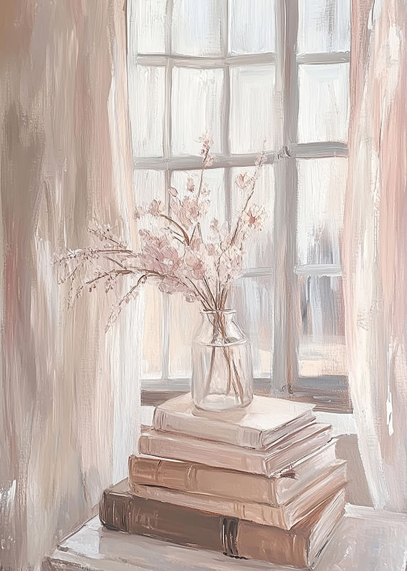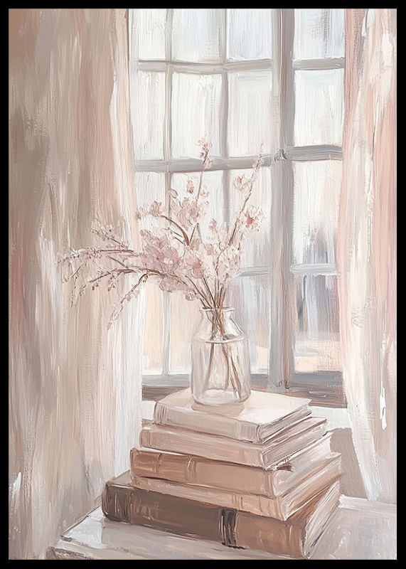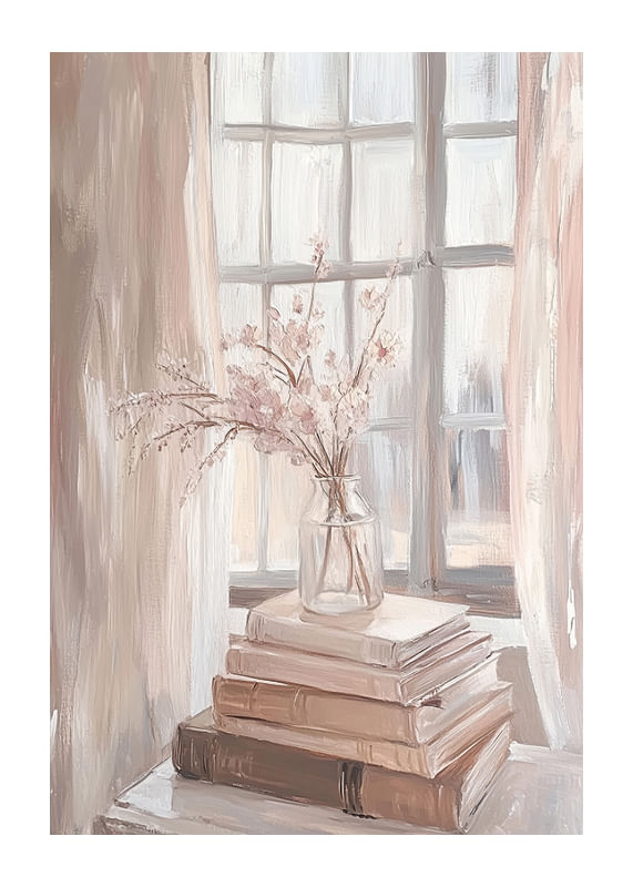 Denna poster fångar en stund av stillhet med mjuka pennstreck och milda nyanser. En bukett skira blommor i en glaskanna vilar på en hög av böcker, vars varma solstrålar leker genom fönstret. Den avbildar en perfekt balans mellan ljus och skugga, vilket skapar en känsla av frid i rummet.
