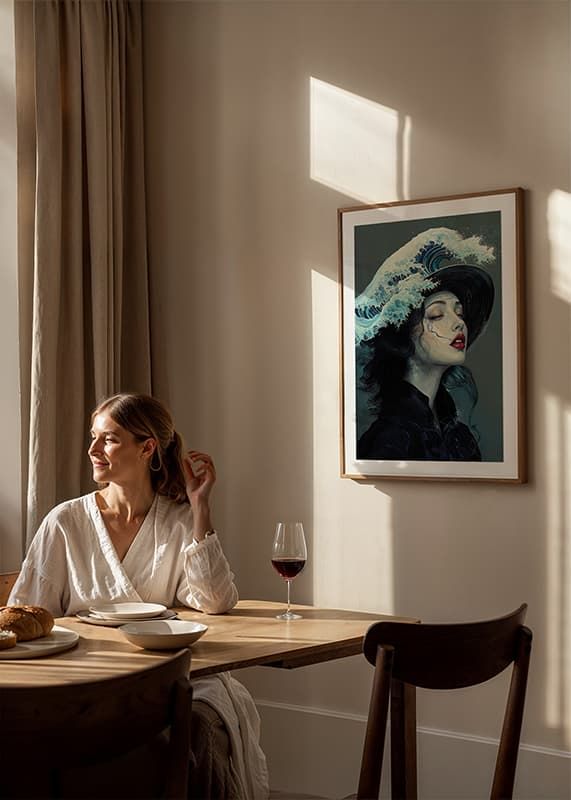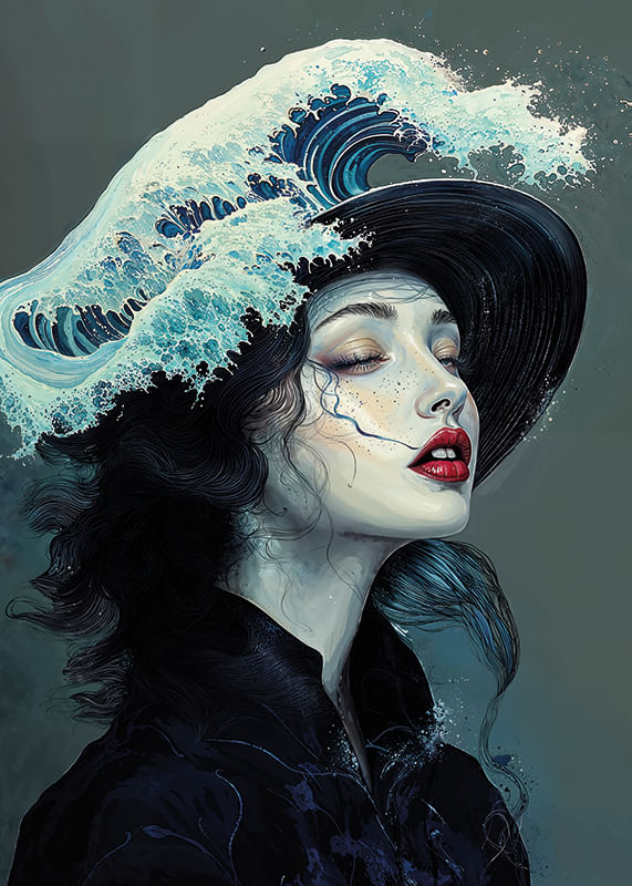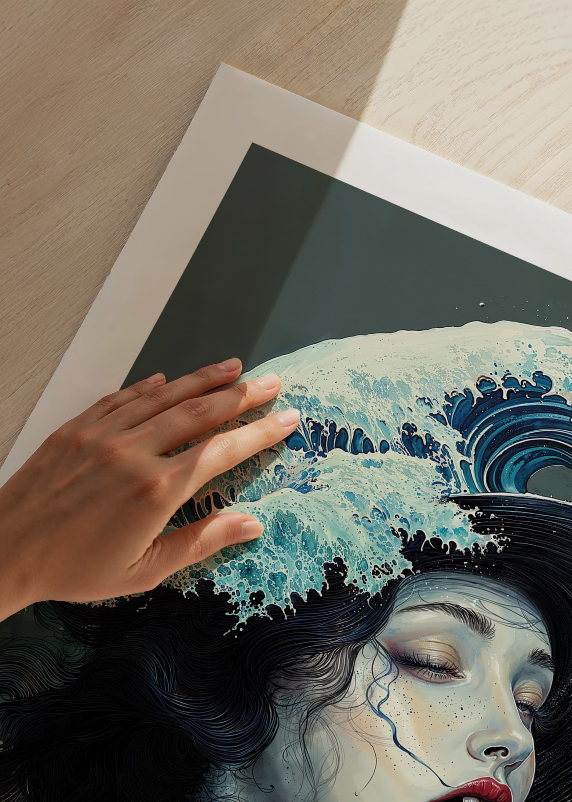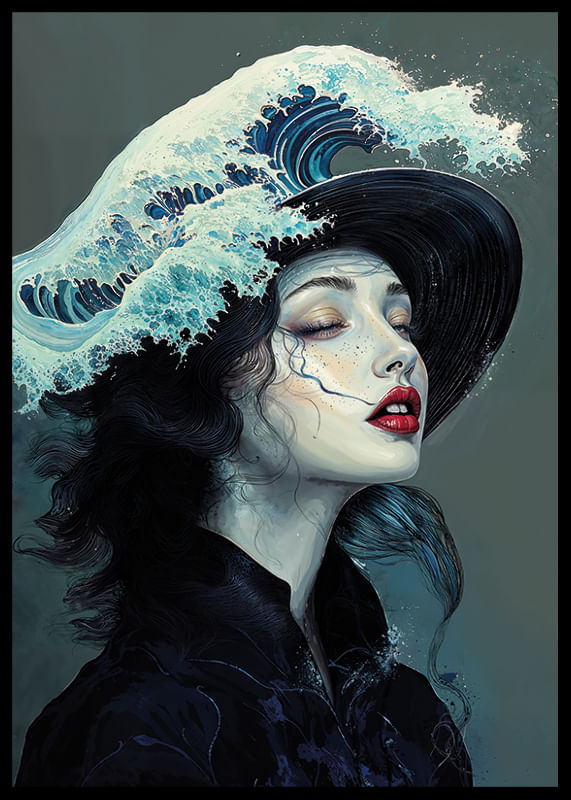 Denna poster fångar en förtrollande sammansmältning av element där en elegant kvinna omges av dramatiska vågor, vilket ger en känsla av mystik och styrka. Det vibranta blåa vattnet och de subtila tonerna i hennes ansikte och kläder skapar en harmonisk balans.