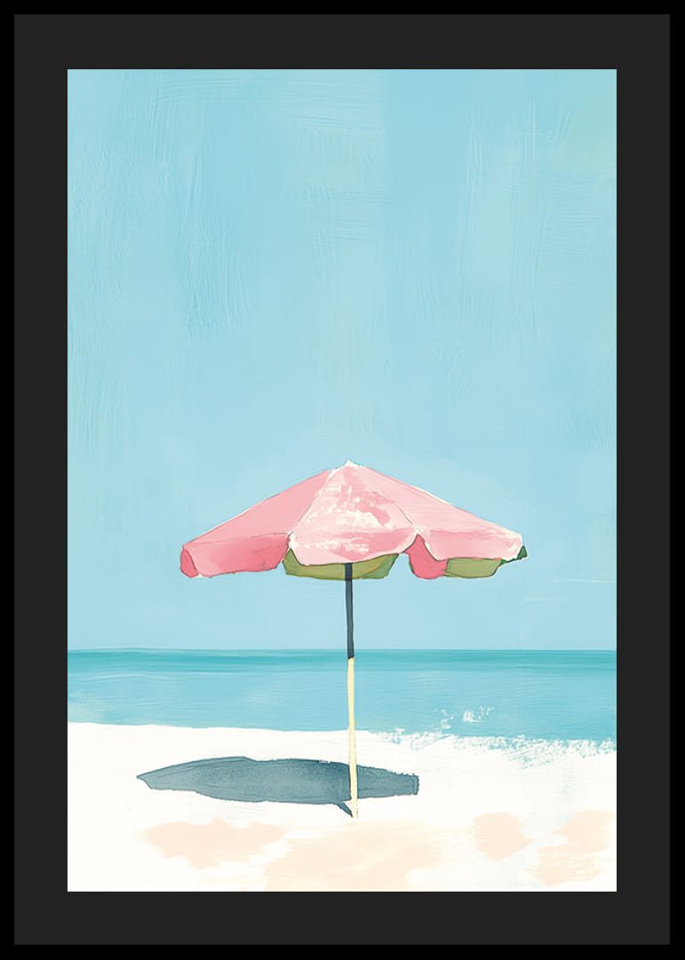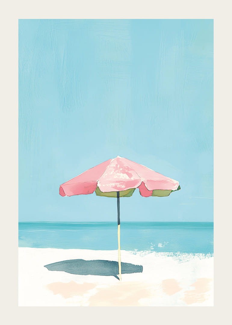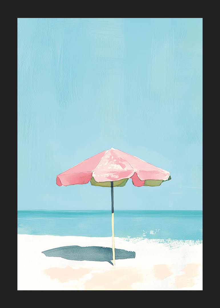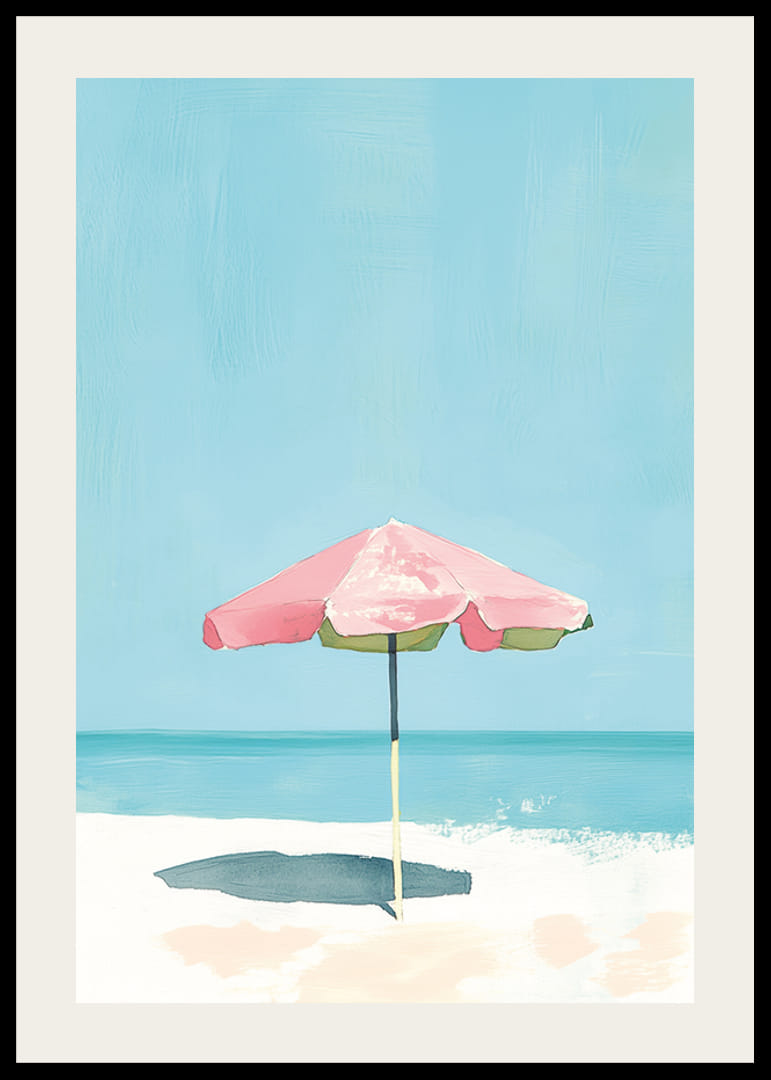 Denna poster fångar essensen av en lugn sommardag vid havet, där en ensam parasoll i mjuka pastellfärger skänker både skugga och skönhet. Den pastellrosa färgen mot den klarblå himlen skapar ett inbjudande och nostalgiskt uttryck.