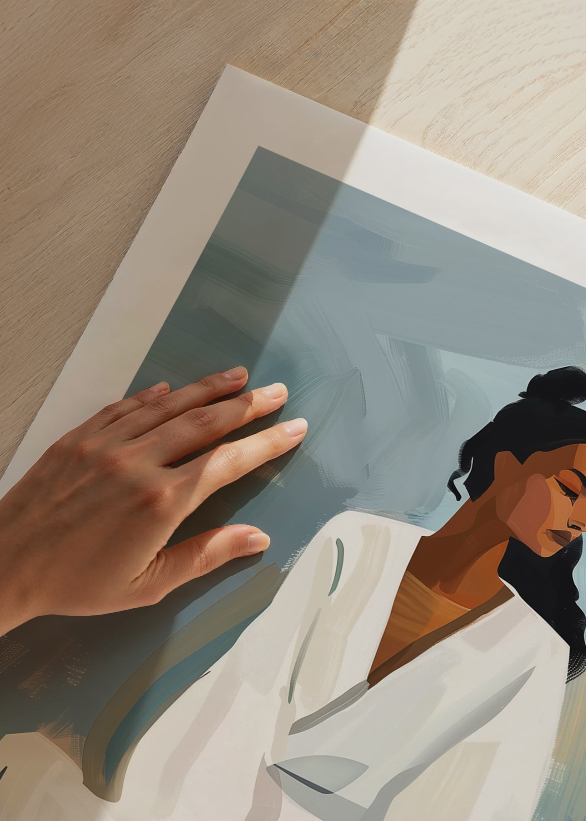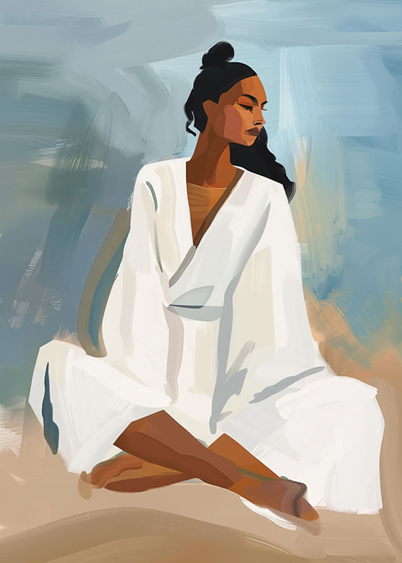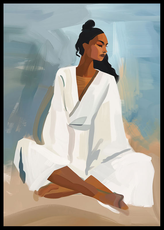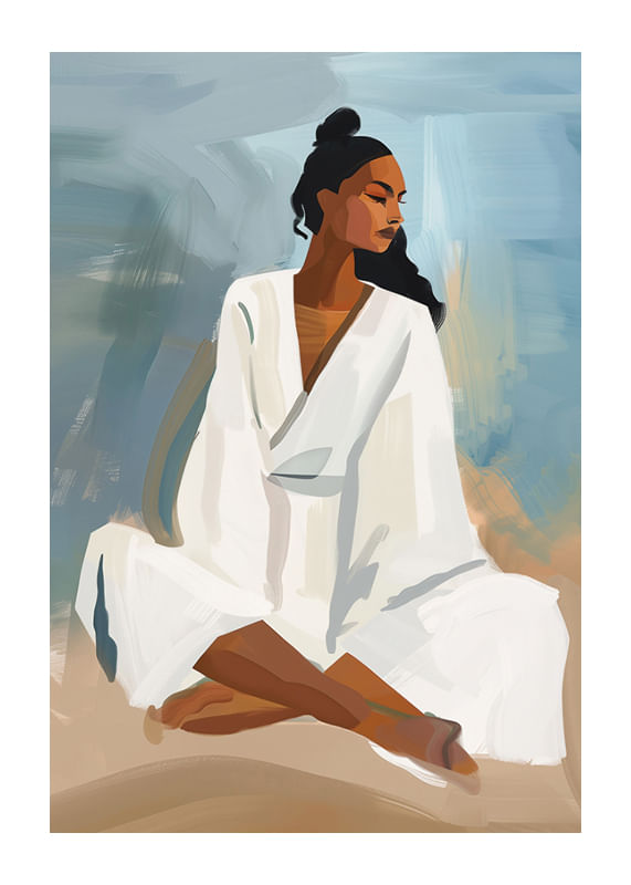 Denna poster fångar en sittande kvinna i en avkopplad och elegant pose mot en bakgrund av mjuka, dämpade färger. Hennes drömska uttryck och flytande linjer skapar en känsla av inre frid och harmoni.