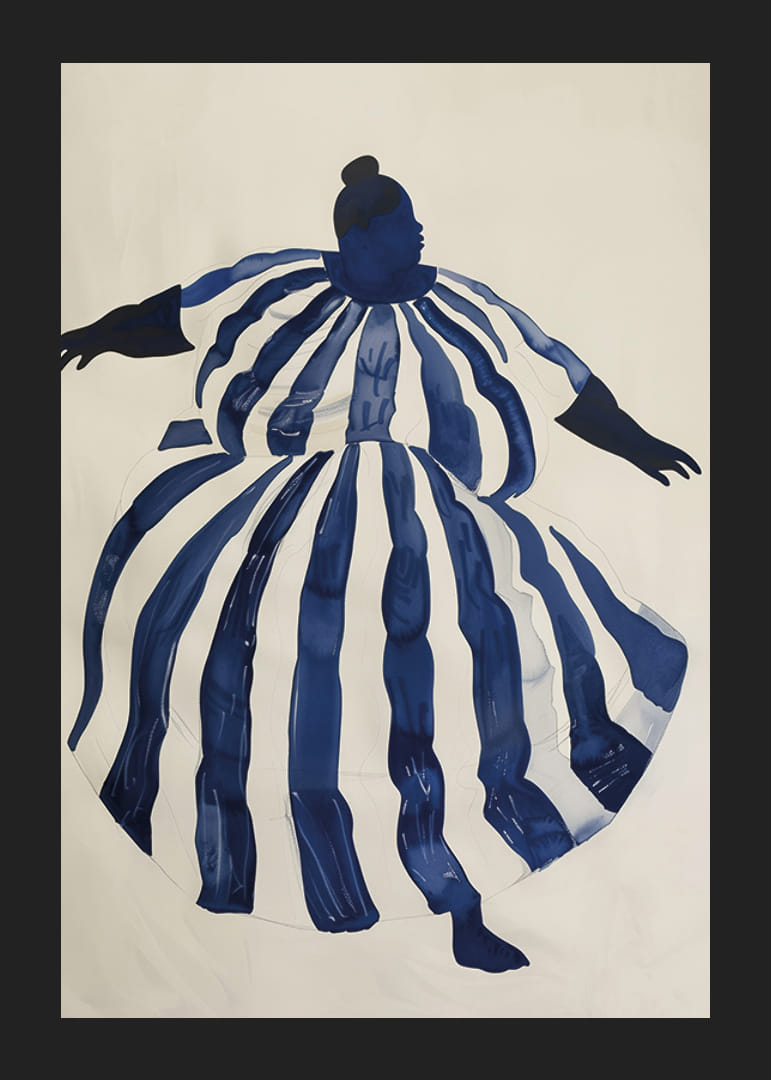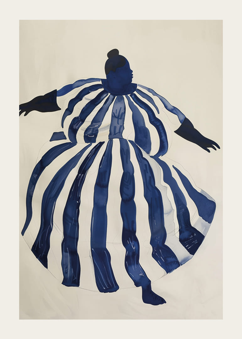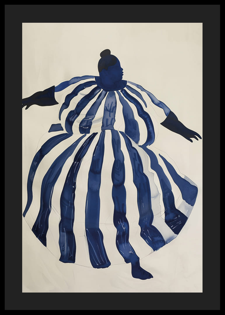 Denna poster fångar en dynamisk silhuett i blått och vitt, vars svepande linjer och eleganta rörelser ger en känsla av frihet och musikalitet. Den abstrakta formen skapar ett harmoniskt spel mellan ljus och skugga, vilket ger rummet en unik och konstnärlig atmosfär.