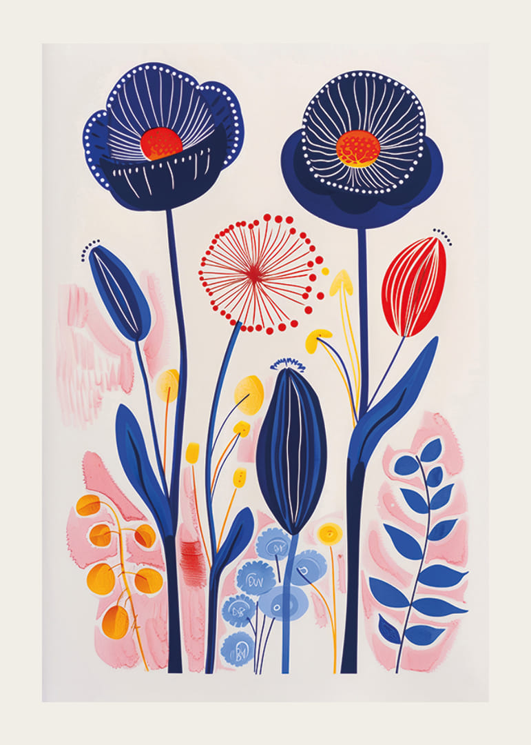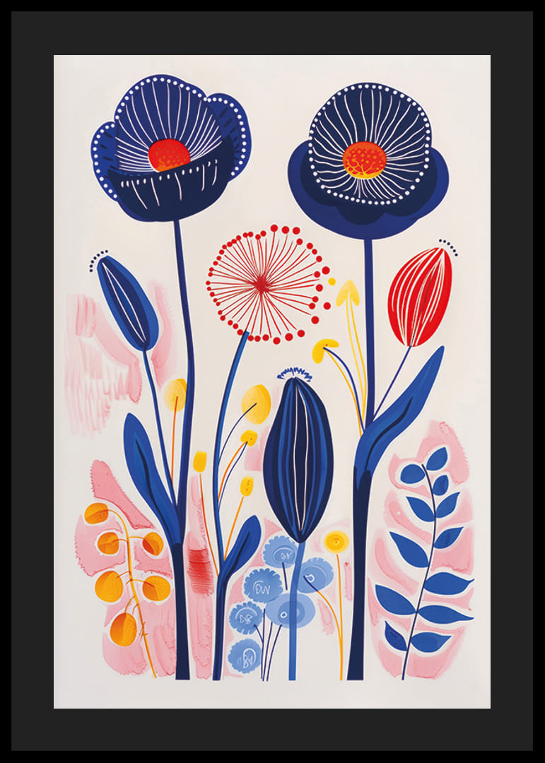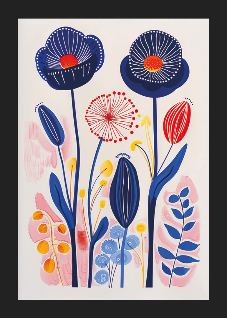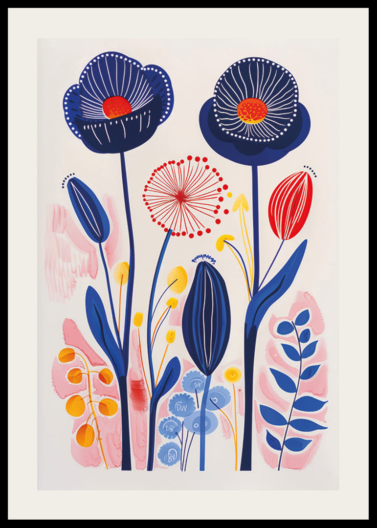 Denna poster fångar ögat med en explosion av livliga färger där olika blomformer växer i symbios. De blå och röda tonaliteterna dansar över papperet, vilket skapar en känsla av rörelse och liv. Varje penseldrag verkar pulsera med energi och glädje.