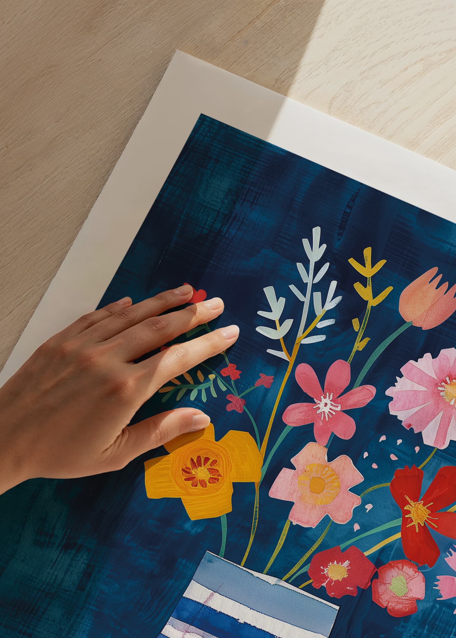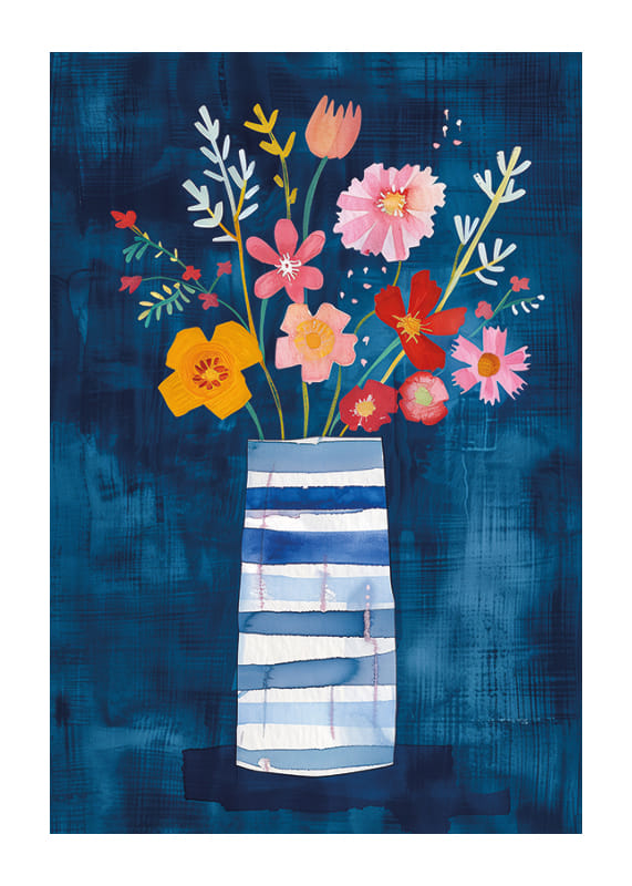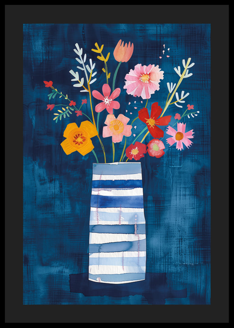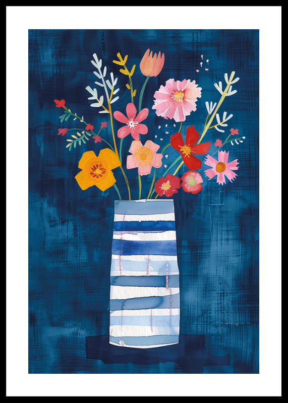 Denna poster fångar ögonblicket av florans prakt med färgstarka blommor mot en djupblå bakgrund. Blommornas livfulla färger, inklusive rosa, gult och rött, ger en känsla av glädje och friskhet som kontrasterar mot vasens lugna, blå nyanser.