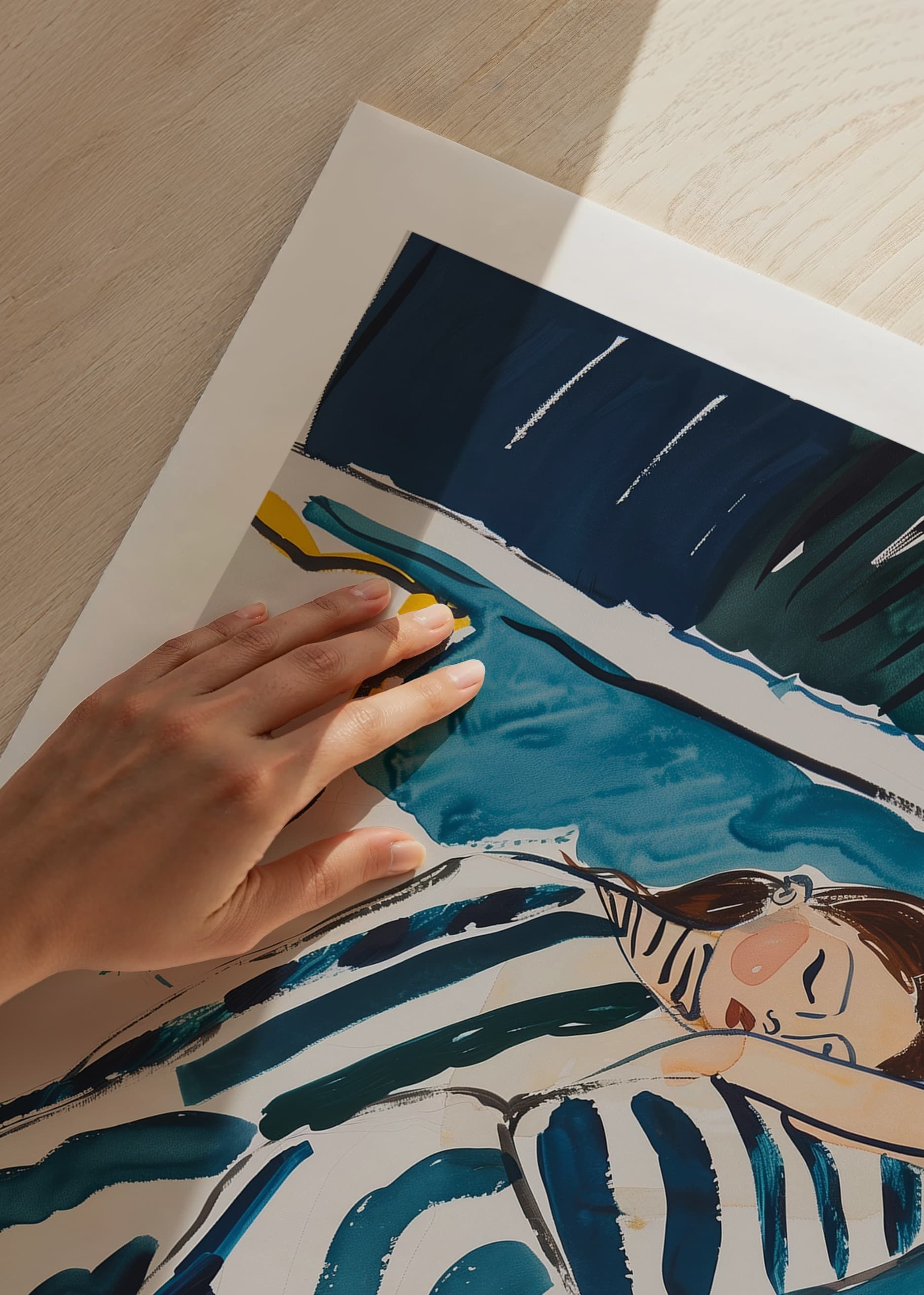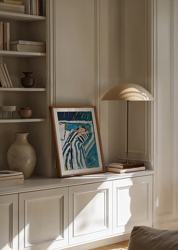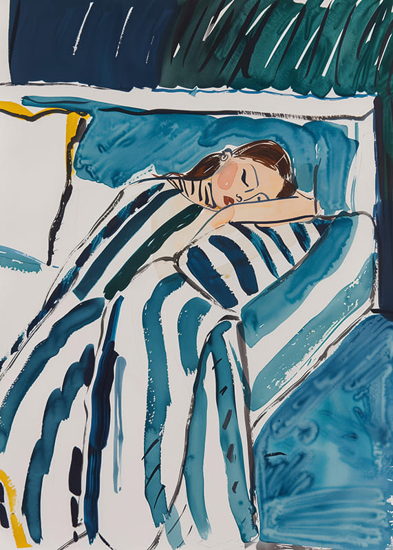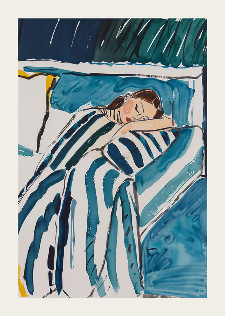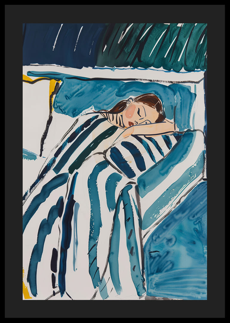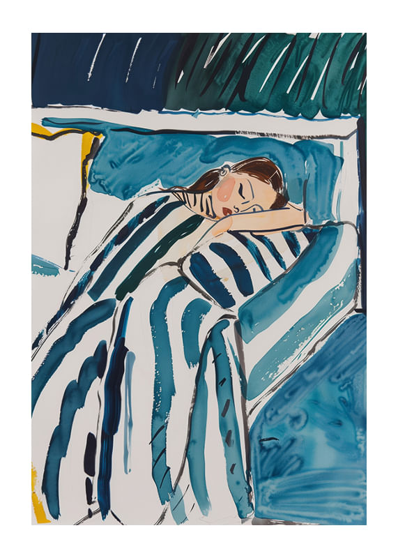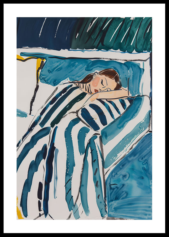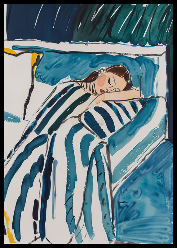 Denna affisch fångar den fridfulla stunden av en sovande gestalt, inbäddad i mjuka, blå och gröna toner som skapar en känsla av lugn och harmoni. De svepande linjerna och färgerna ger en drömmig kvalitet som förmedlar en känsla av trygghet och ro.