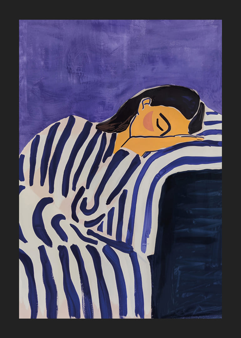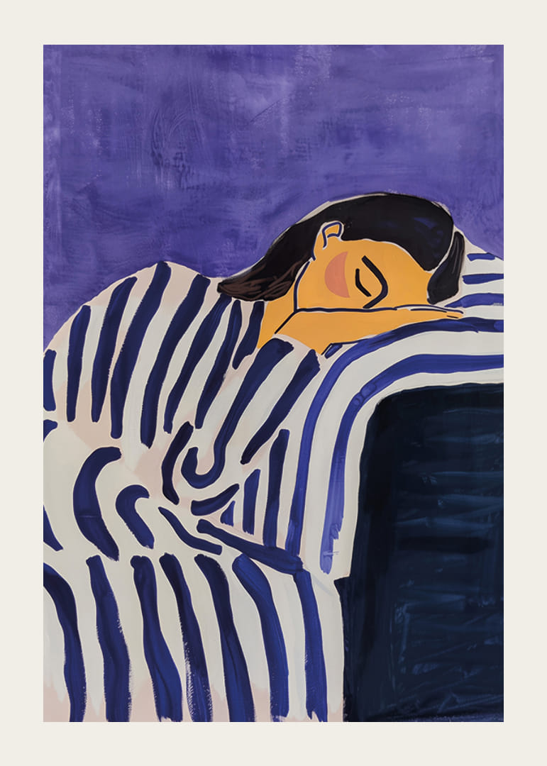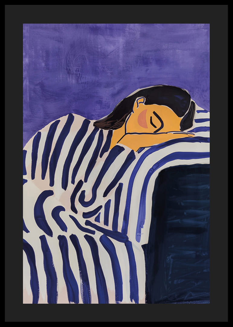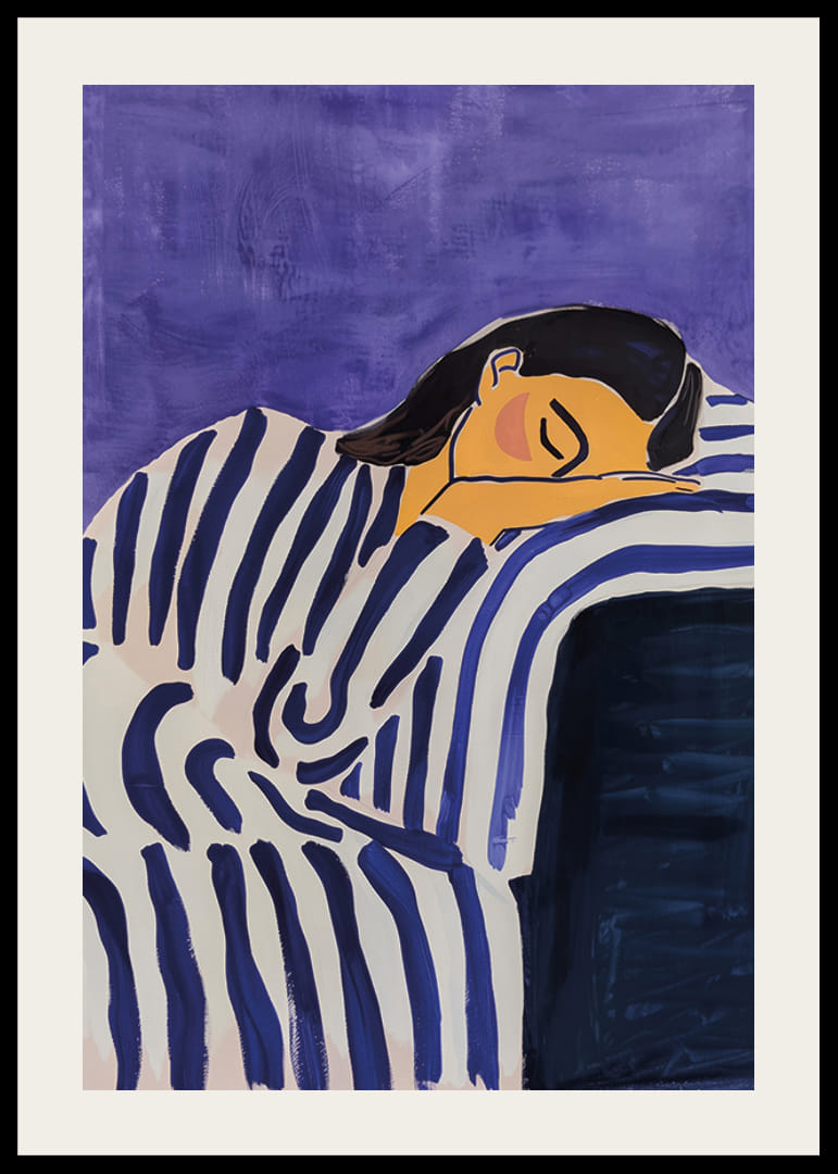 Denna poster fångar en fridfull stund med en sovande person insvept i mjuka ränder. Bakgrundens djupa, drömlika lila nyans förstärker känslan av ro och stillhet. Det avskalade men uttrycksfulla formspråket skapar en lugnande atmosfär som fördjupar upplevelsen.