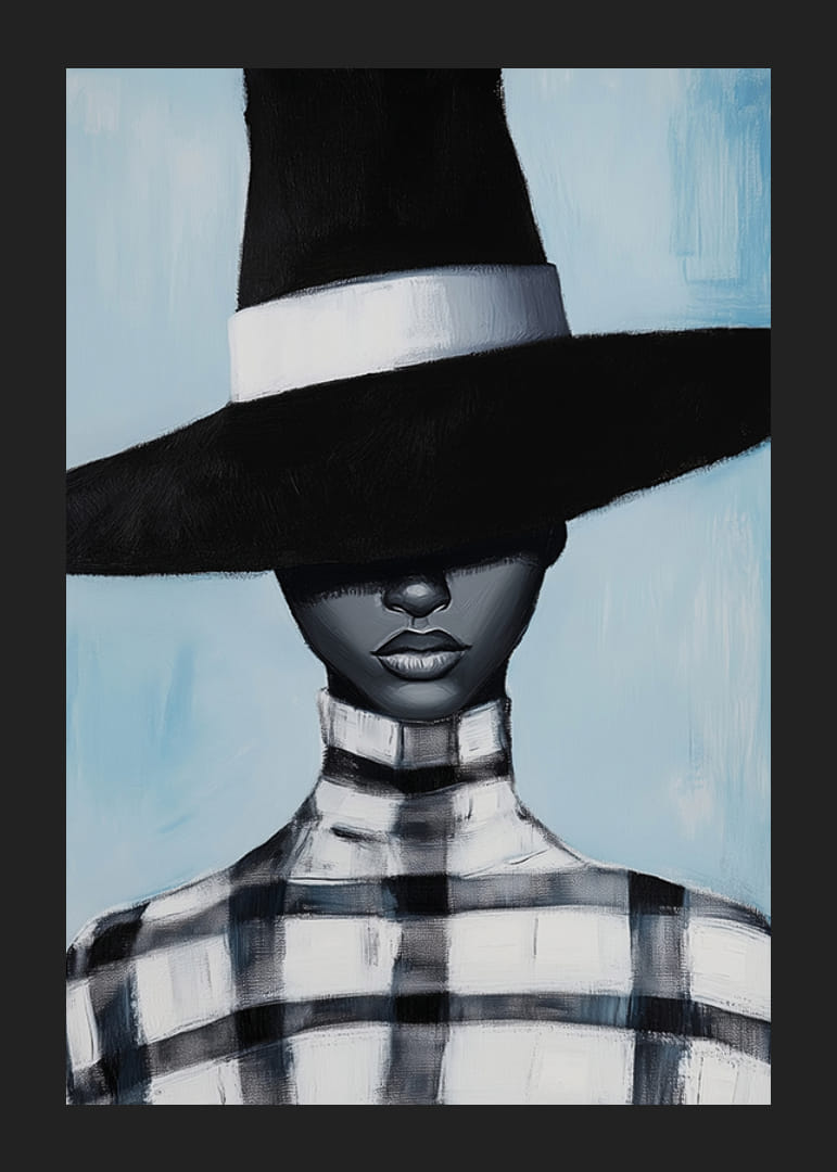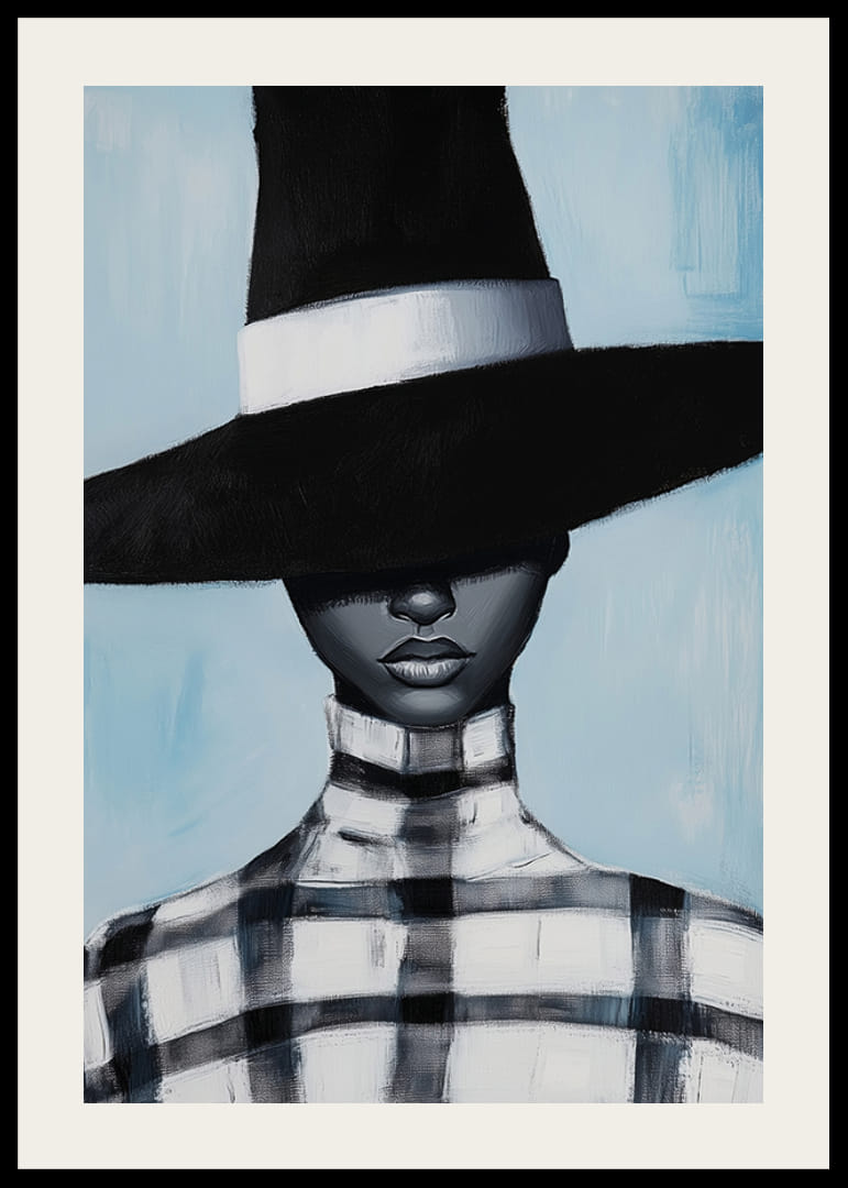 Denna poster fångar en mystisk och elegant figur vars ansikte döljs delvis av en bredbrättad hatt. Skuggor och linjer i svartvitt skapar en fascinerande kontrast mot den mjuka blå bakgrunden, vilket ger en känsla av tidlös elegans.