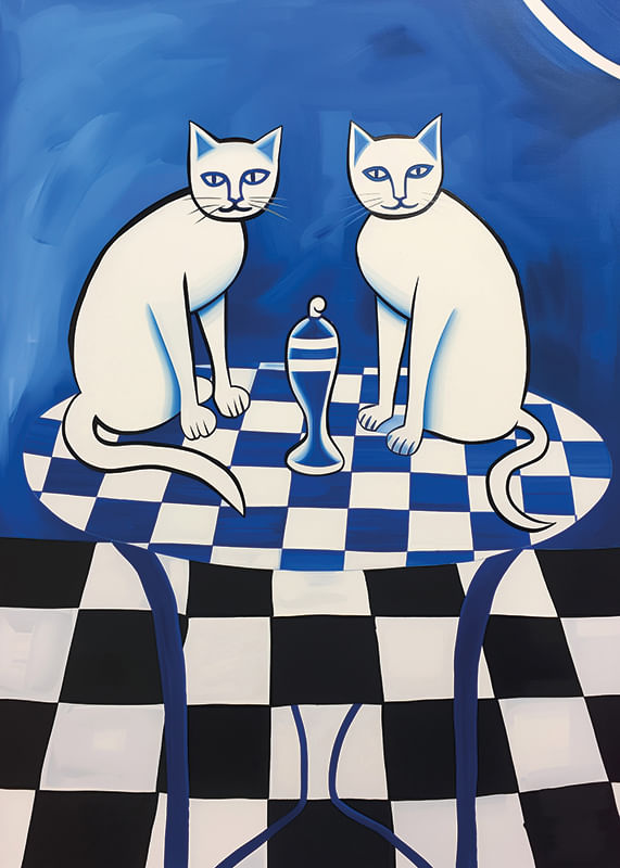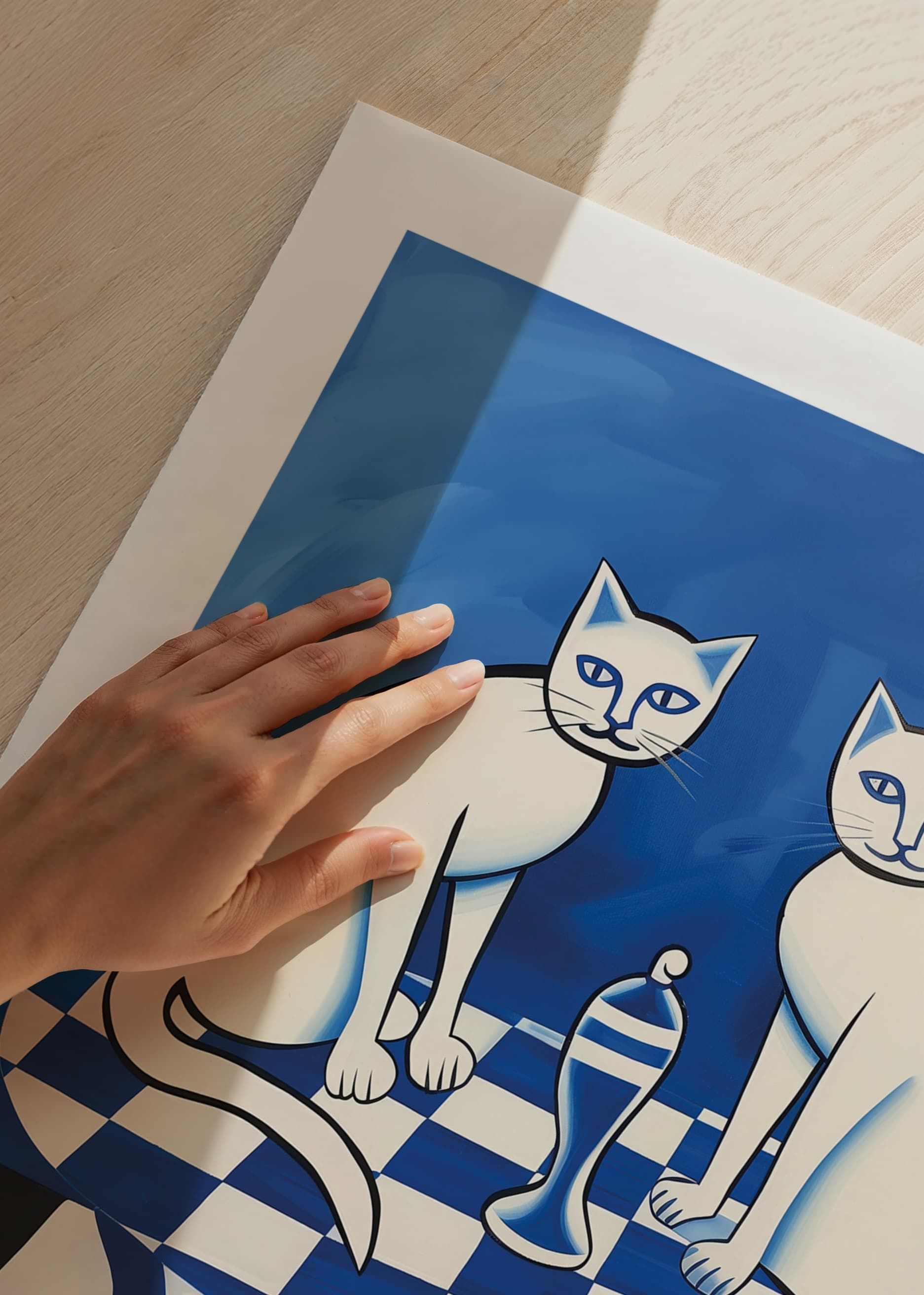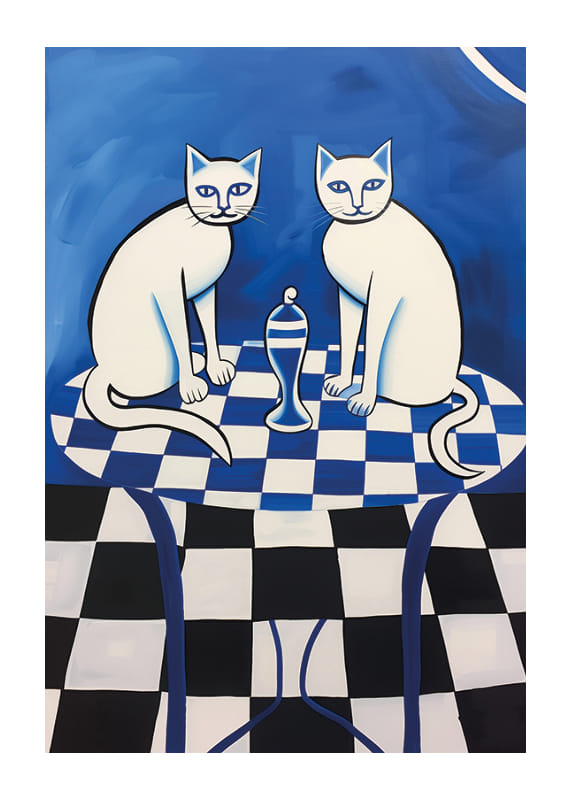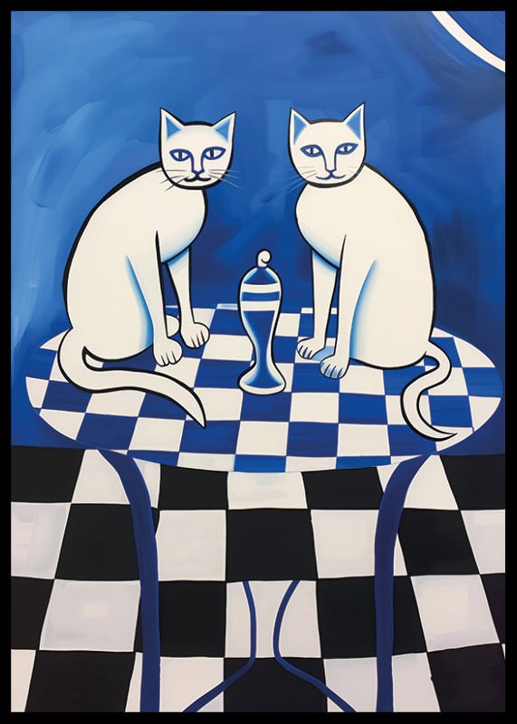 Denna fascinerande poster fångar två stiliserade vita katter som sitter majestätiskt på ett schackrutigt blå-och-vitt bord. Bakgrunden är en djupblå färg som förstärker katternas mystik och skapar en lugn atmosfär.