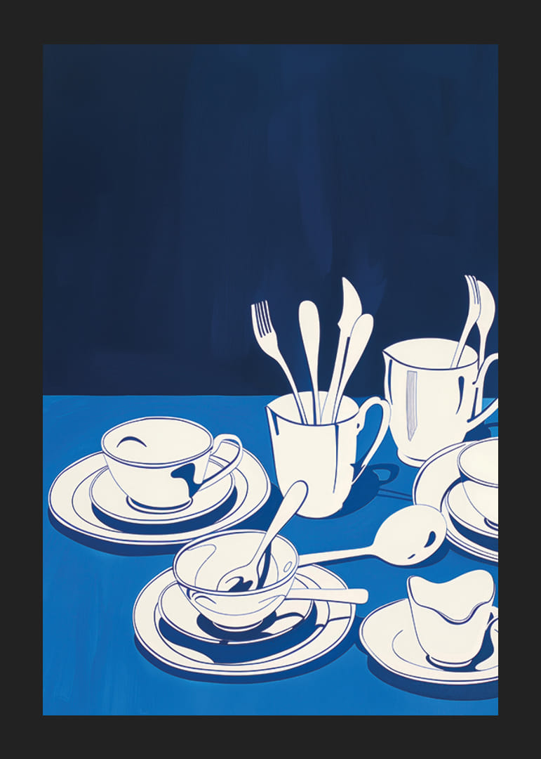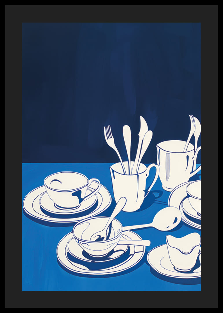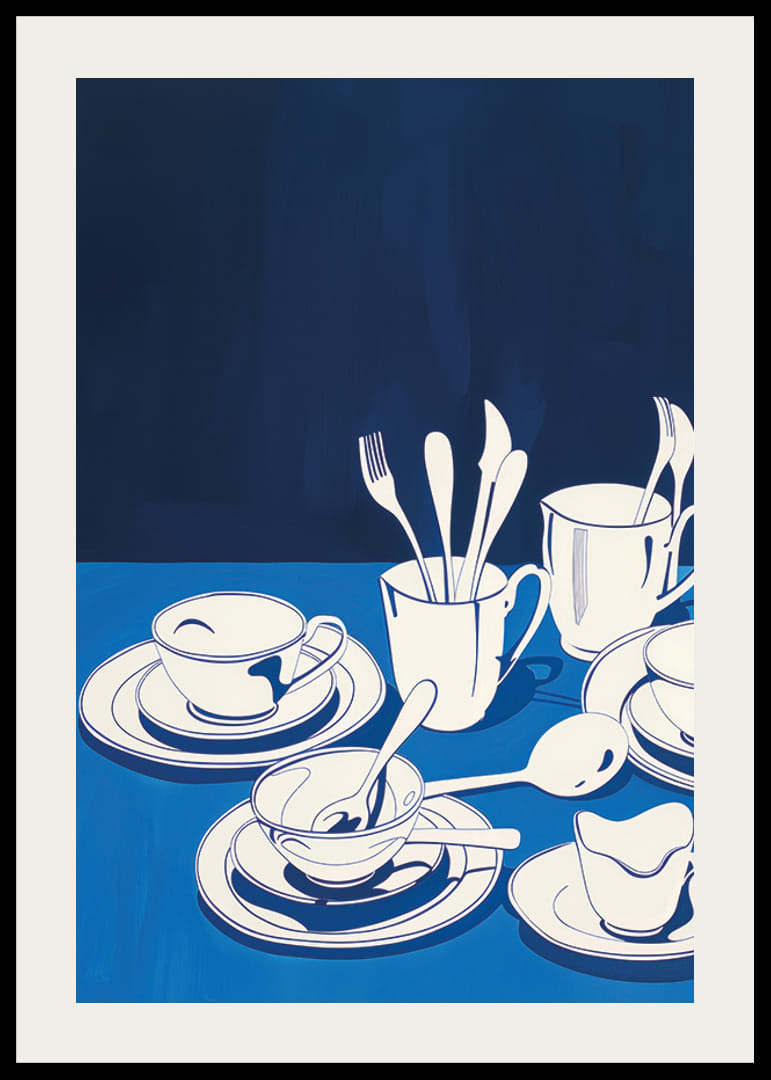 Postern har ett harmoniskt arrangemang av stiliserat porslin i vitt och blått. De enkla formerna av koppar och fat mot en djupblå bakgrund skapar en känsla av lugn och avskildhet. Fokus på det subtila samspelet mellan ljus och skugga ger postern en tidlös elegans.