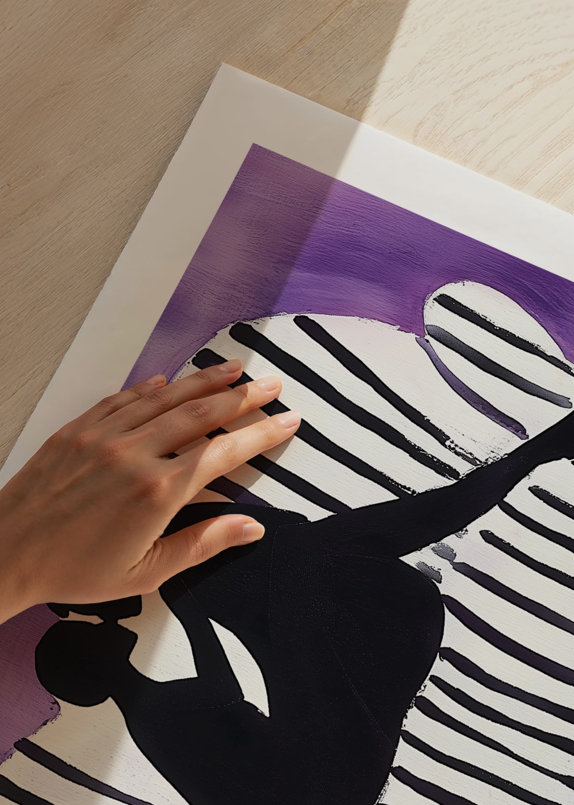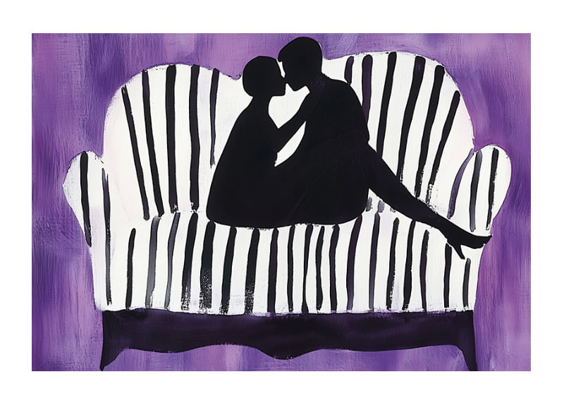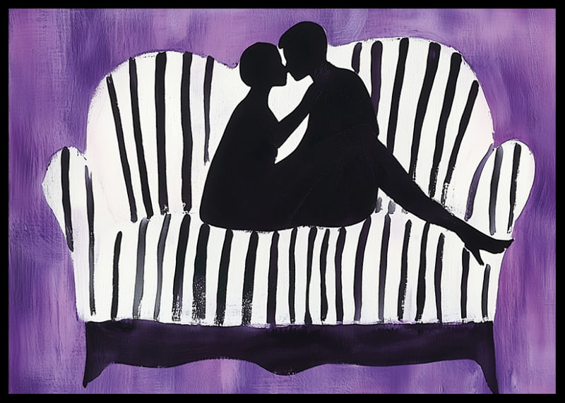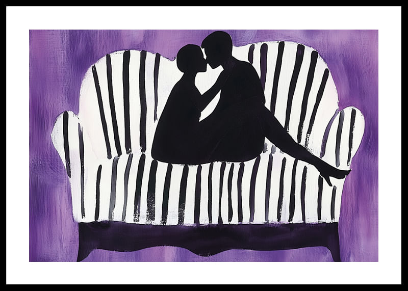 Denna poster fångar en intim stund mellan två silhuetter mot en bakgrund av djup violett. De mjuka formerna och den kontrasterande färgpaletten uppvisar både lugn och passion. Det avbildade ögonblickets tystnad och närhet förmedlar en stark känsla av mystik och romantik.