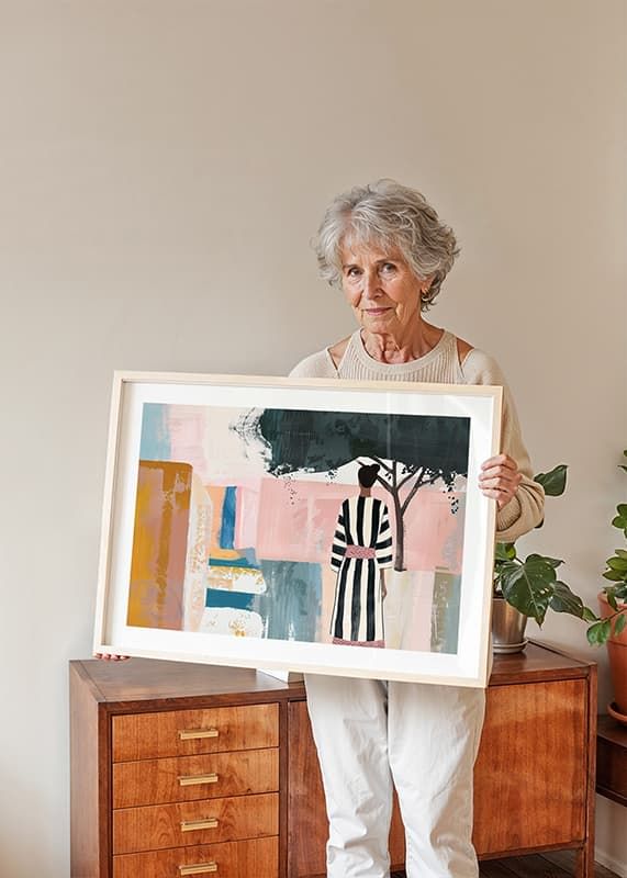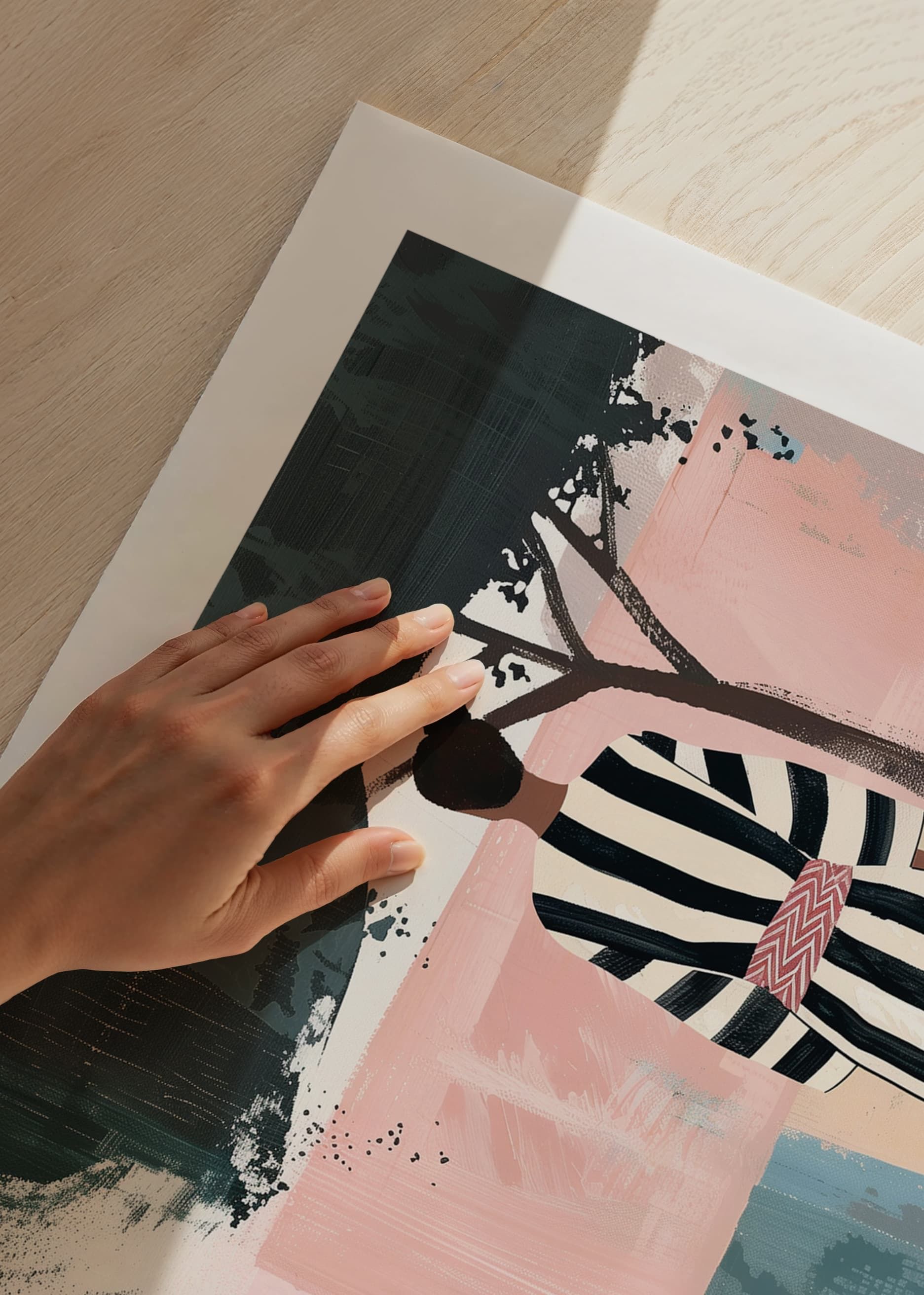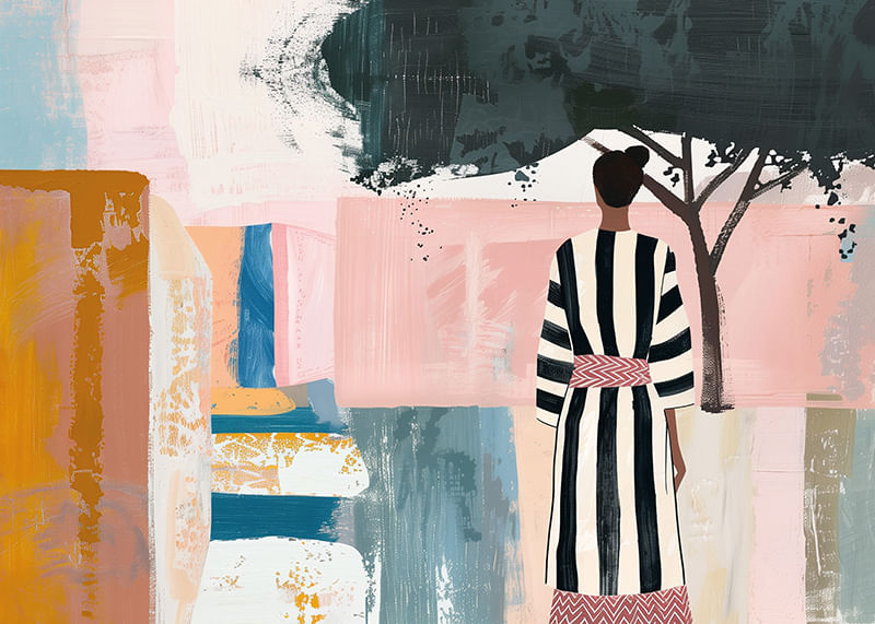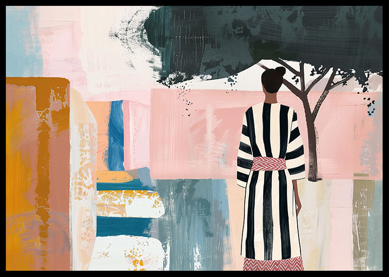 Denna poster fångar en unik blandning av abstrakt konst och stillhet. En kvinna iklädd en randig klänning står vänd mot ett färgglatt landskap där pastelltoner och mörka nyanser harmoniserar perfekt. Trädet bredvid henne skapar en känsla av trygghet och ro.