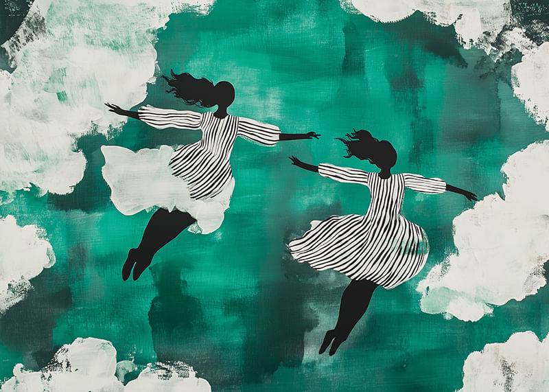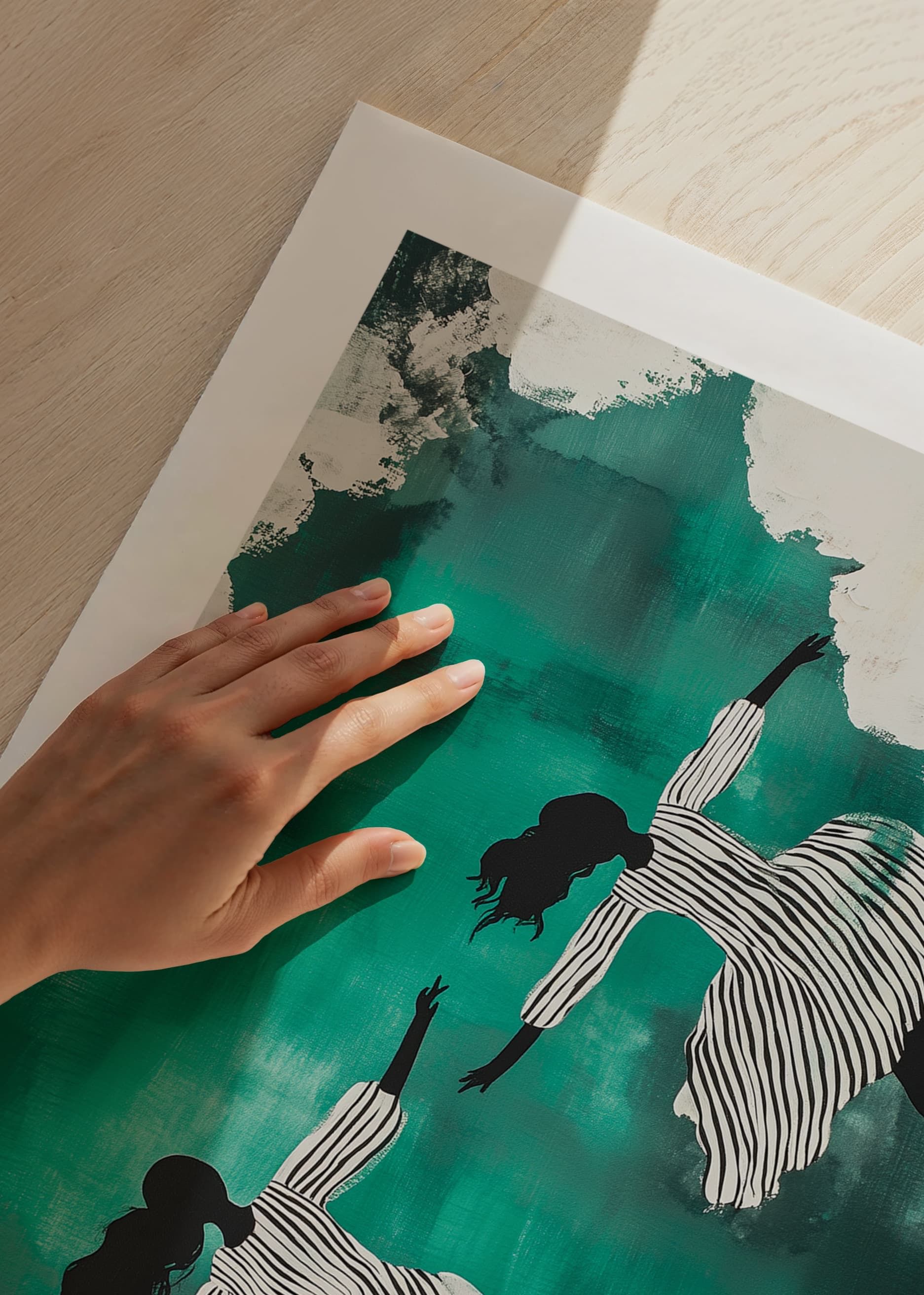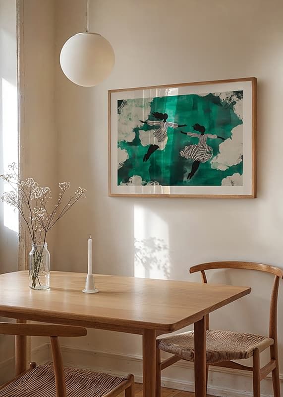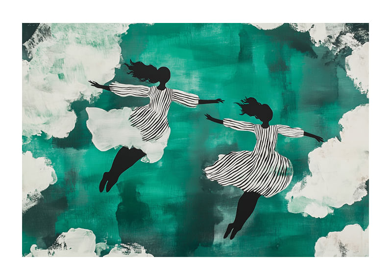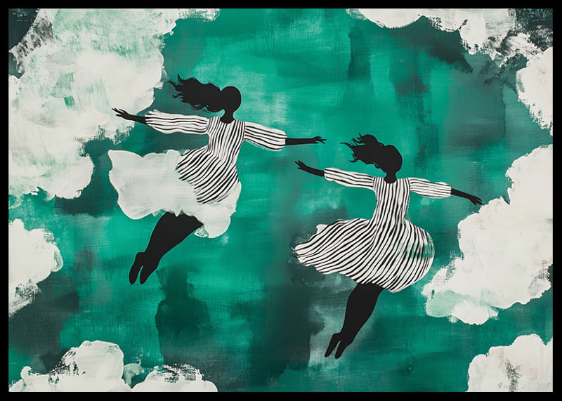 Denna poster fångar ett magiskt ögonblick där två stiliserade silhuetter svävar graciöst bland mjuka vita moln mot en djup grön bakgrund. Ränderna på kläderna kontrasterar elegant mot den pastellgröna himlen, vilket skapar en känsla av frihet och rörelse.