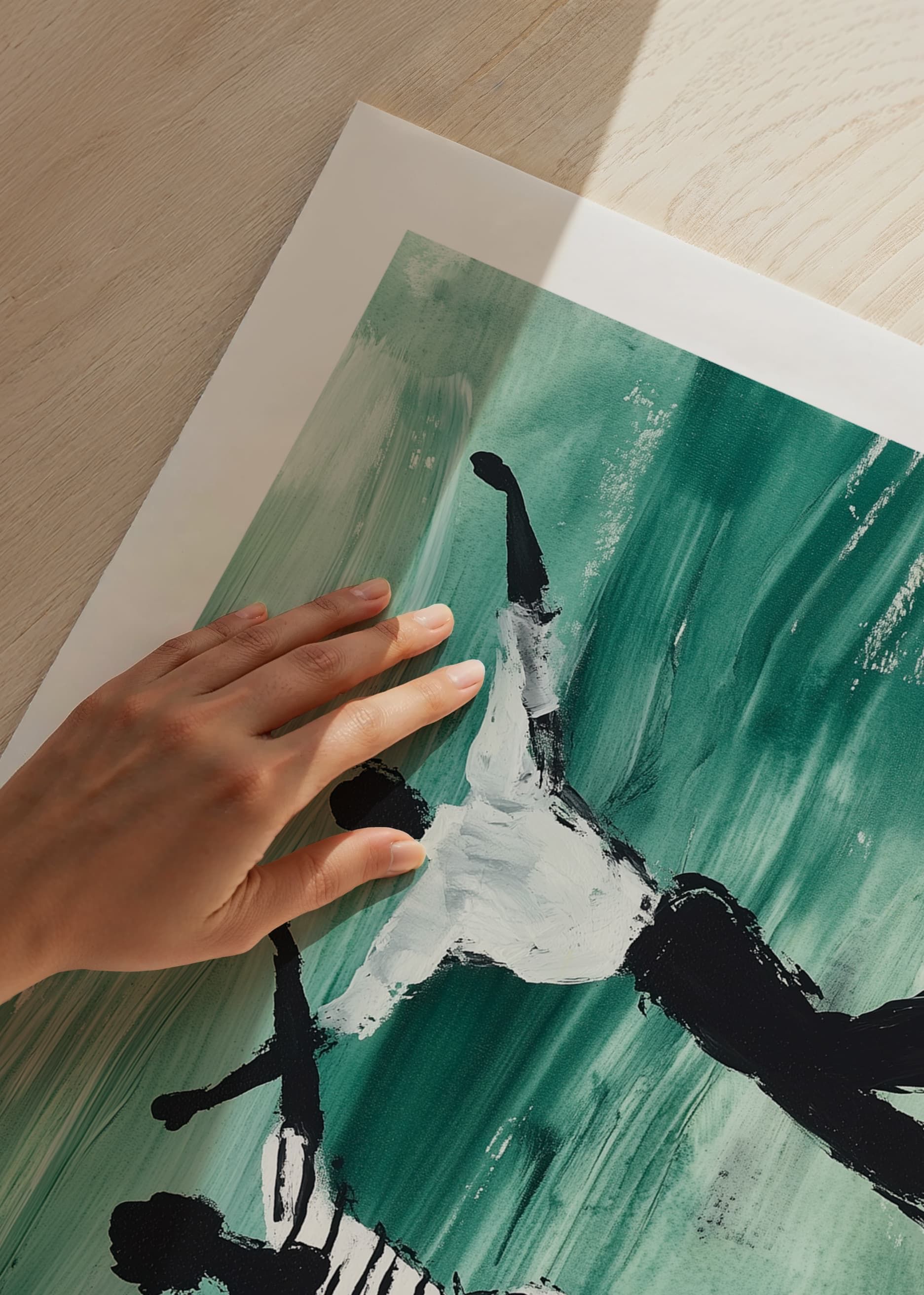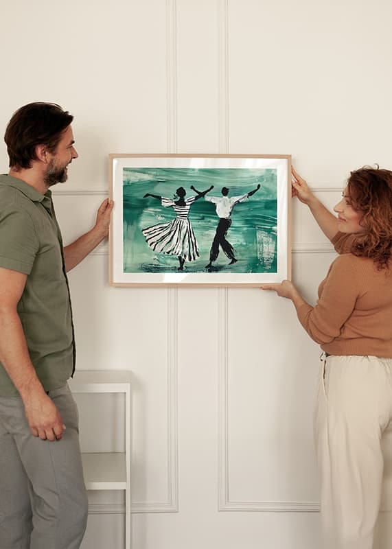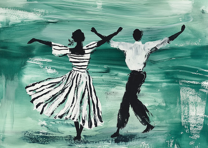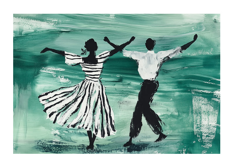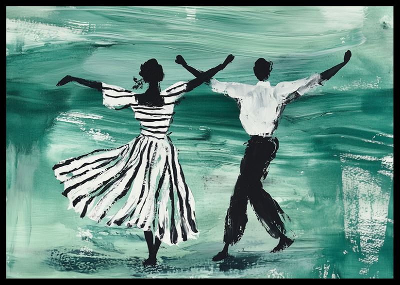 Denna poster fångar en elegant dans genom en konstnärlig representation i gröna och svarta toner. De två figurerna, klädda i randiga kläder, rör sig fritt och harmoniskt över den smaragdgröna bakgrunden, vilket skapar en känsla av frihet och livsglädje.